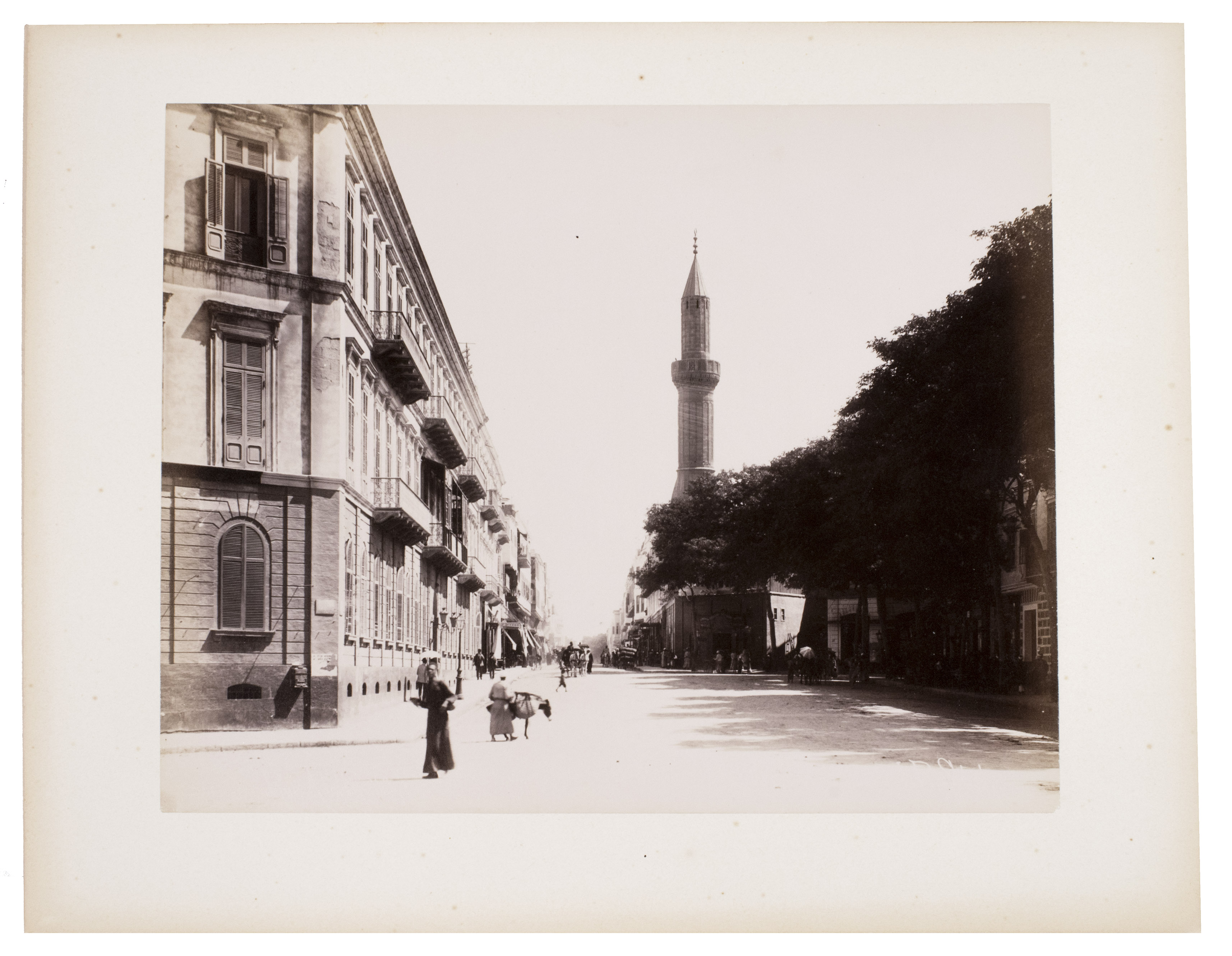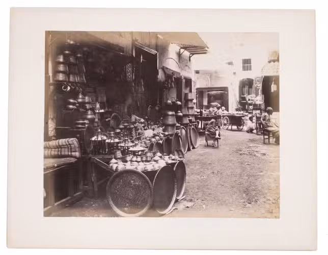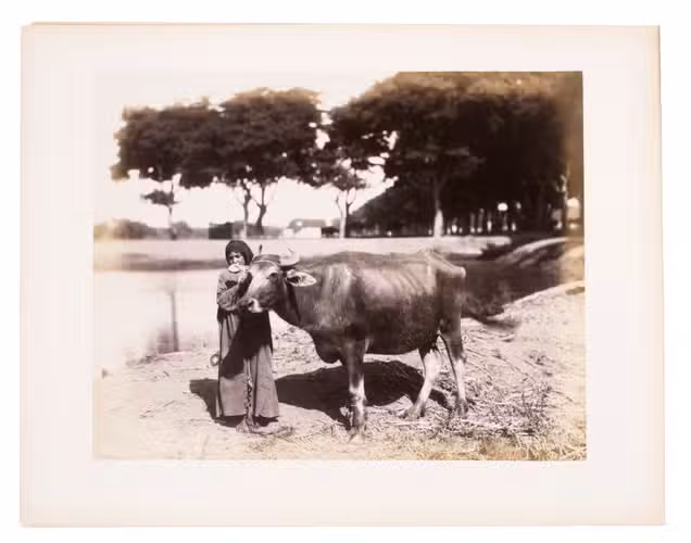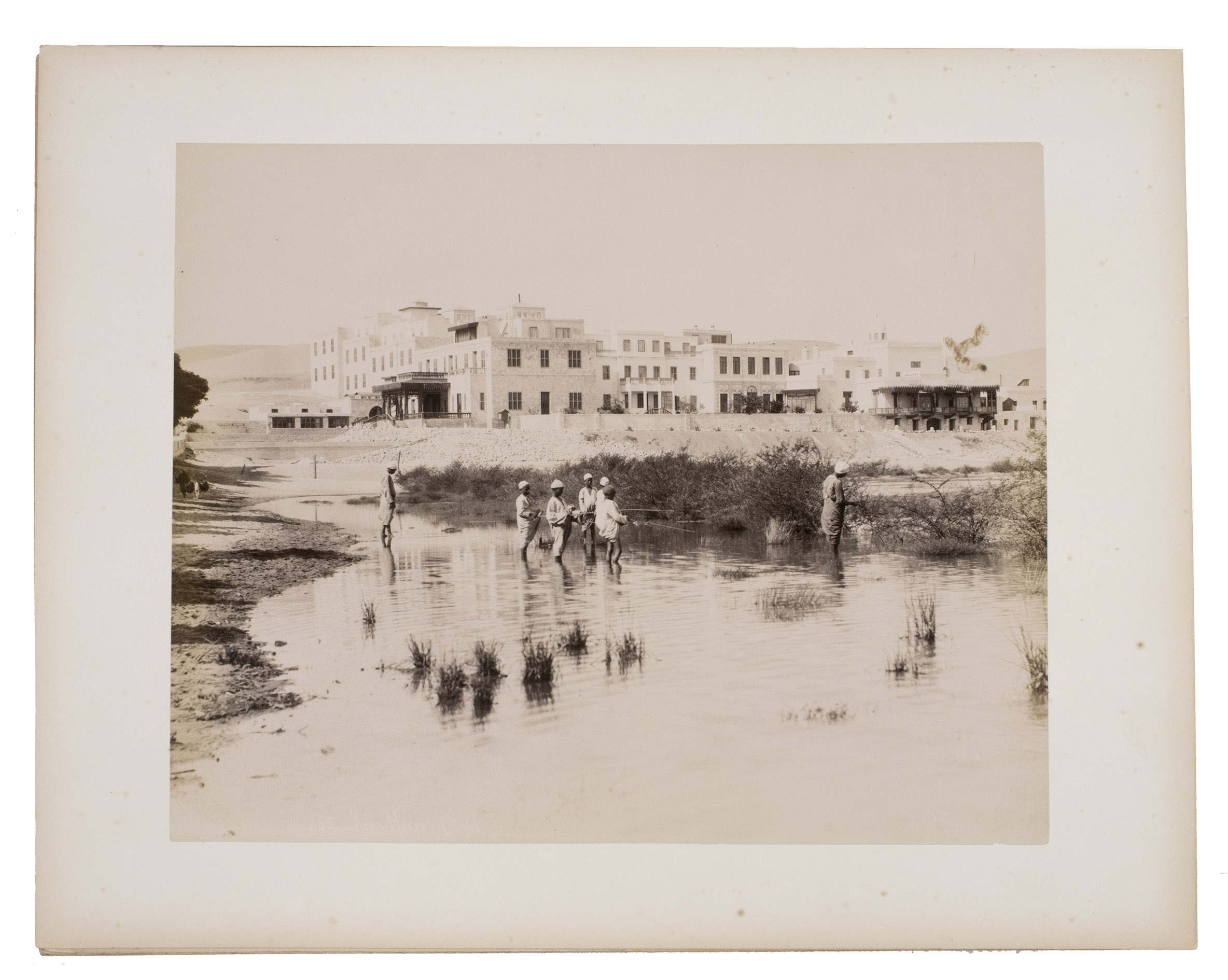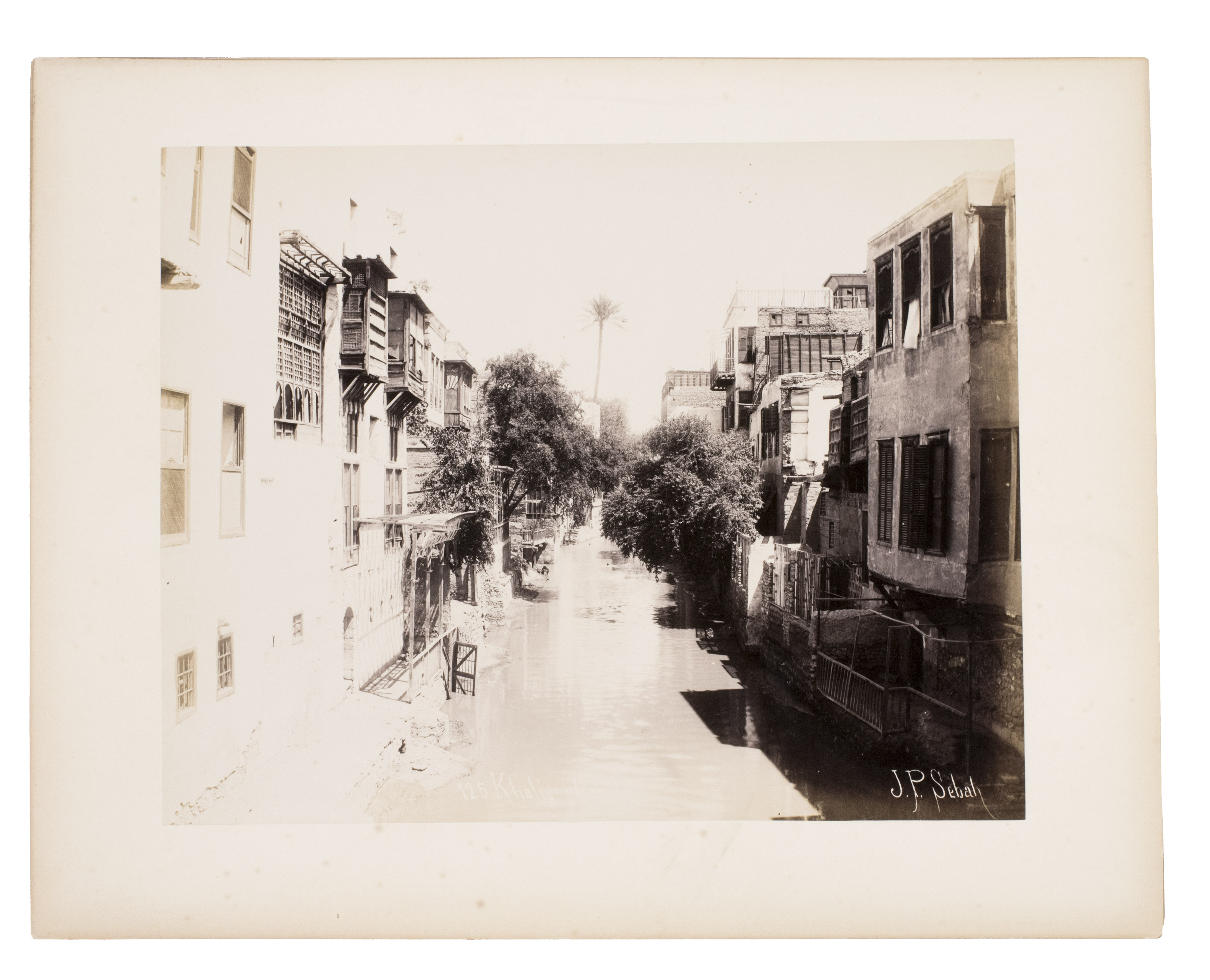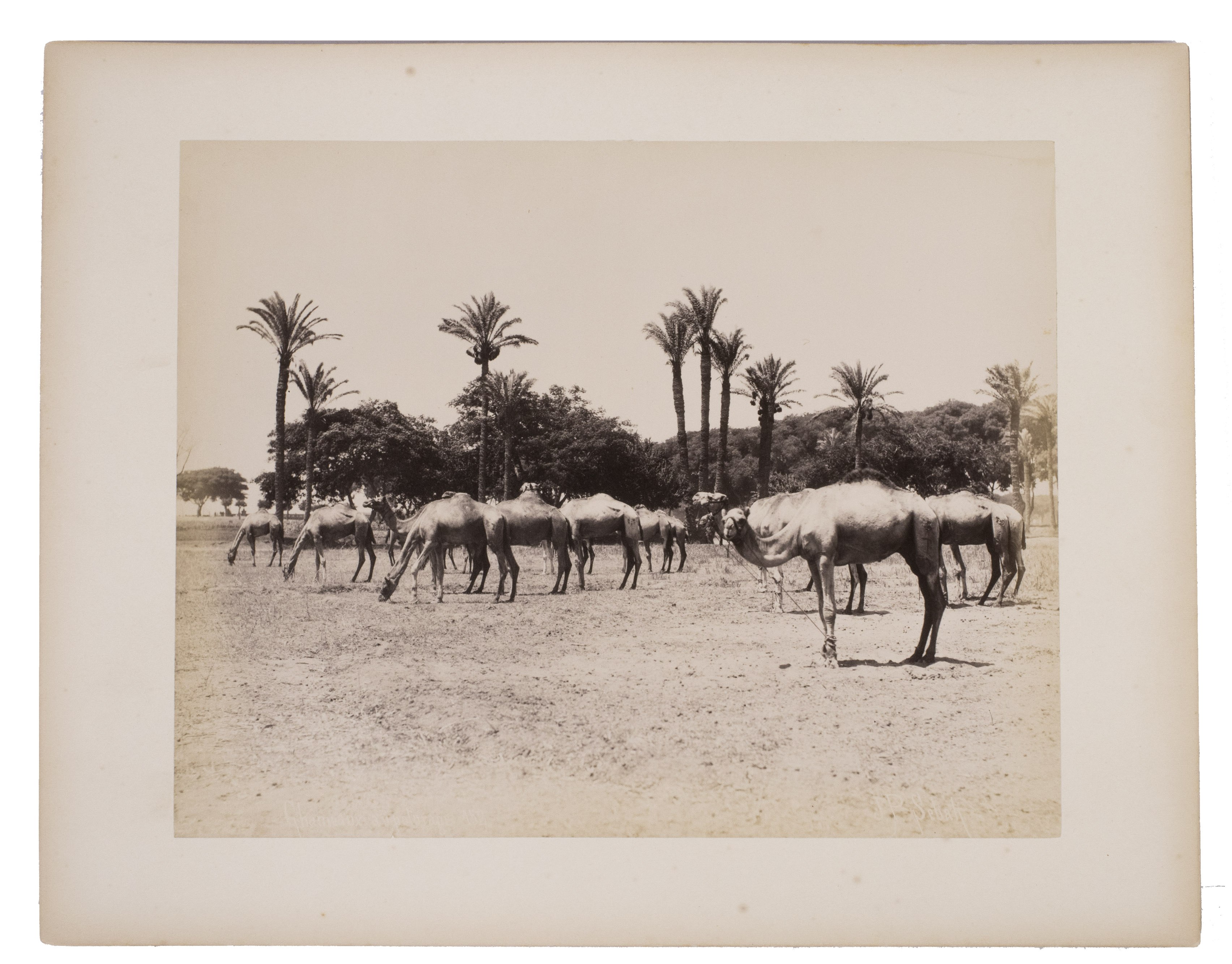 Sébah continued the business of his father Pascal Sébah (1823-1886), one of the first photographers working in Egypt. Pascal rose to prominence because of his well-organized compositions, careful lighting and quality of his prints. The majority of his photographs are of tourist destinations and locals. Jean Pascal inherited his father's good eye, but was more interested in depicting lesser known locations. His photos of people also appear more spontaneous. The present collection includes photographs of El-Souroughieh street and the Khalig canal in Cairo, the Virgin Mary's tree in Matariya, a local with a buffalo, a group of seated men in a mosque, a sugarcane market, locals working on a sugarcane field, a group of boys fishing and the hustle and bustle along the Nile.