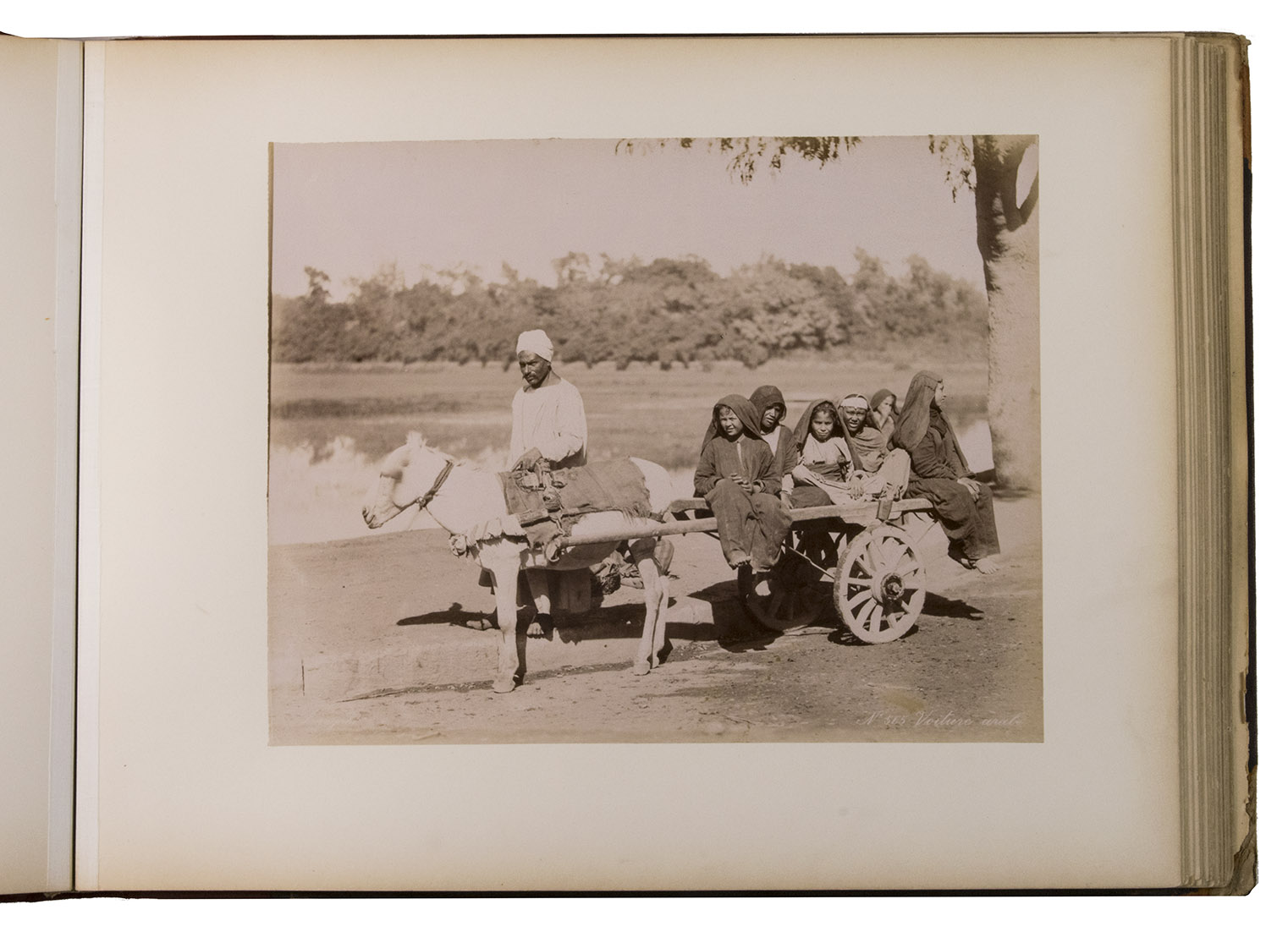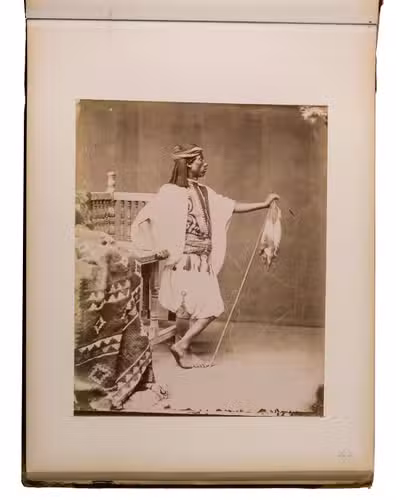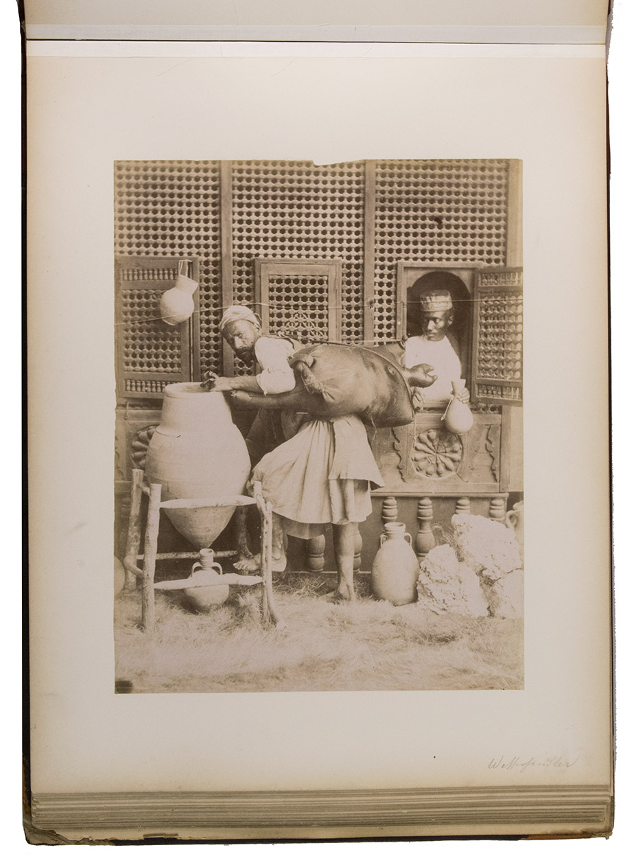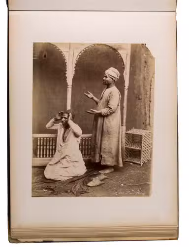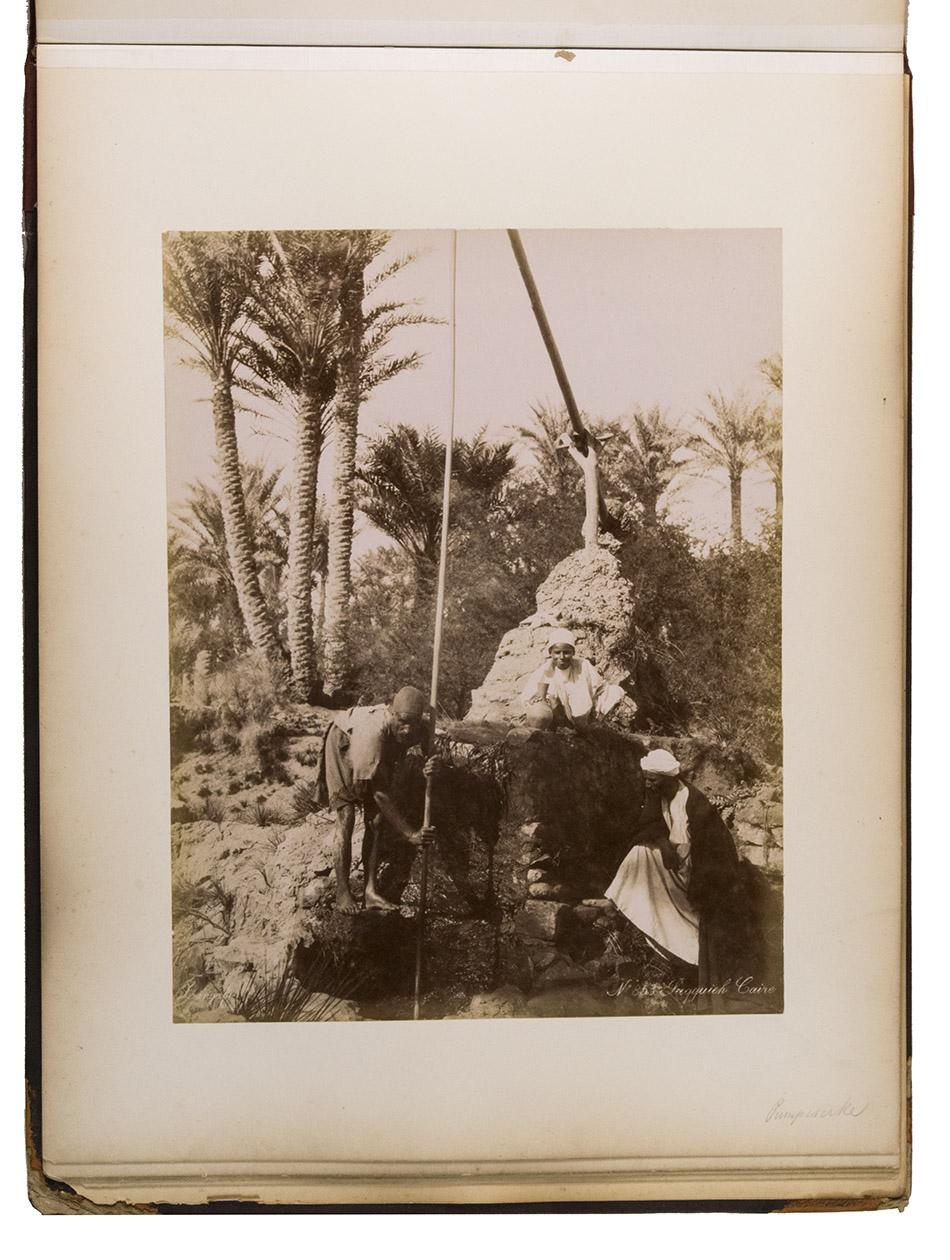A large German album with 34 albumen prints of Egypt. The Greek brothers G. and C. Zangaki were photographers who worked in Egypt in the second half of the 19th century. Due to increased tourism to this region after the opening of the Suez Canal, there was a large demand for souvenir photographs. Photographers like the Zangaki brothers, as well as Sebah & Joallier, catered to this. The Zangakis were among the first commercial photographers to produce large-scale images of Egypt. They travelled through the country with a portable darkroom to capture high-quality images of famous monuments and daily life, though the latter were usually posed. These images were then printed and sold to tourists, either separately or compiled into albums. According to John Hannavy, the brothers "produced some of the finest images of late Victorian Egypt".