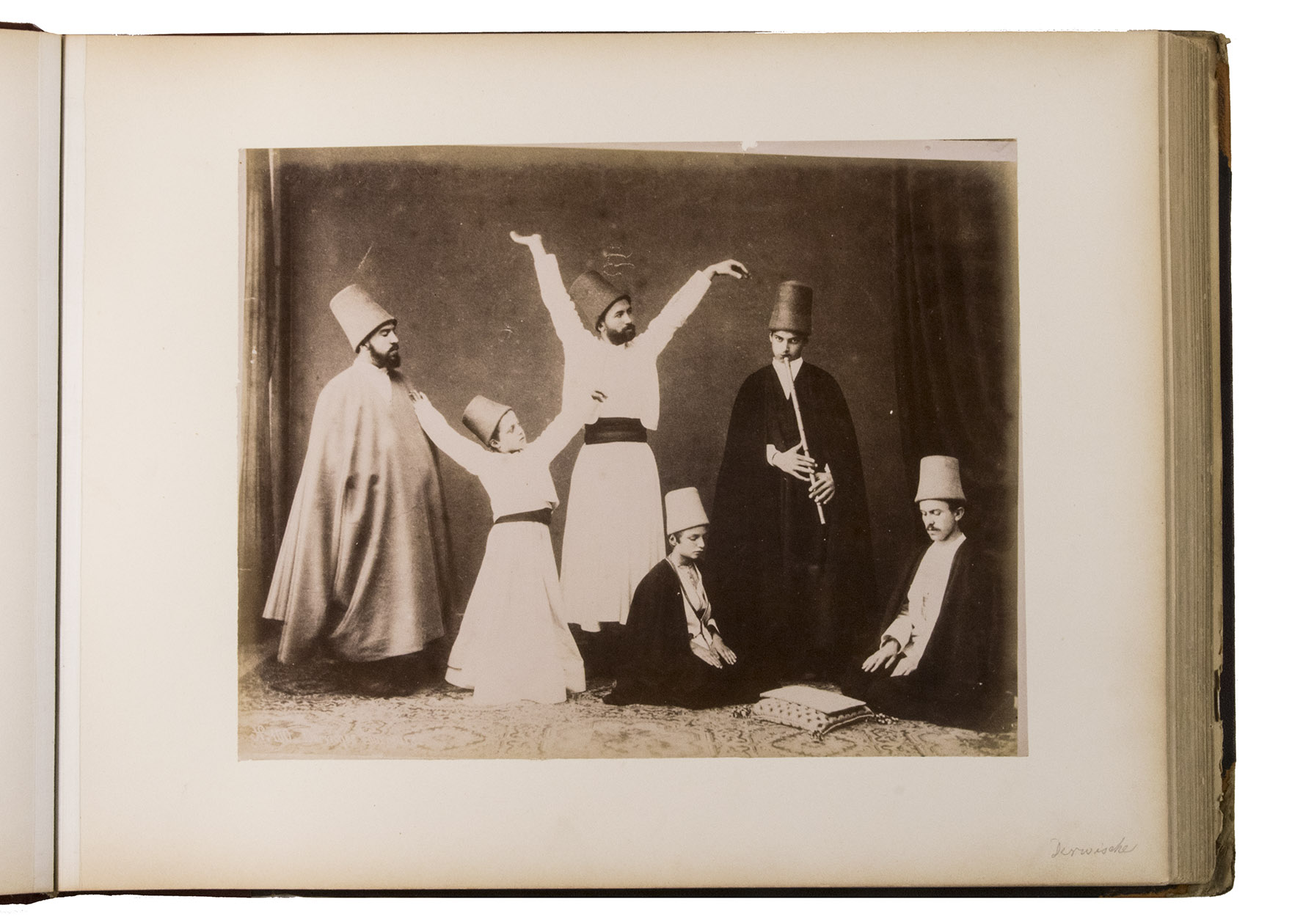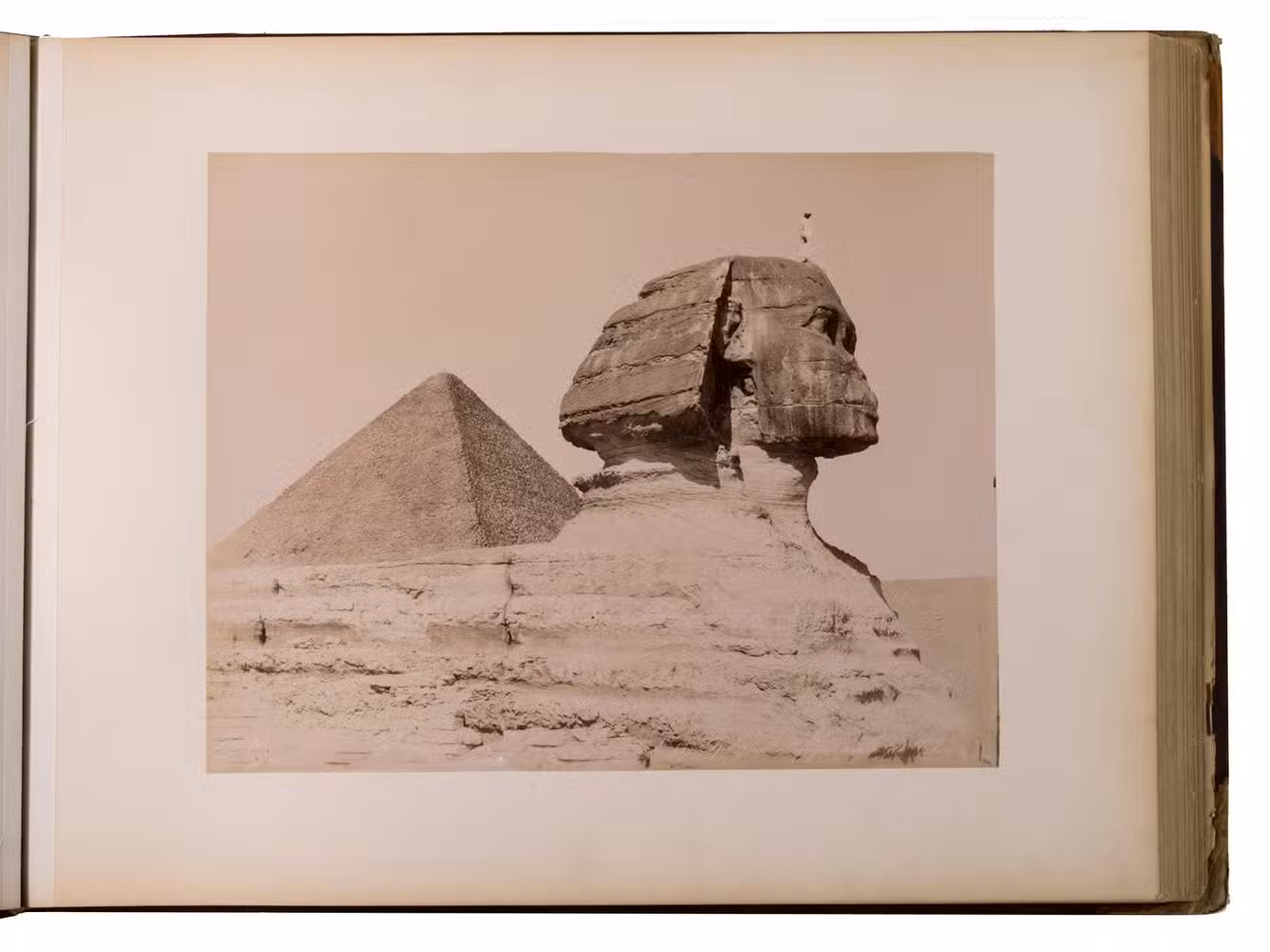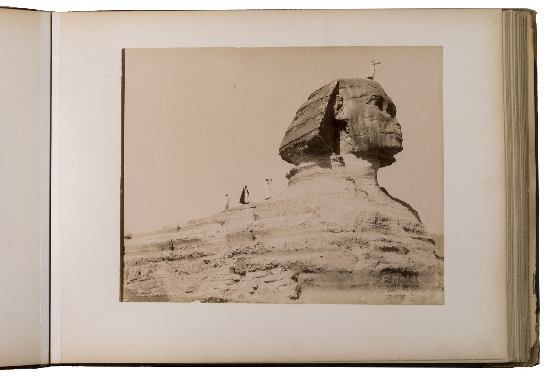 The 34 photographs include: the great pyramid, Cairo and the Nile, dervishes and other exotic looking locals, Egyptians standing on top of the sphinx, obeliscs, the Ramesseum, Karnak temple, the temple of Dendera, the Great Pyramid, Egyptians climbing the pyramid, the mosque and tomb of Muhammad Ali, Saqqara and many others.