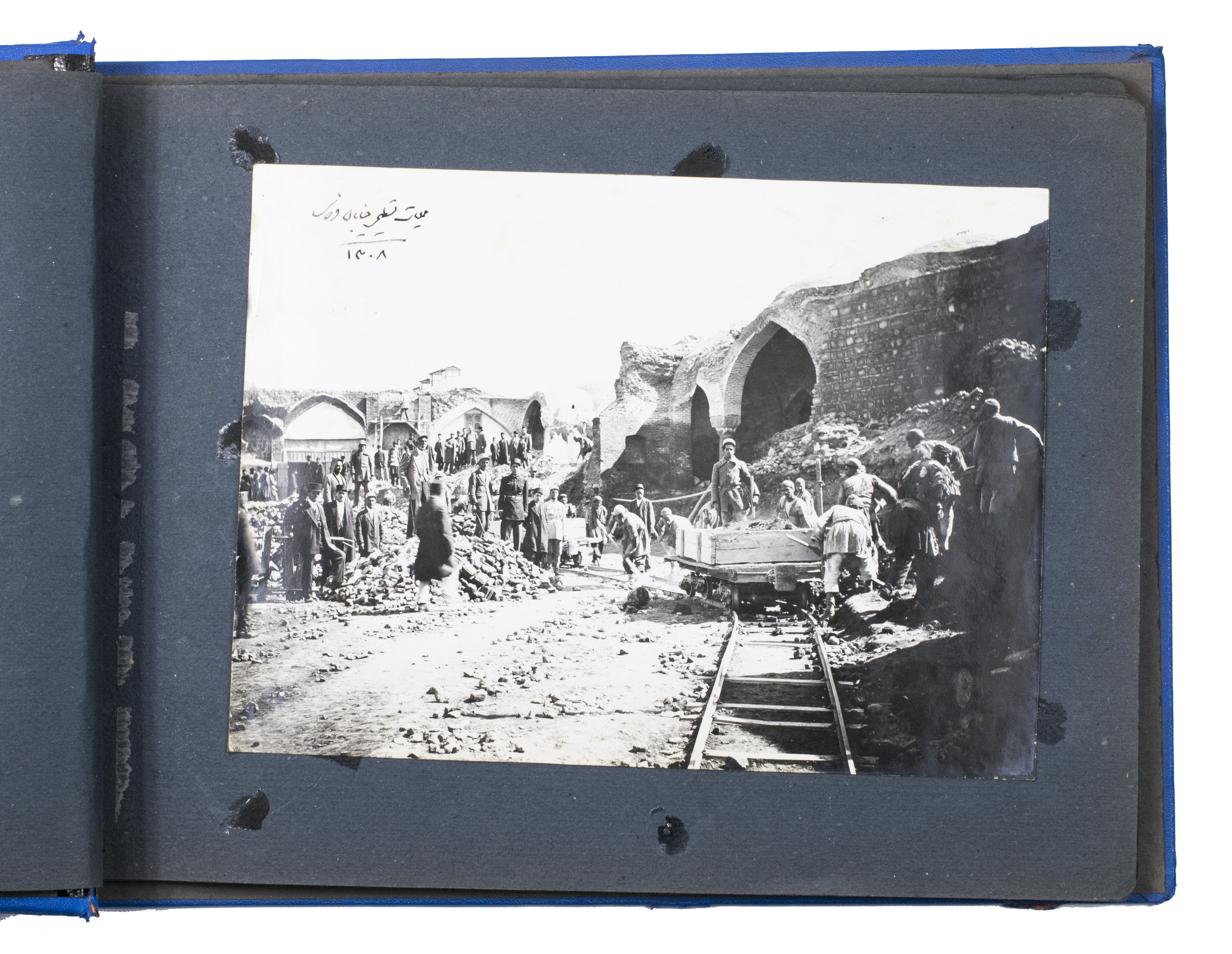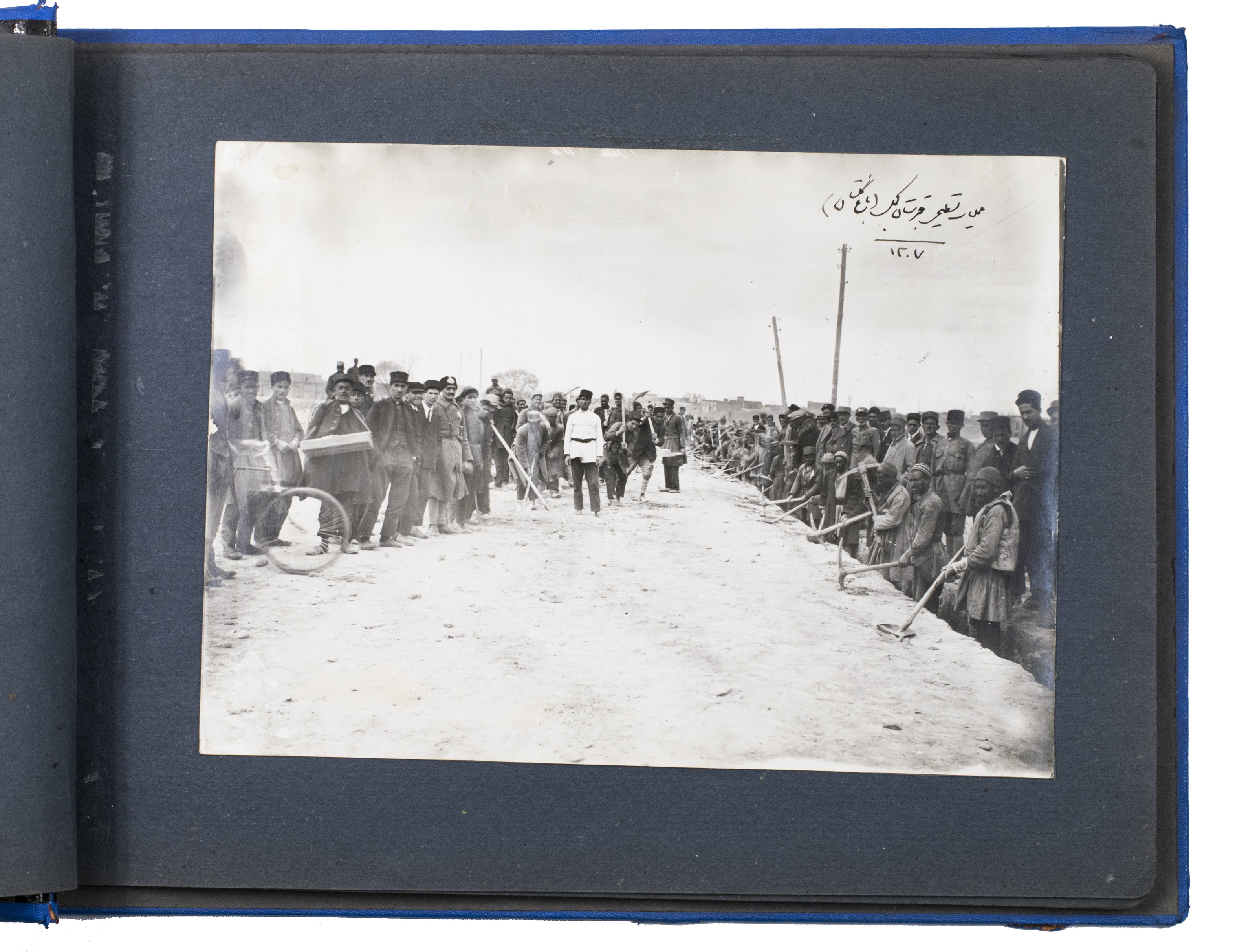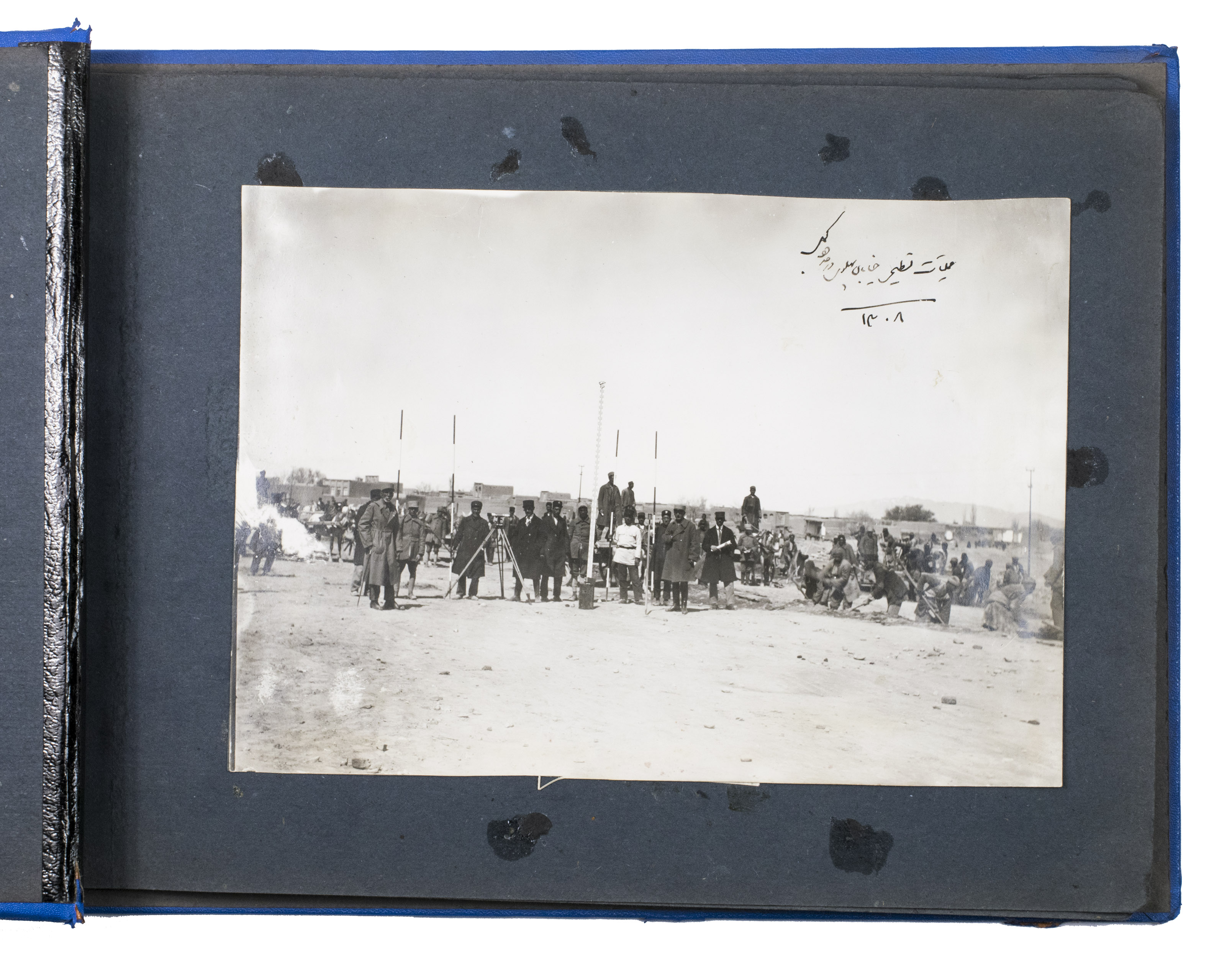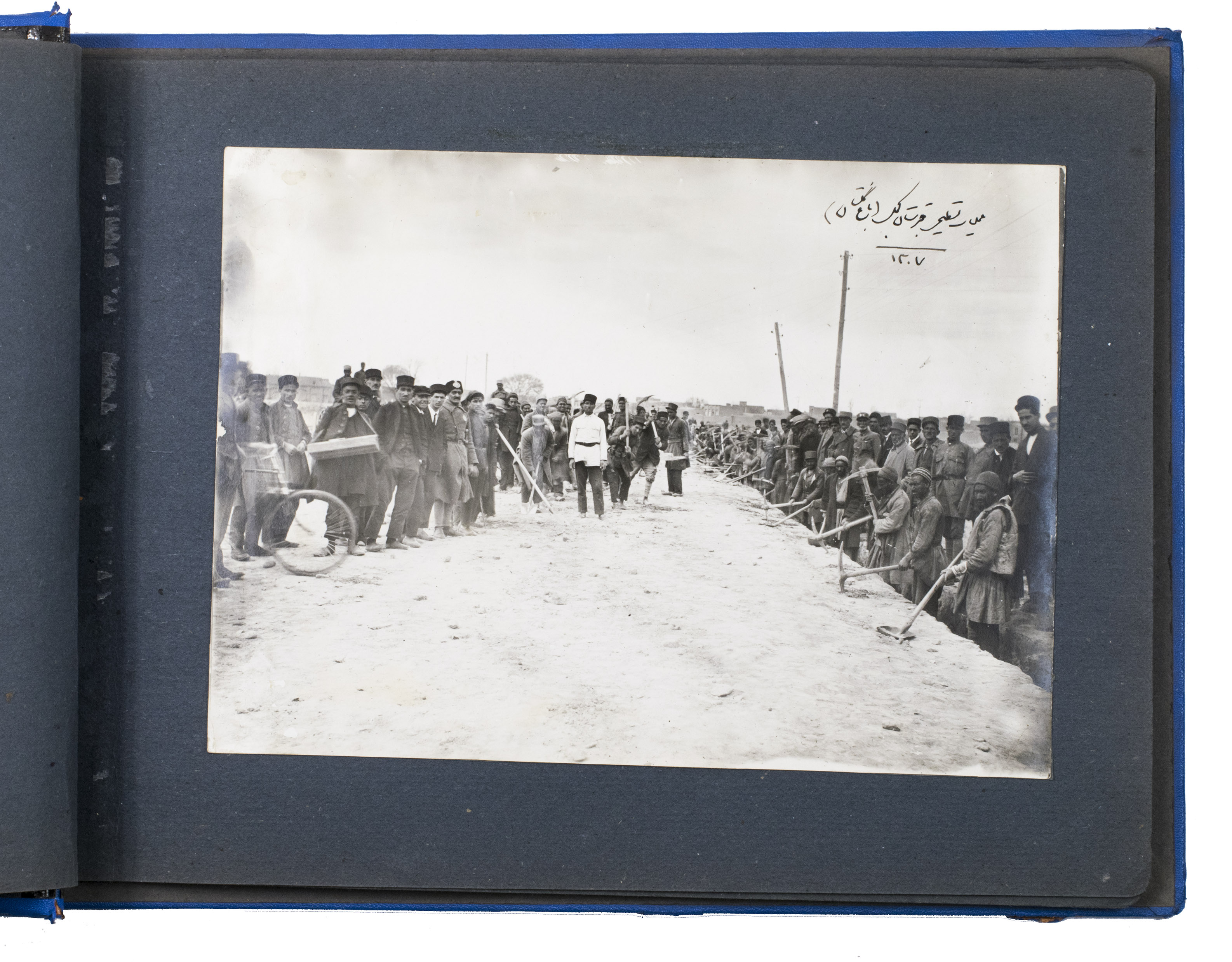 With some glue staining to the dark blue paper on several pages. A few photographs show minor marginal wear, not affecting the images themselves. The final photograph is not mounted on the album paper but on a separate piece of card and is loosely inserted. Otherwise in good condition. Cf. Tofigh Kouzehkanani & Zelef, "Towards extroverted urbanism: Haussmannization and building a new urban identity in Tabriz (1925-1942)", ITU AZ, 22, 3 (2025), pp. 559-577