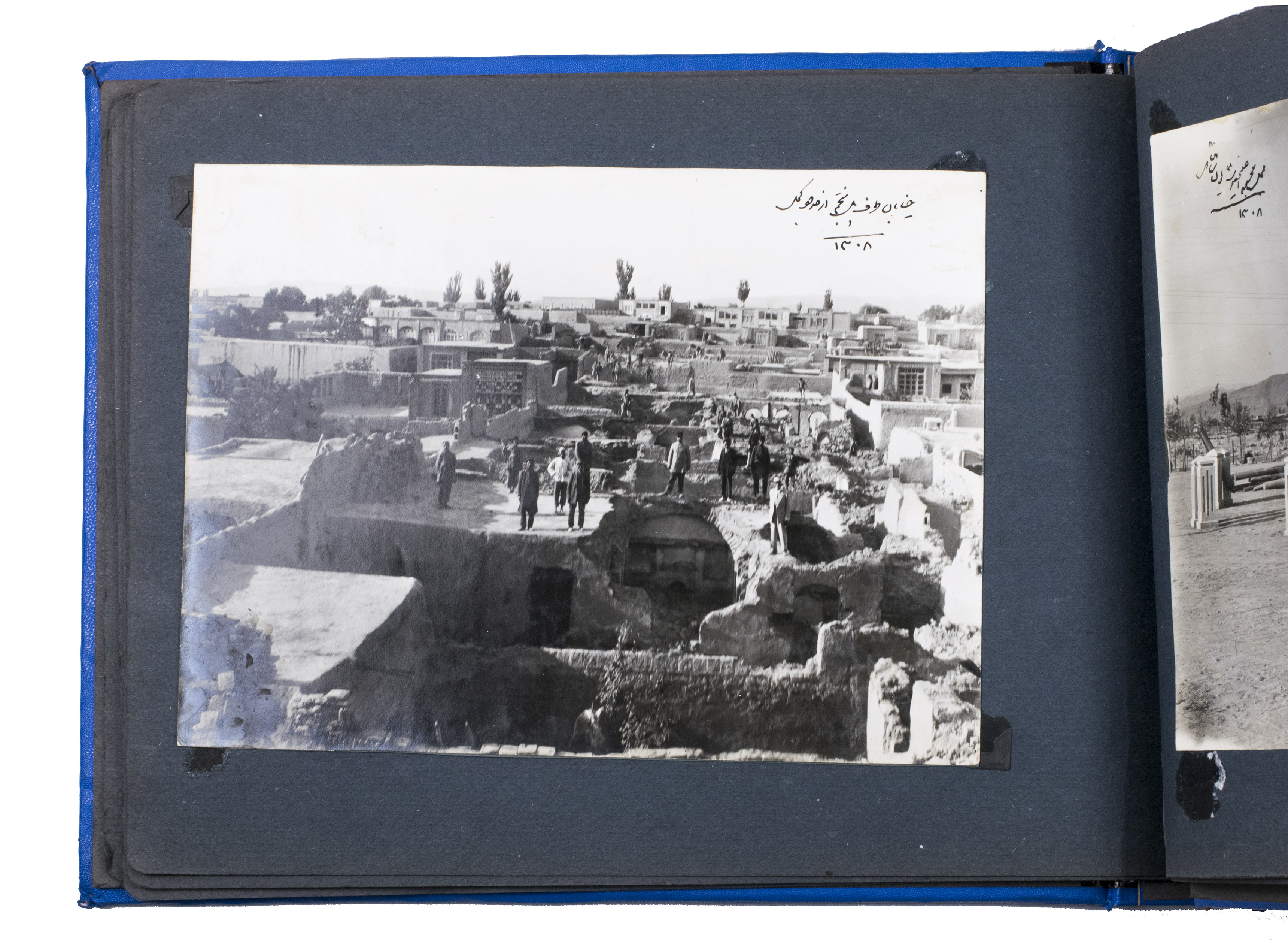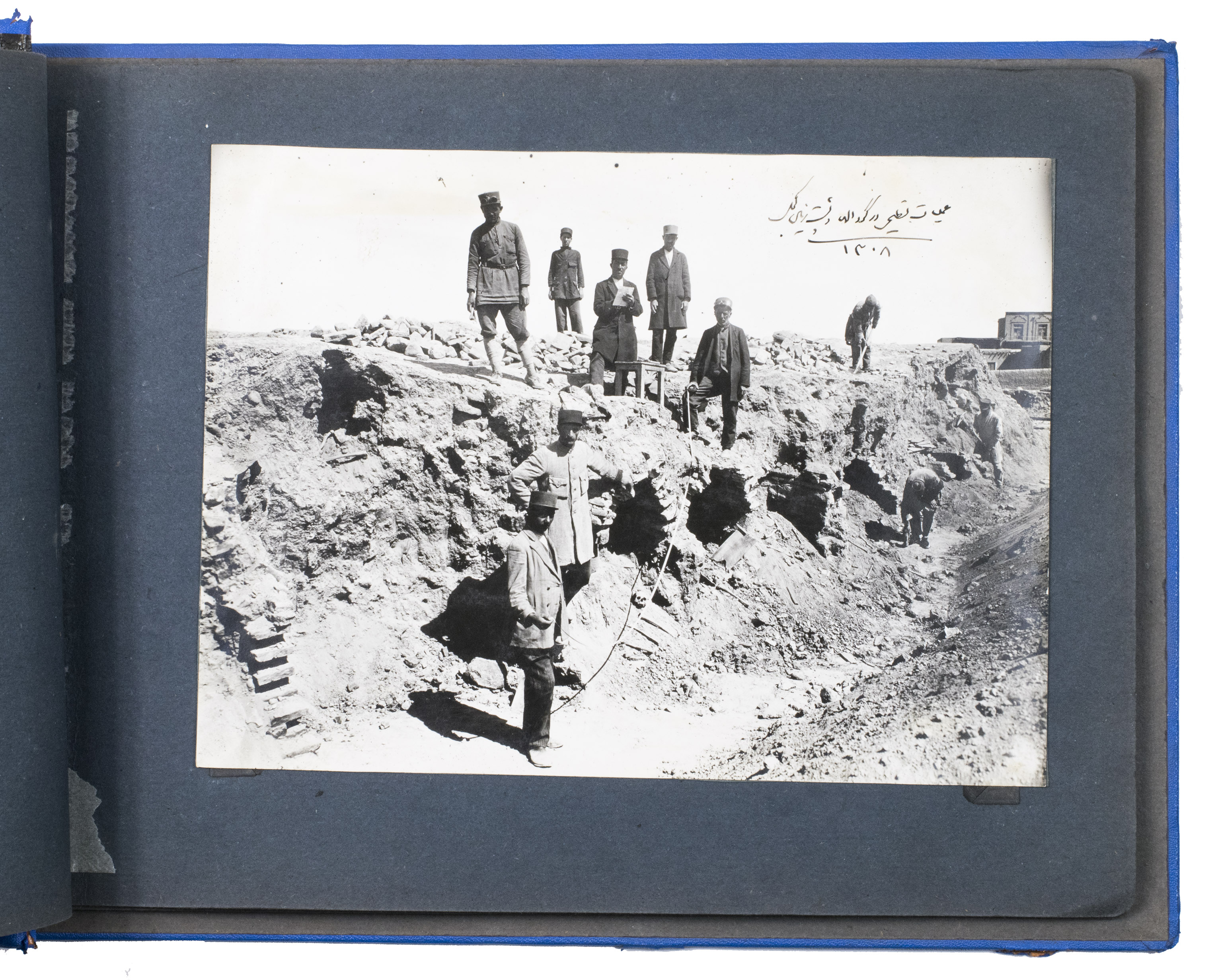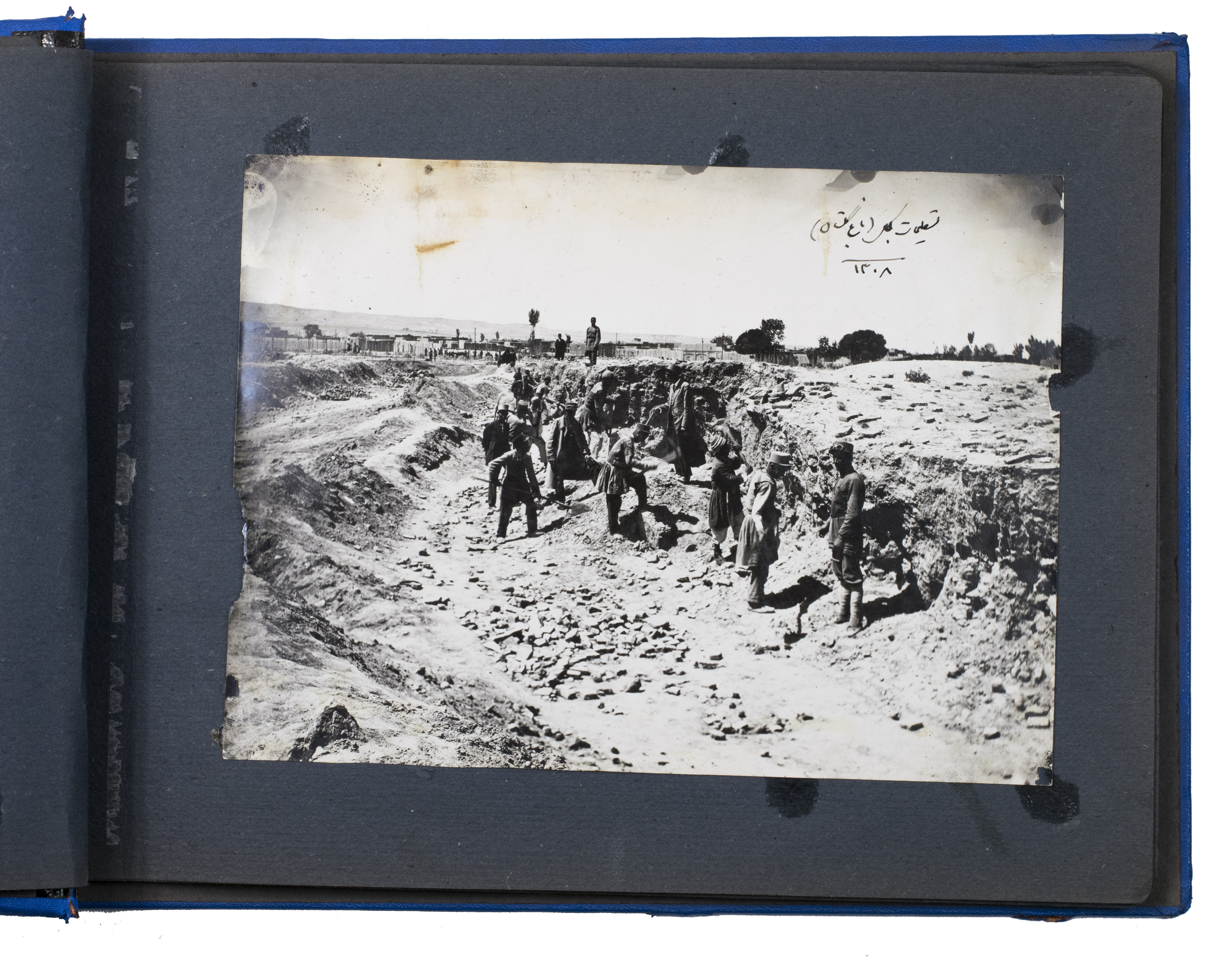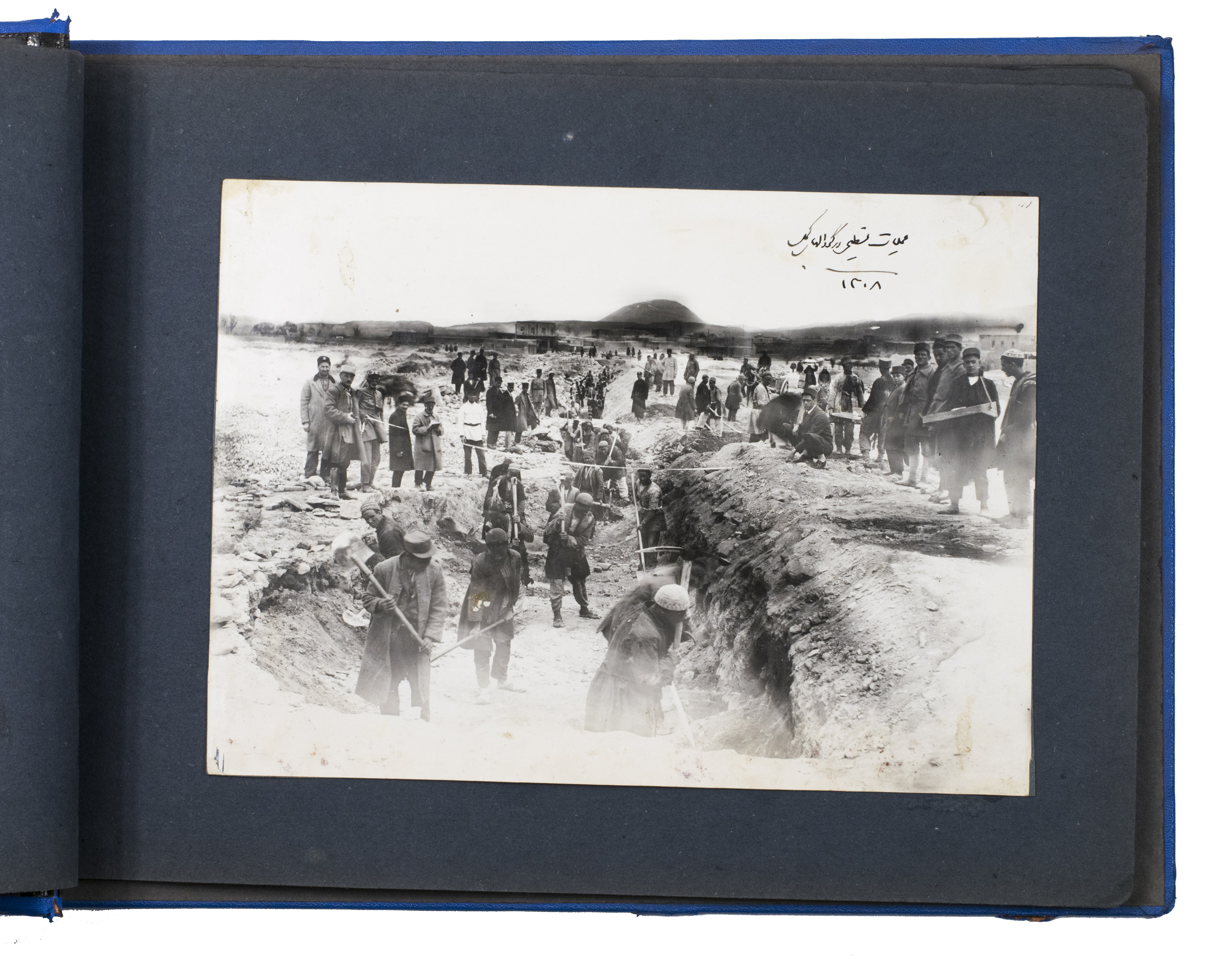 With some glue staining to the dark blue paper on several pages. A few photographs show minor marginal wear, not affecting the images themselves. The final photograph is not mounted on the album paper but on a separate piece of card and is loosely inserted. Otherwise in good condition. Cf. Tofigh Kouzehkanani & Zelef, "Towards extroverted urbanism: Haussmannization and building a new urban identity in Tabriz (1925-1942)", ITU AZ, 22, 3 (2025), pp. 559-577