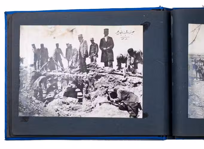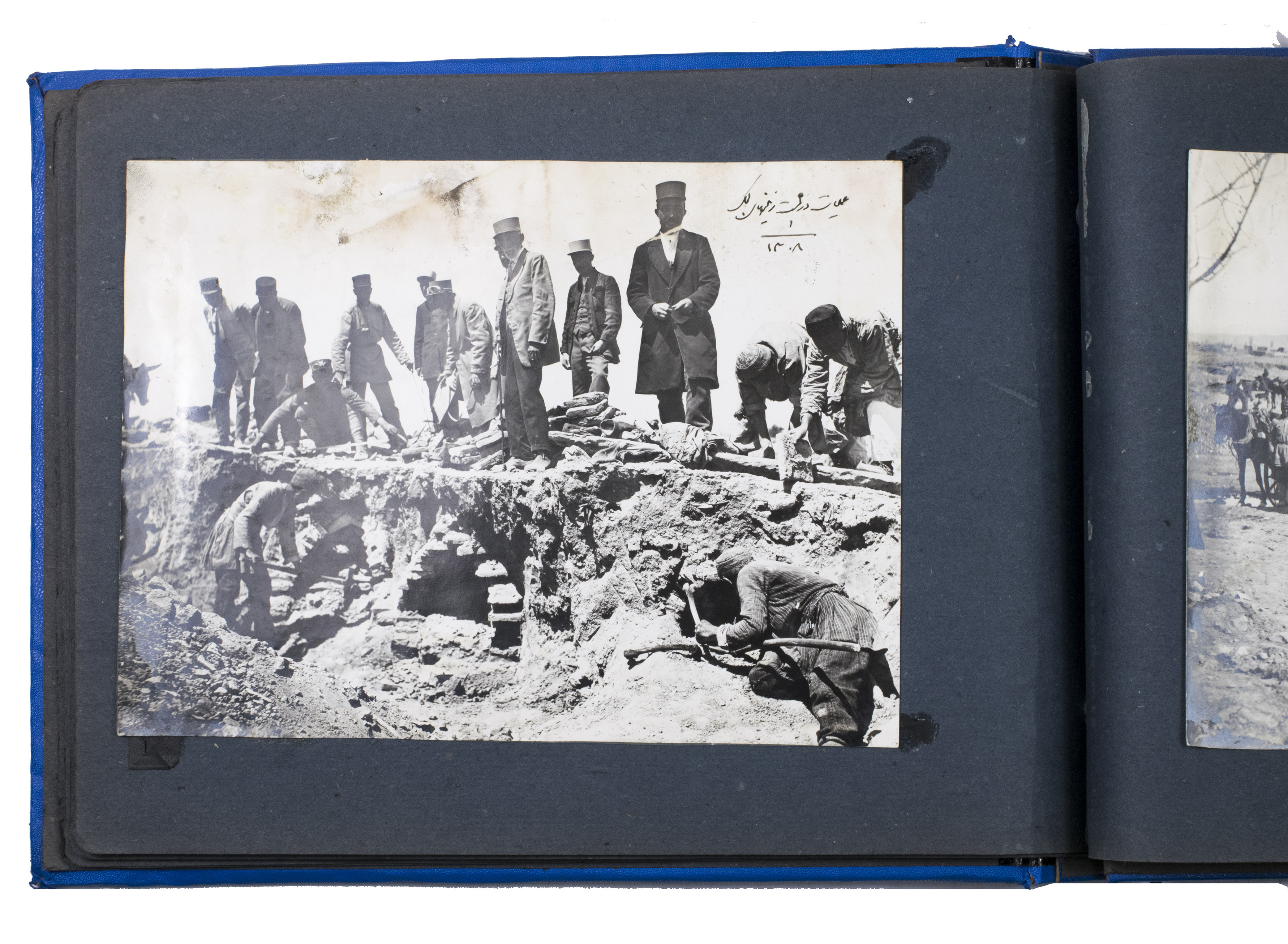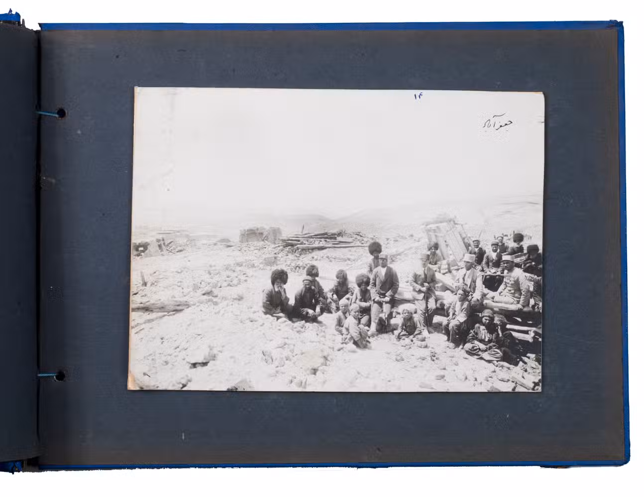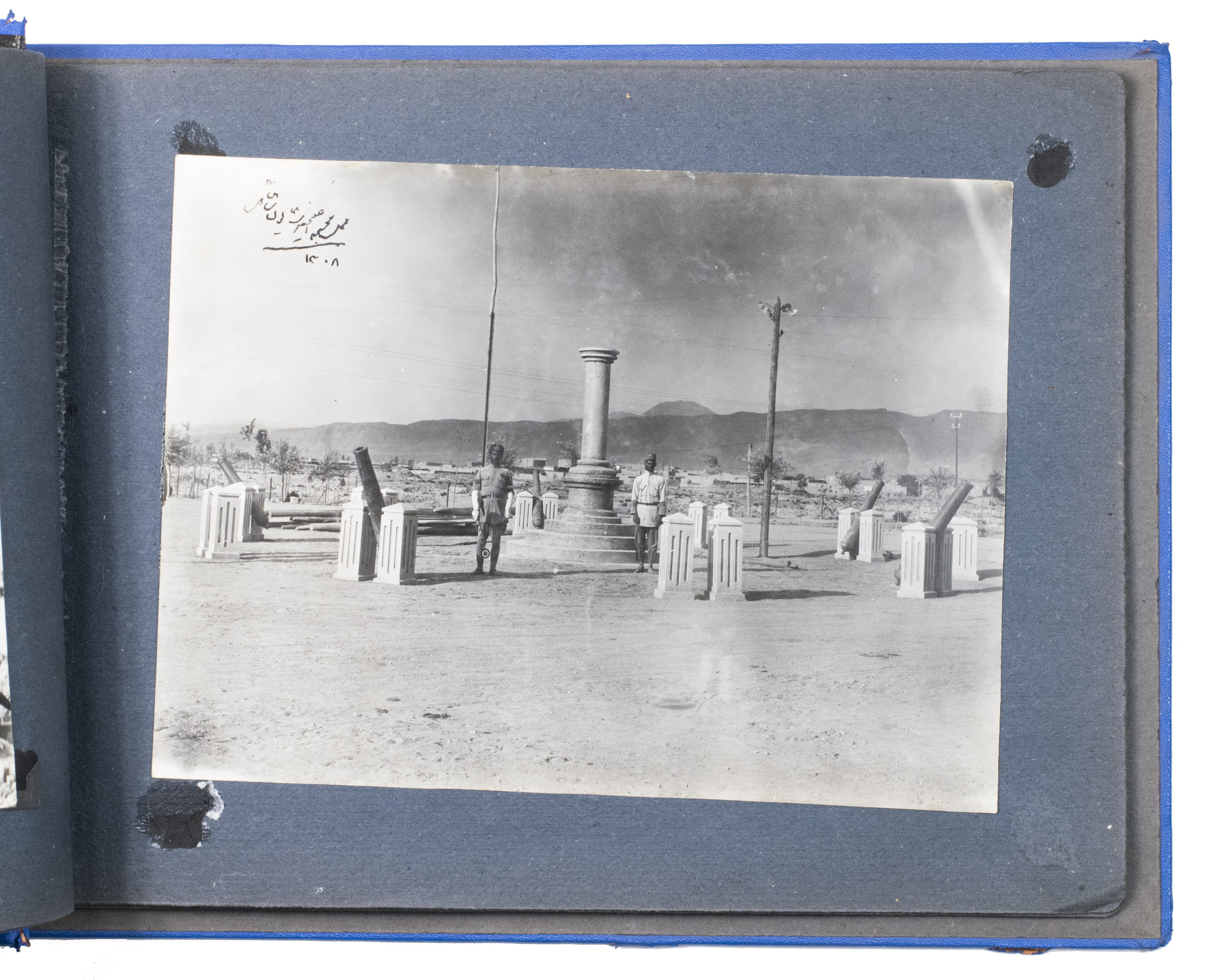 With some glue staining to the dark blue paper on several pages. A few photographs show minor marginal wear, not affecting the images themselves. The final photograph is not mounted on the album paper but on a separate piece of card and is loosely inserted. Otherwise in good condition. Cf. Tofigh Kouzehkanani & Zelef, "Towards extroverted urbanism: Haussmannization and building a new urban identity in Tabriz (1925-1942)", ITU AZ, 22, 3 (2025), pp. 559-577