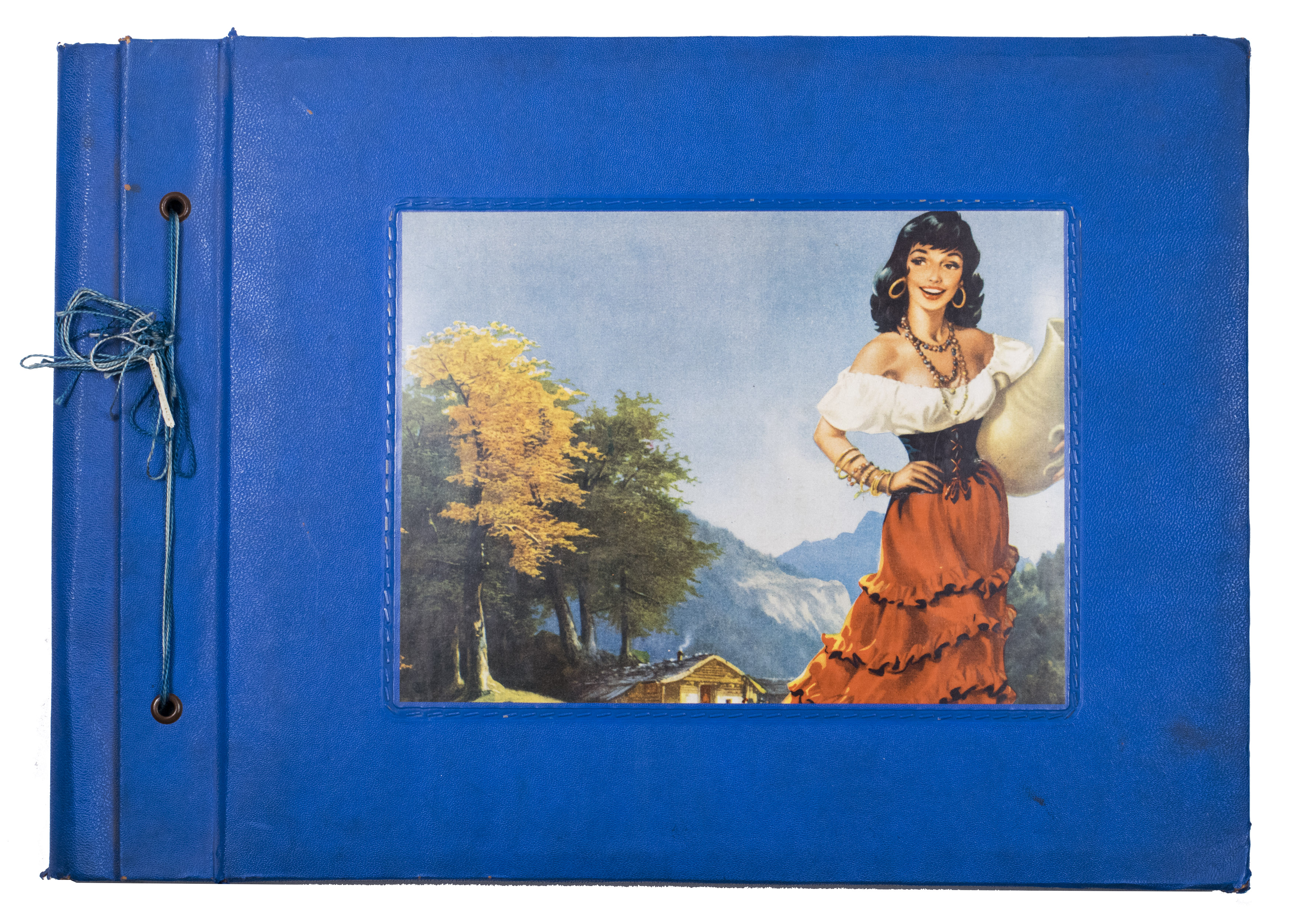 [Iran, 1307-1308 AH (= 1928-1930 CE)]. Oblong album (24.5 x 29.6 cm). With 19 black and white photographs (ca. 23.1 x 17.1 cm) on thick dark blue/black paper. Mid-19th-century bright blue faux-leather, the front board features a pictorial on-lay within a rectangular frame, the illustration depicts a young woman in traditional costume holding a large ceramic vessel. The joints are laced through onto 2 supports. [9] ll.