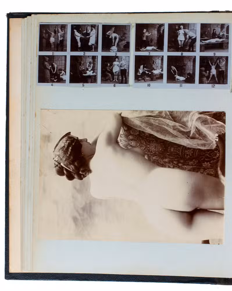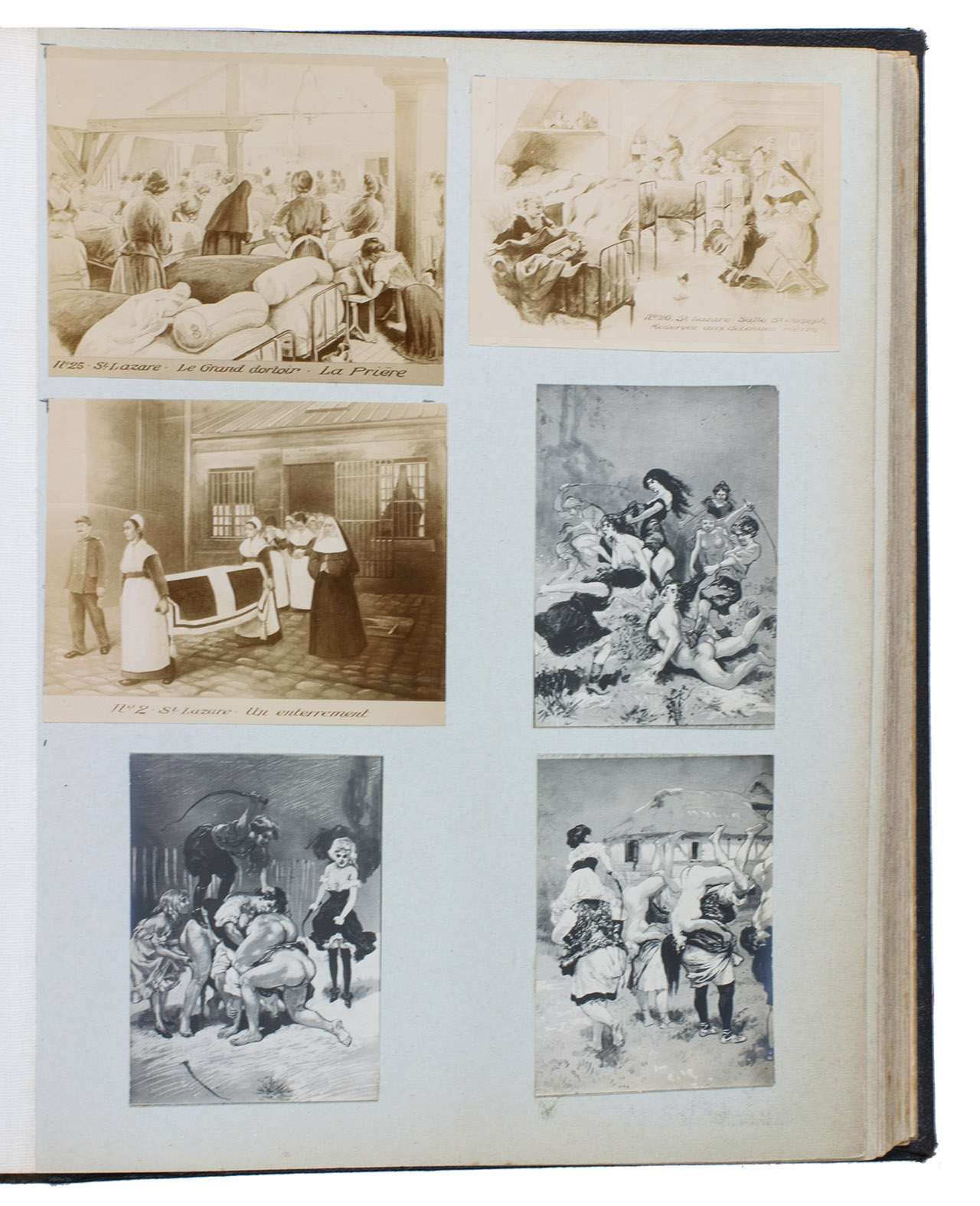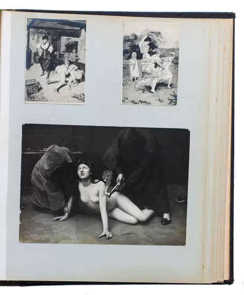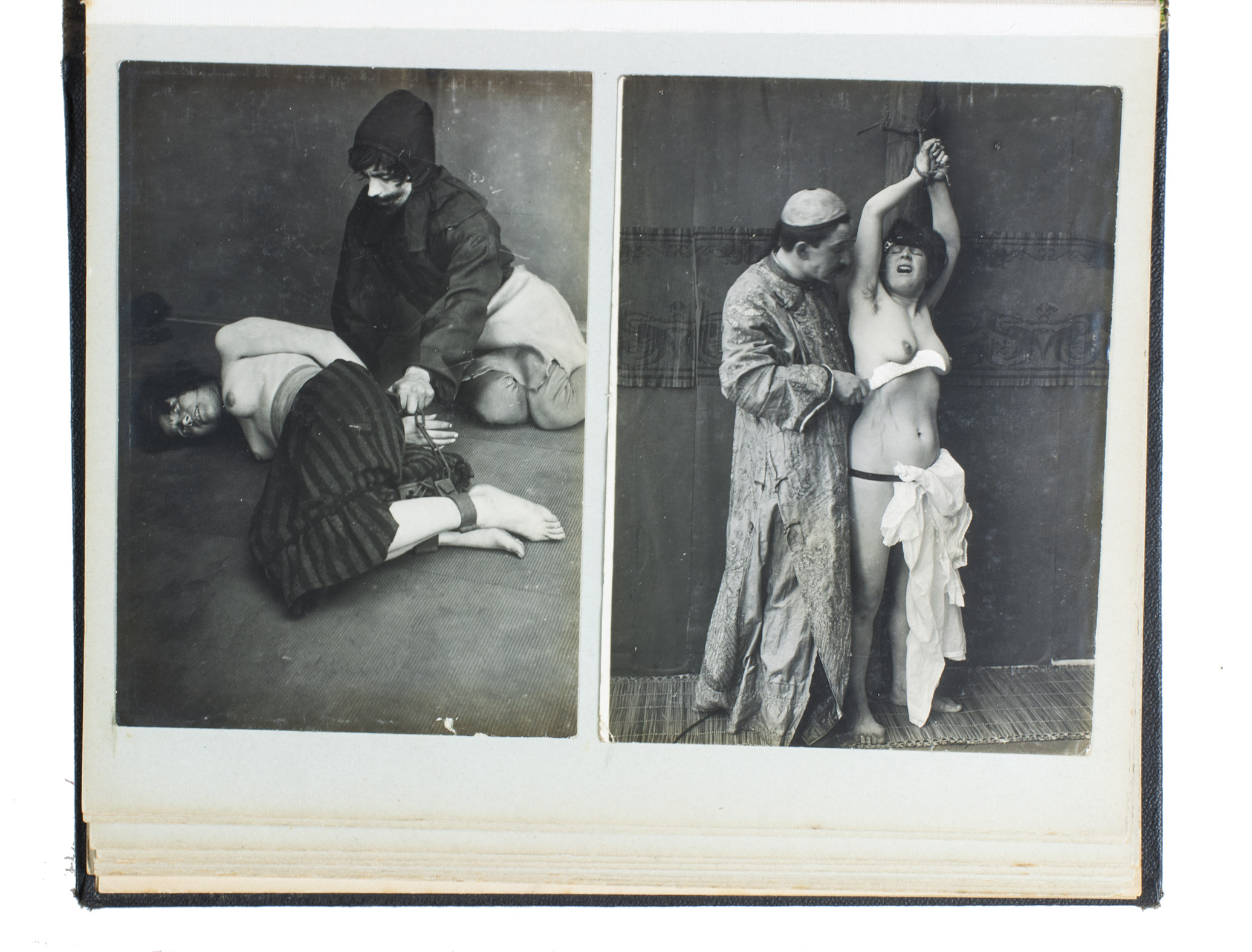 Captivating erotic photo album containing both original photographs and reproductions on the themes of "punishment and penance", which in most cases means flagellation. This specific album was probably compiled by a certain H[ector] Rabier, whose name is inscribed on the spine and was possibly a young Belgian. Among the reproductions of prints in this album, can be found various images with an erotic nature showing the flagellation of women by men and women, and non-erotic images of the torture and punishment of (female) heretics and witches, including reproductions of artworks. A few series do not involve women and show various types of corporal punishment in the French colonies of Algeria and Indochina and flogging in the British army. A series of 27 images, though not explicitly showing scenes of corporal punishment, shows life in the Parisian women's prison of Saint Lazare, which also doubled as a hospital for the city's prostitutes. 12 photographs show wood engravings of the cruel murder and torture of nude women by Cossacks, most including the pins used to hold the engravings in place. Of the original photographs, two "academic nudes" show a woman from behind, kneeling on top of a chair or hanging face down over a chair or cabinet. The other 17 photographs show a semi-nude woman being bound or tortured by "oriental" men or monks. A montage of small images suggests that the woman-and-monk photographs, probably suggesting a witch or heretic being tortured by the inquisition, formed part of a larger collection on this subject. Although these photographs were obviously intended as pornographic images, they are hardly more explicit than contemporary historical paintings at the Salon, or the images in popular histories.