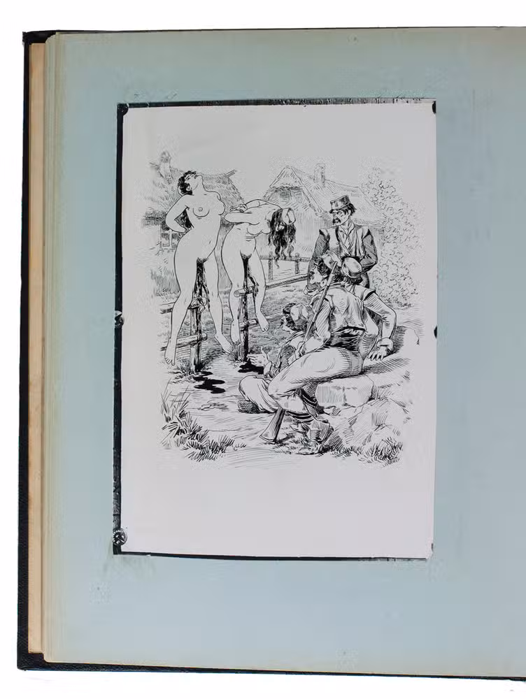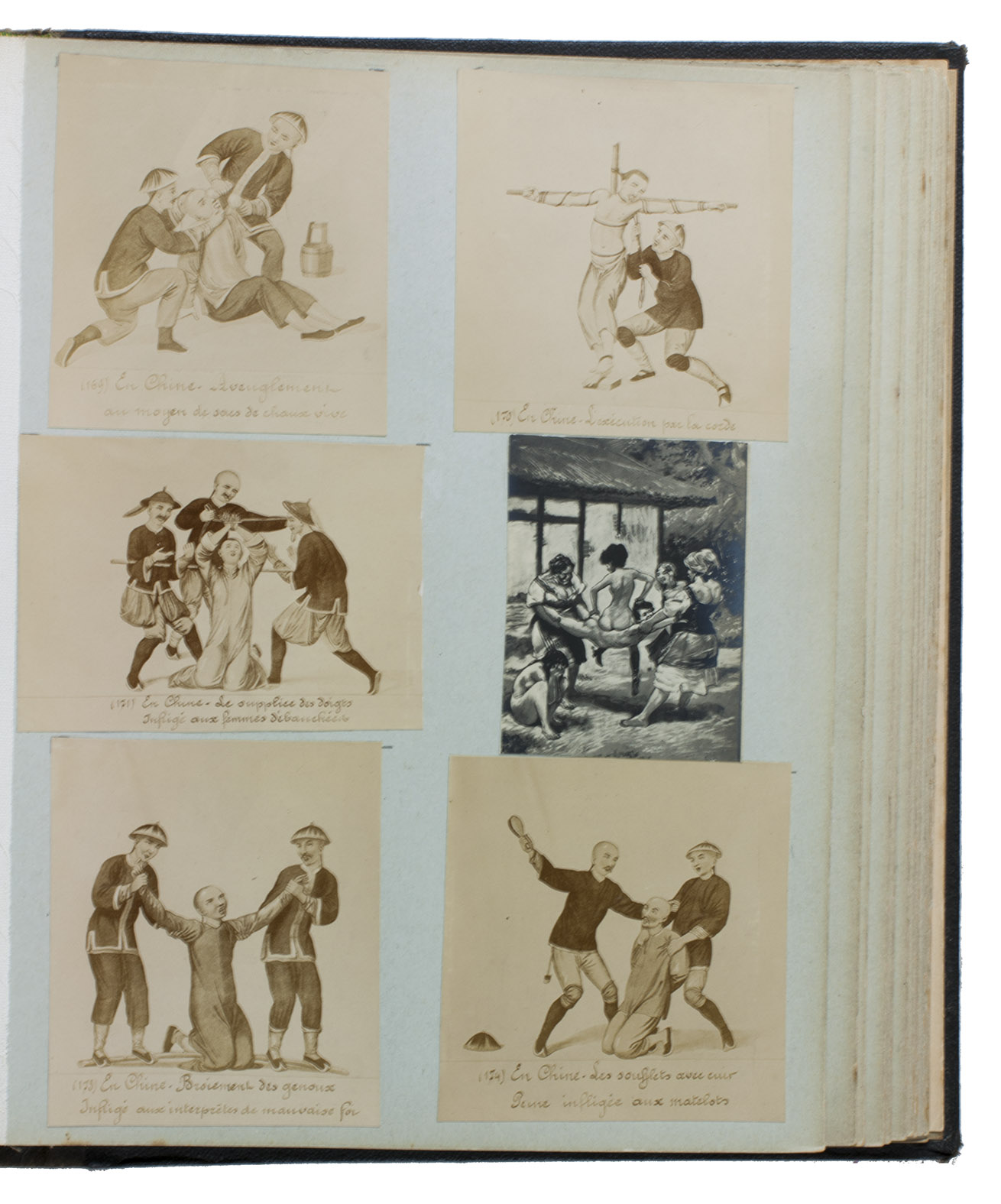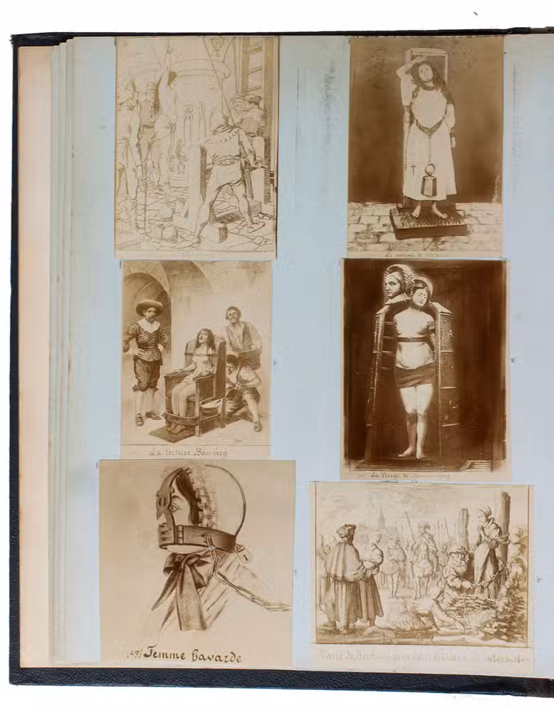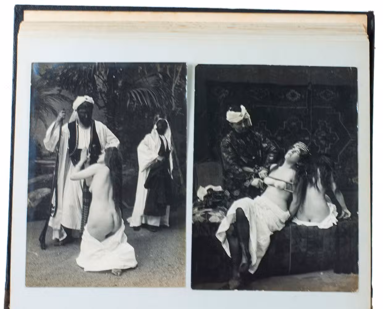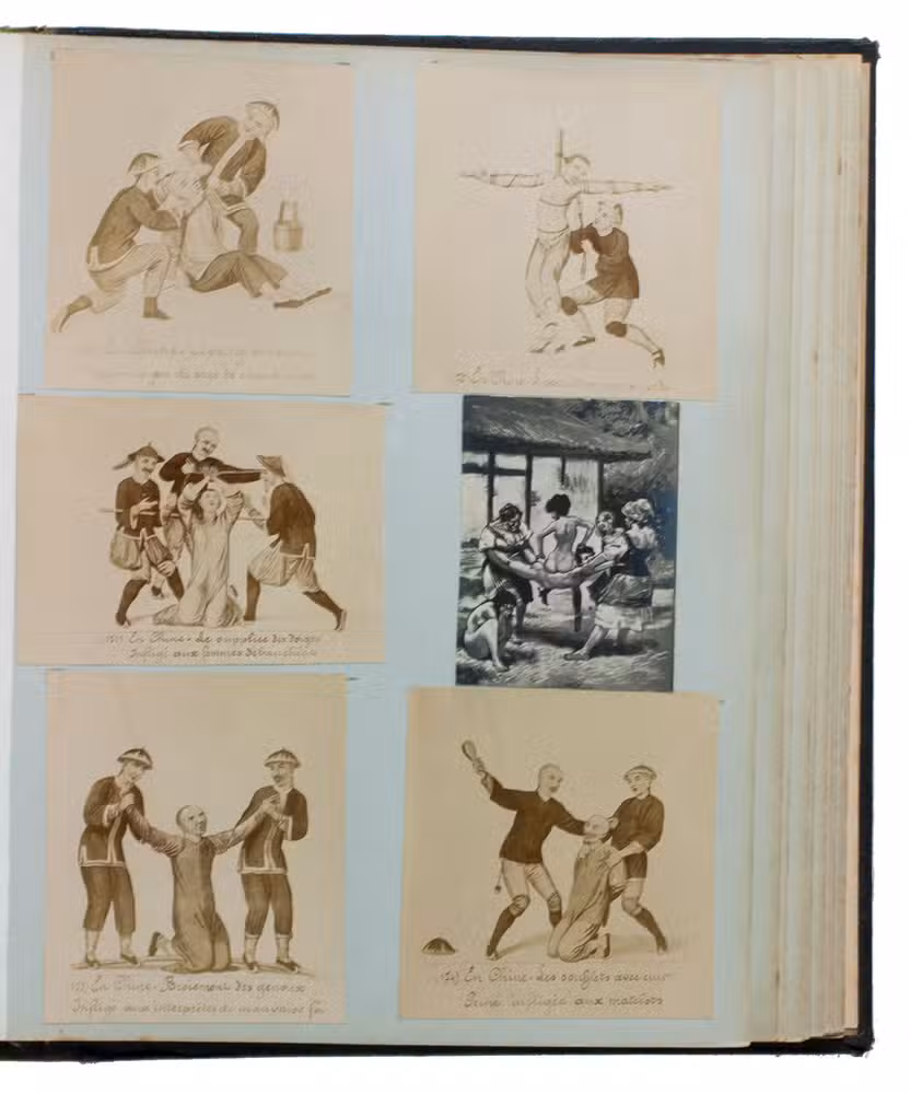 Captivating erotic photo album containing both original photographs and reproductions on the themes of "punishment and penance", which in most cases means flagellation. This specific album was probably compiled by a certain H[ector] Rabier, whose name is inscribed on the spine and was possibly a young Belgian. Among the reproductions of prints in this album, can be found various images with an erotic nature showing the flagellation of women by men and women, and non-erotic images of the torture and punishment of (female) heretics and witches, including reproductions of artworks. A few series do not involve women and show various types of corporal punishment in the French colonies of Algeria and Indochina and flogging in the British army. A series of 27 images, though not explicitly showing scenes of corporal punishment, shows life in the Parisian women's prison of Saint Lazare, which also doubled as a hospital for the city's prostitutes. 12 photographs show wood engravings of the cruel murder and torture of nude women by Cossacks, most including the pins used to hold the engravings in place. Of the original photographs, two "academic nudes" show a woman from behind, kneeling on top of a chair or hanging face down over a chair or cabinet. The other 17 photographs show a semi-nude woman being bound or tortured by "oriental" men or monks. A montage of small images suggests that the woman-and-monk photographs, probably suggesting a witch or heretic being tortured by the inquisition, formed part of a larger collection on this subject. Although these photographs were obviously intended as pornographic images, they are hardly more explicit than contemporary historical paintings at the Salon, or the images in popular histories.