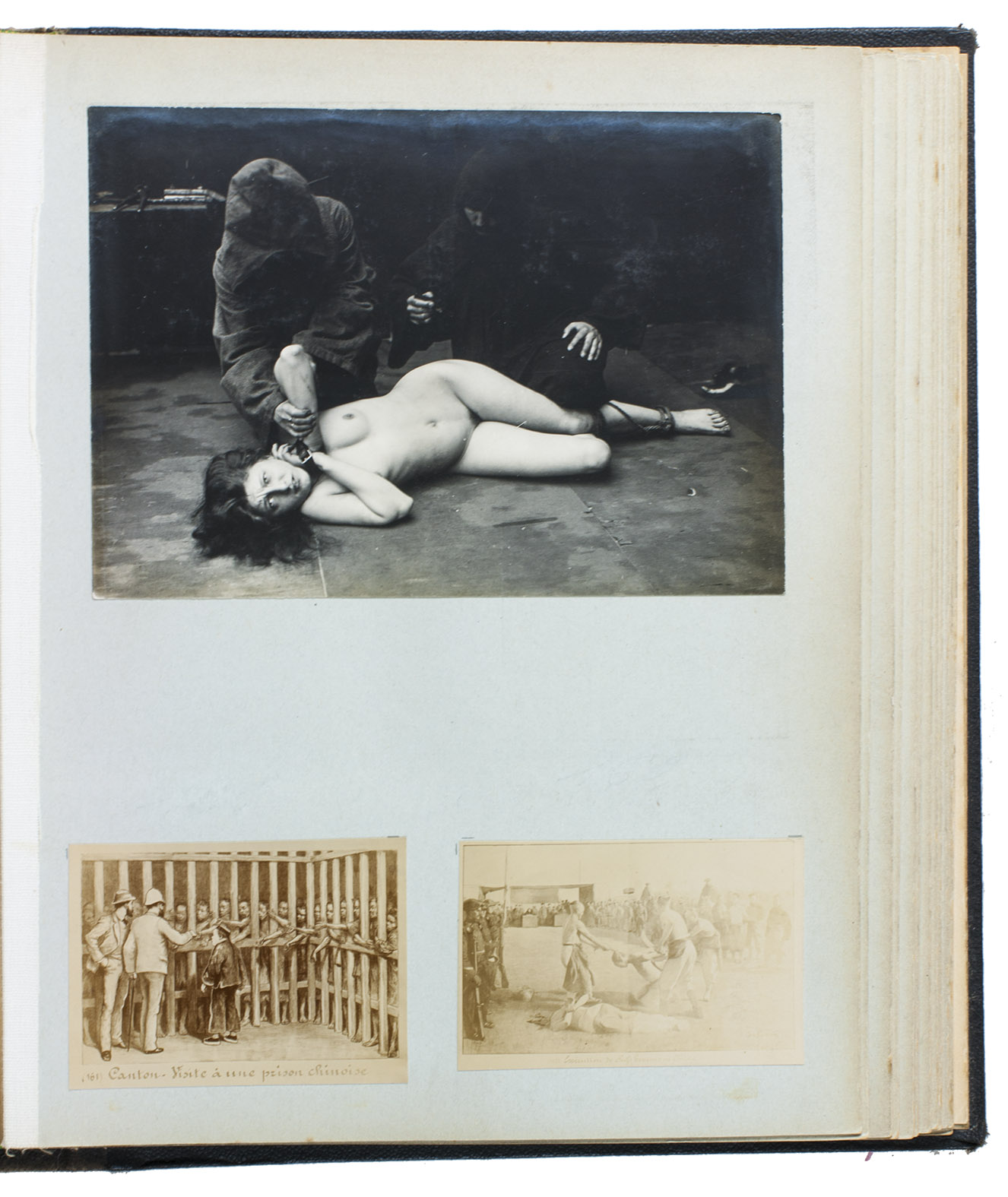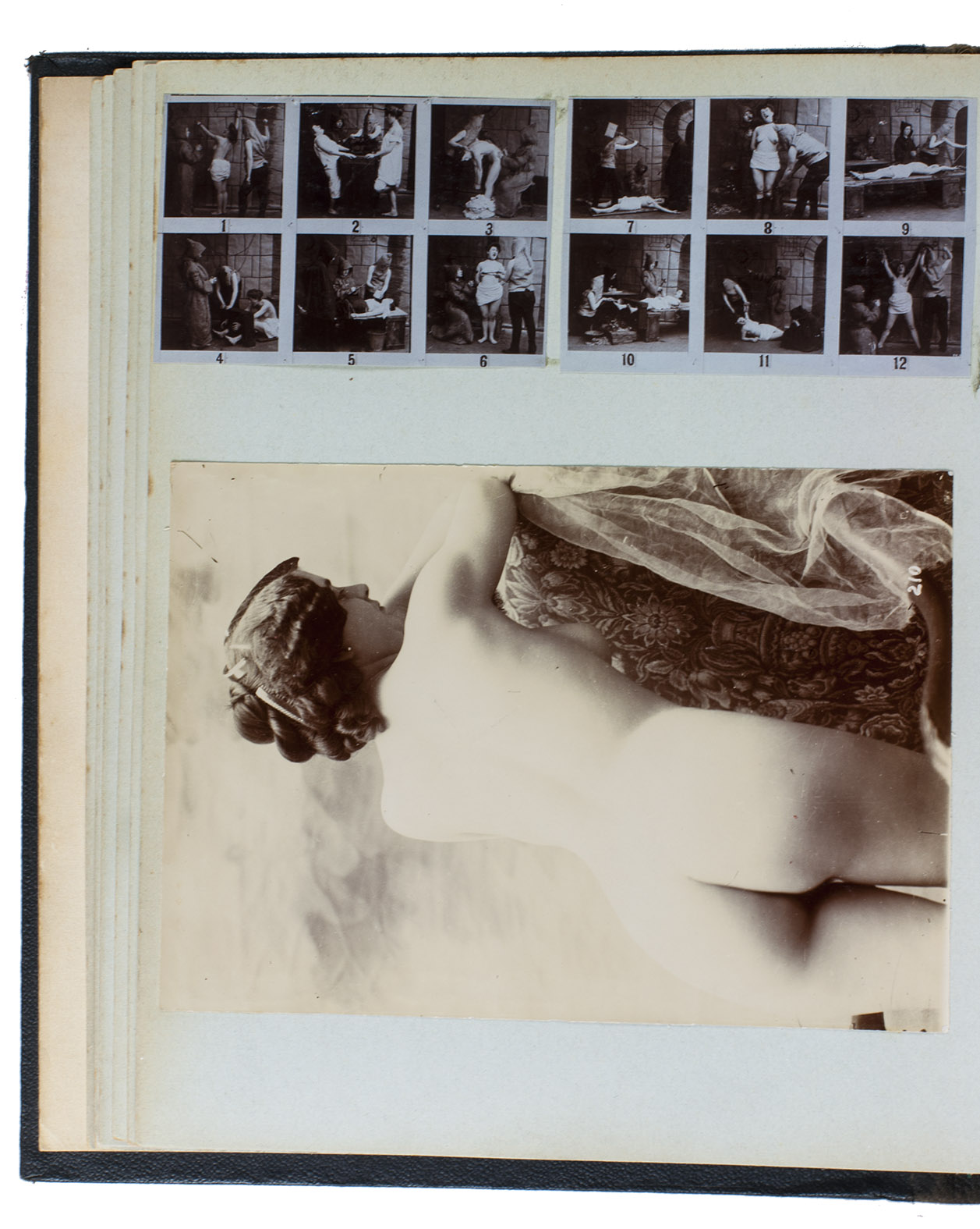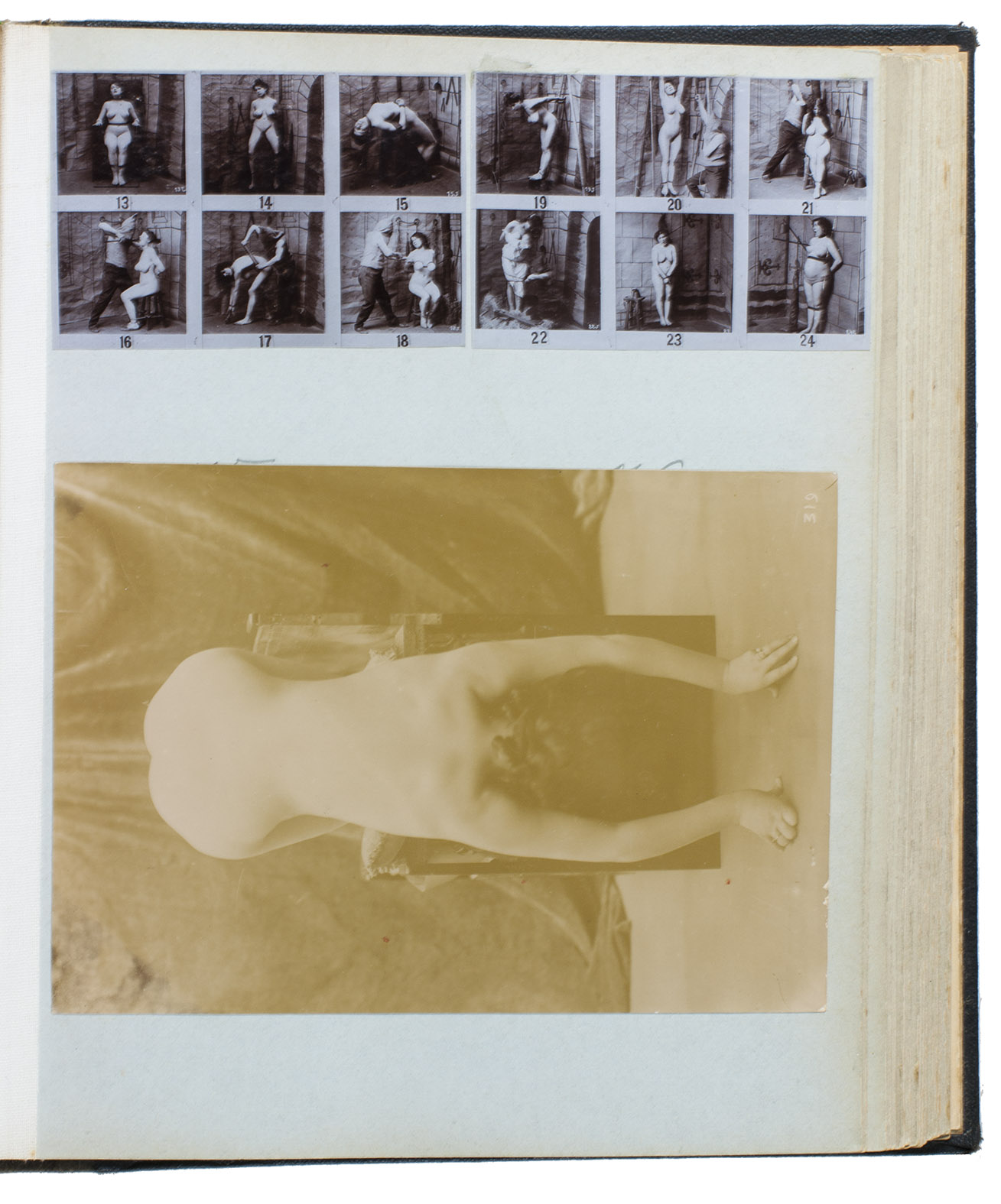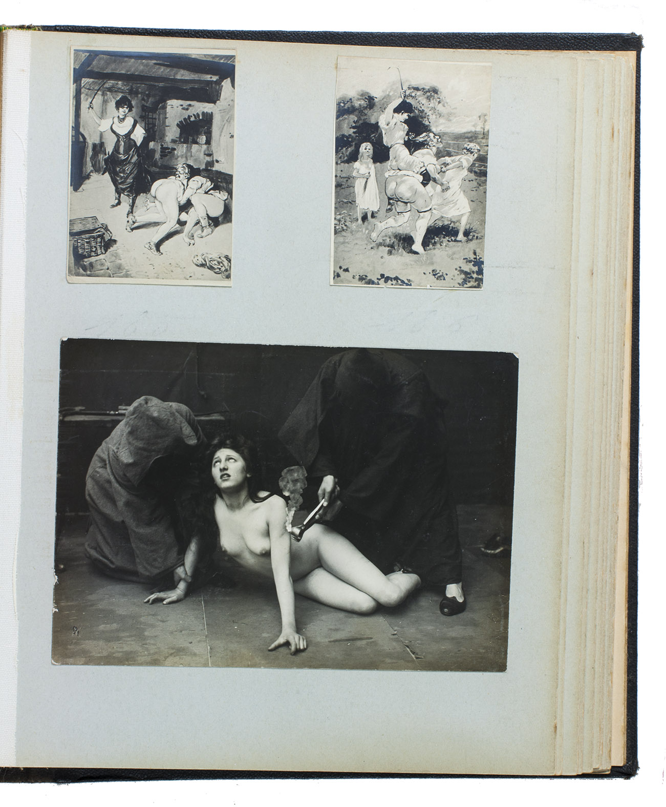 [France/Belgium, early 20th century]. 4to (23.5 x 20 cm). Album containing 24 small contact prints and 153 albumen or gelatin silver prints, 16 photographic reproductions of paintings or drawings, 2 albumen prints of nudes and 17 silver gelatin prints of sadomasochistic scenes. Contemporary black cloth, with the title ("H. Rabier - peines - supplices") on the spine. [52 pp.]