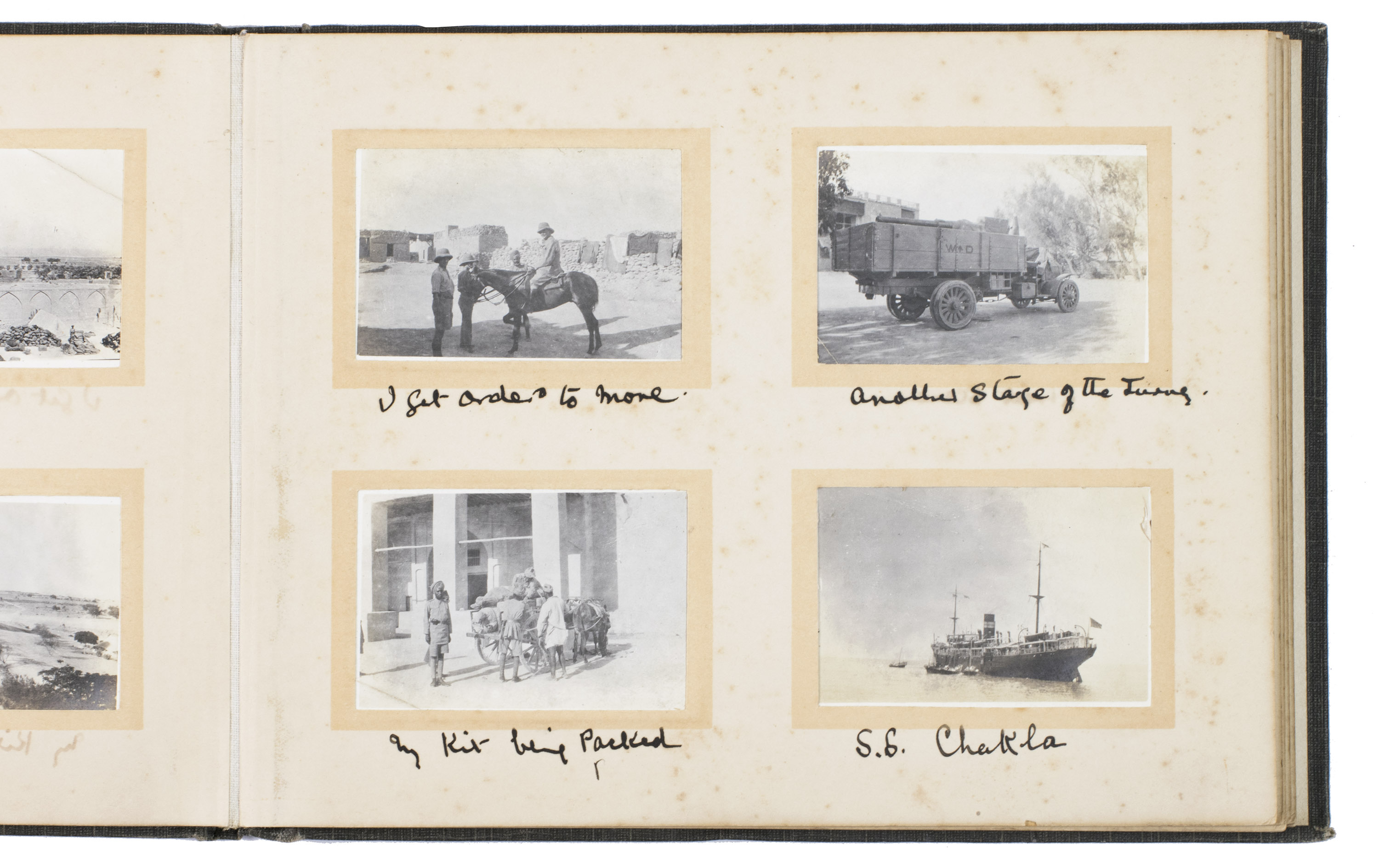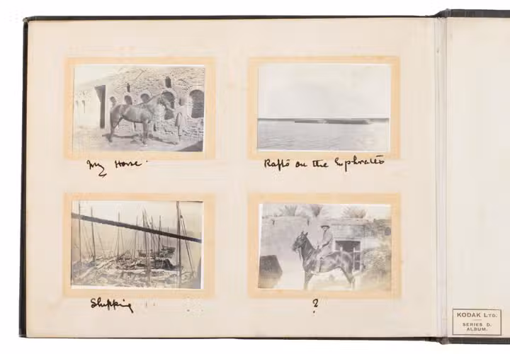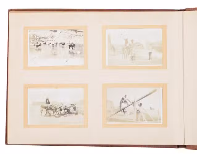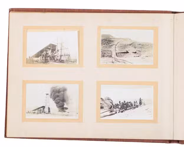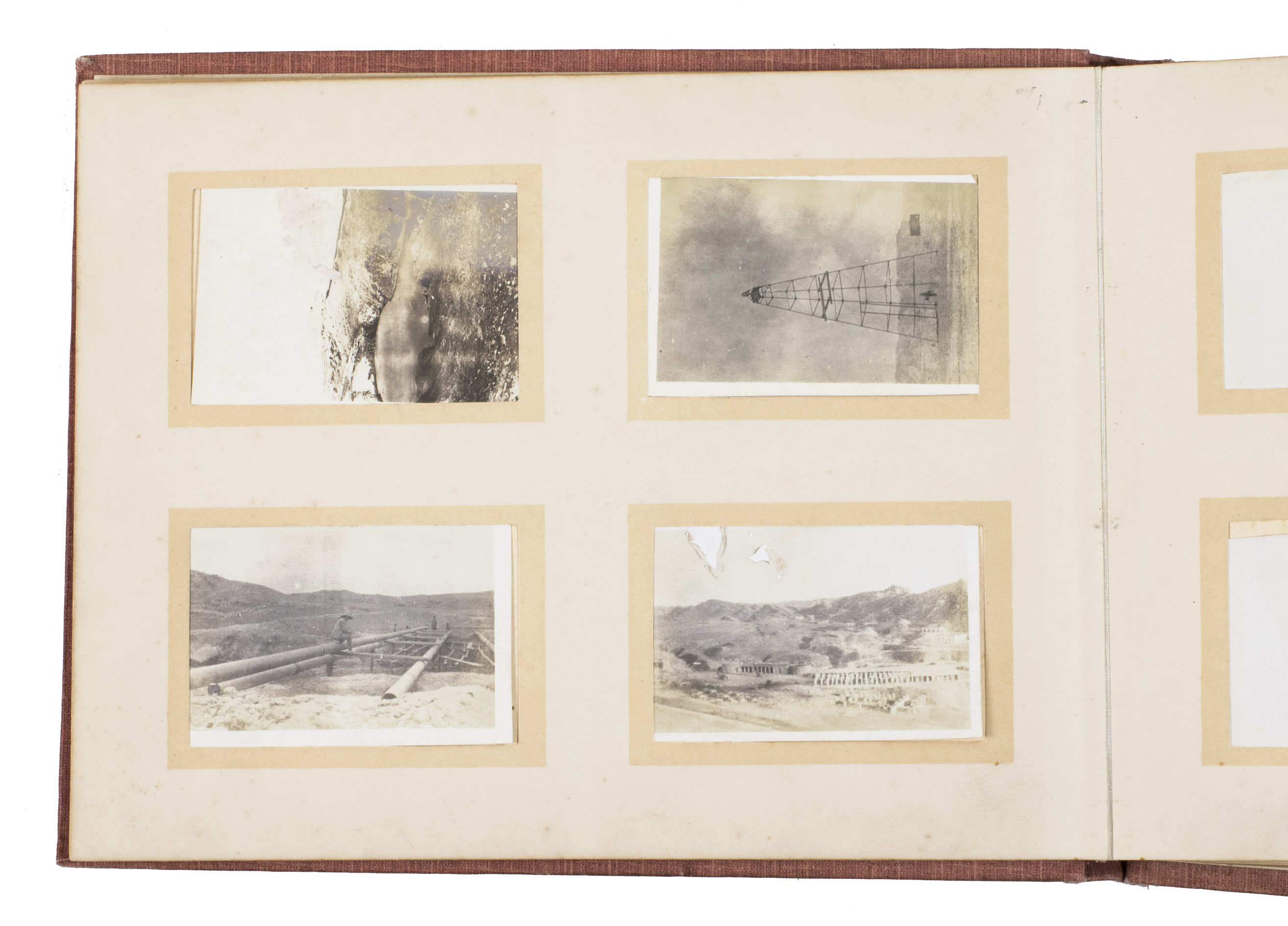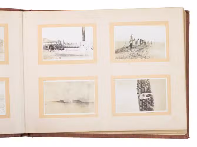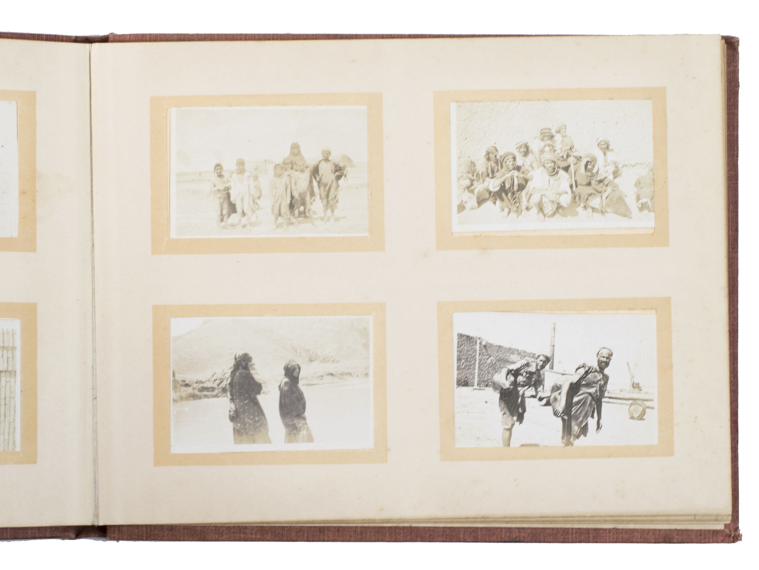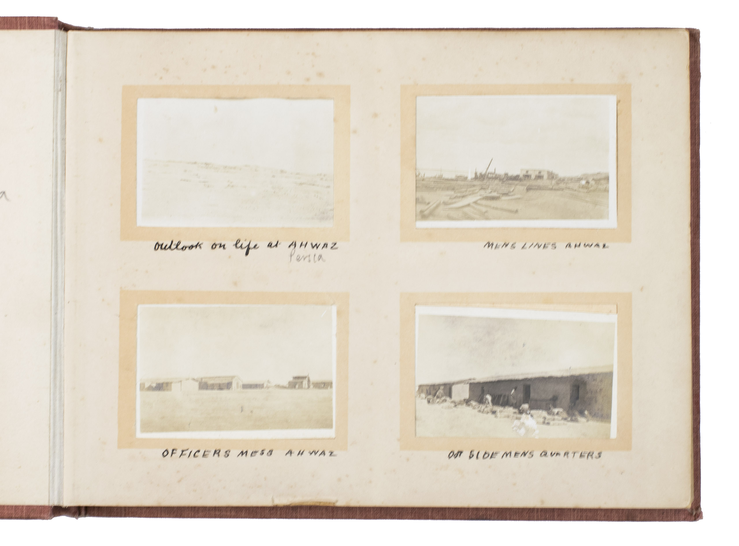 Remarkable set of Kodak photo albums, with nearly 200 photographs of military life and the oil industry in Iran and Iraq in the early 20th century. The photographs were most likely taken by the compiler of the albums, and show scenes from his daily life. Most of them are captioned. Included are images of Persian oil fields, Abu Zenema (Sinai coast), Port Sudan, Bushehr, Basra, various locations along the Tigris, Euphrate and Shatt al-Arab rivers, Ashwaz and Shush. The photographs also show locals involved in various activities, including races, shark hunting, and selling wares. The compiler of the album was likely a British soldier who was stationed in Basra and other locations in Iran and Iraq after the First World War.