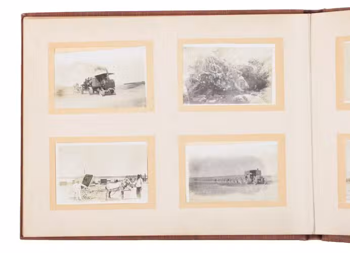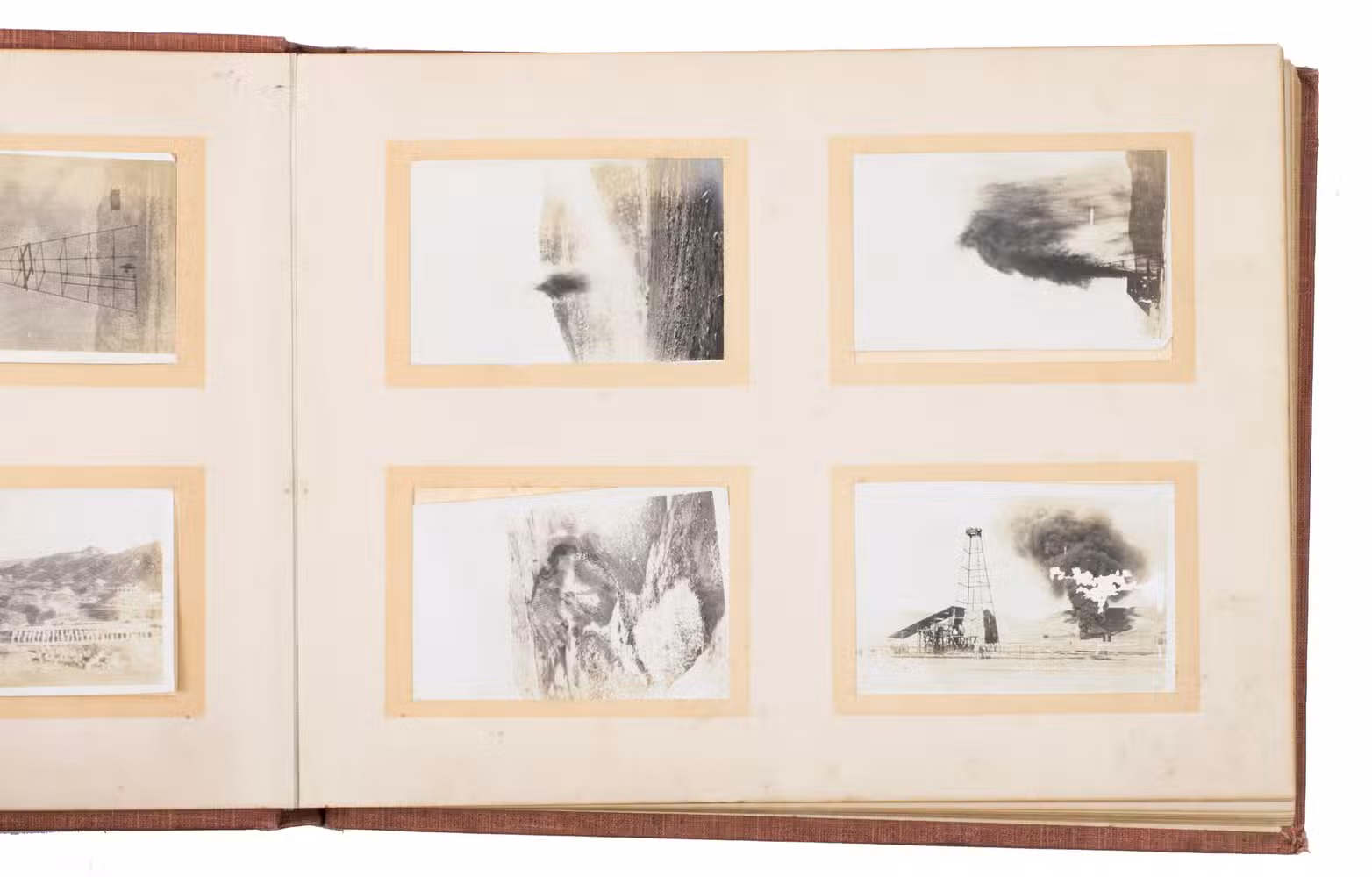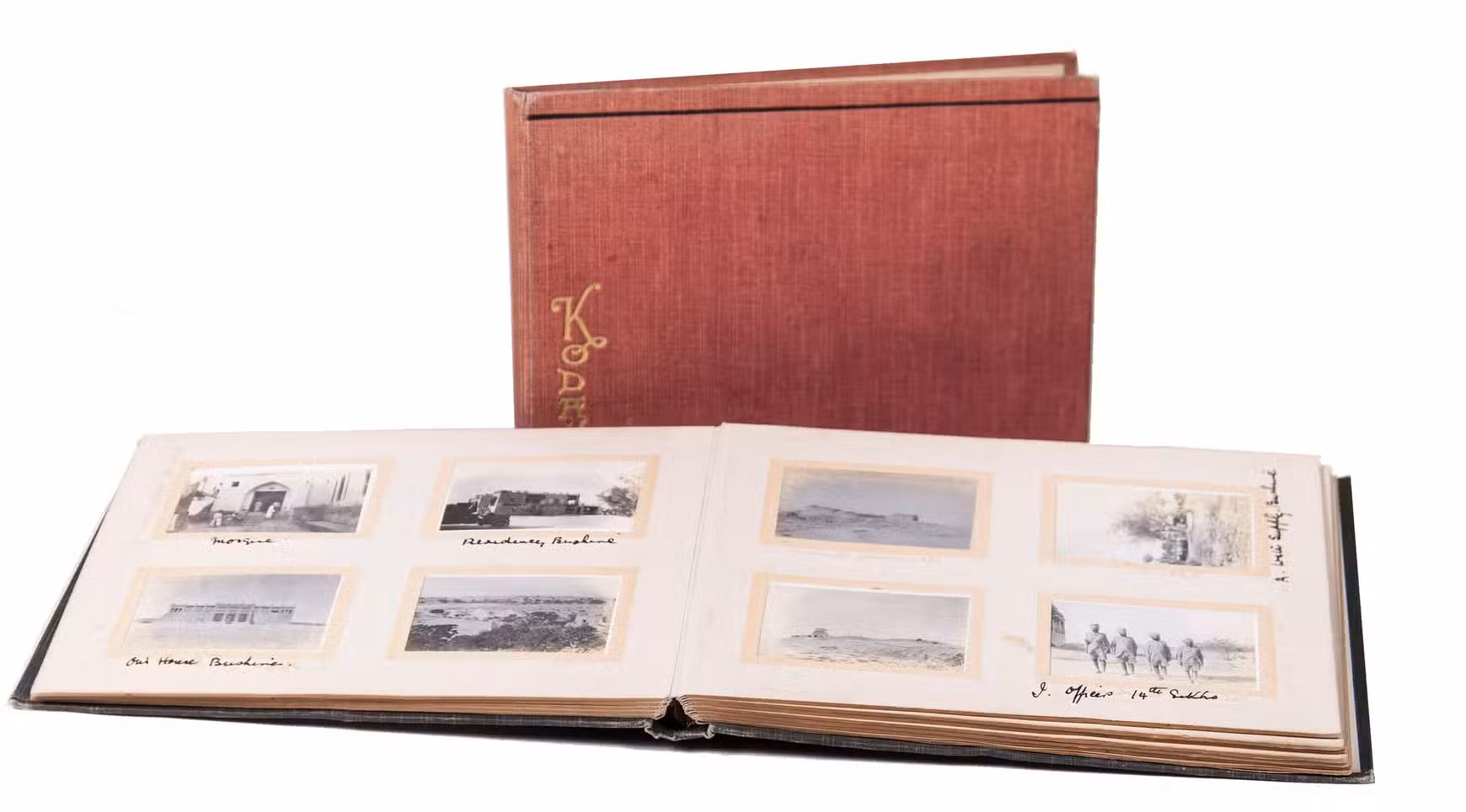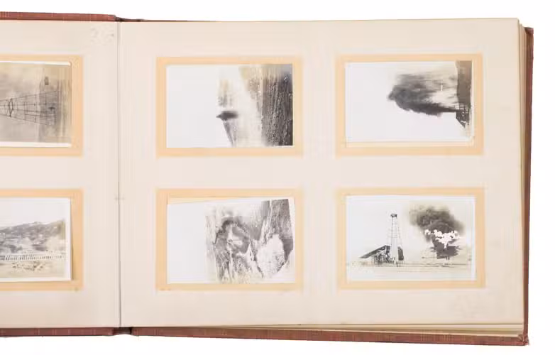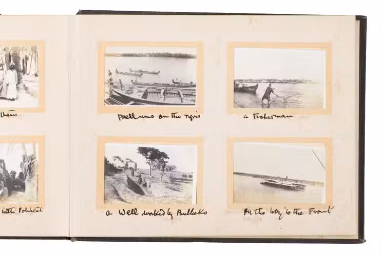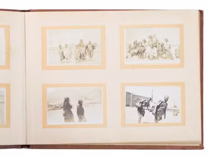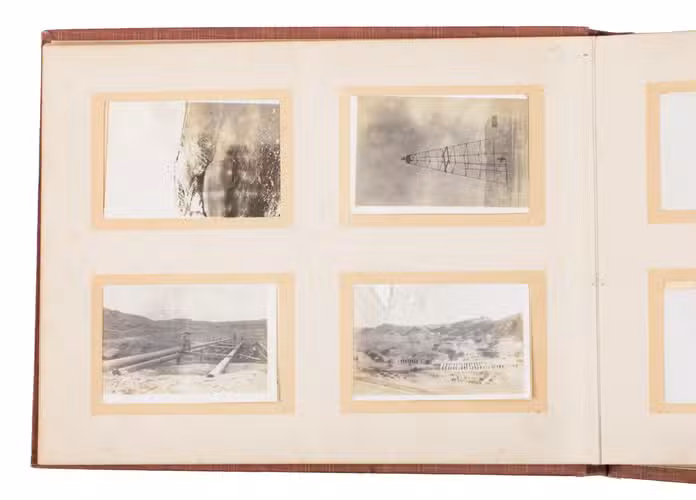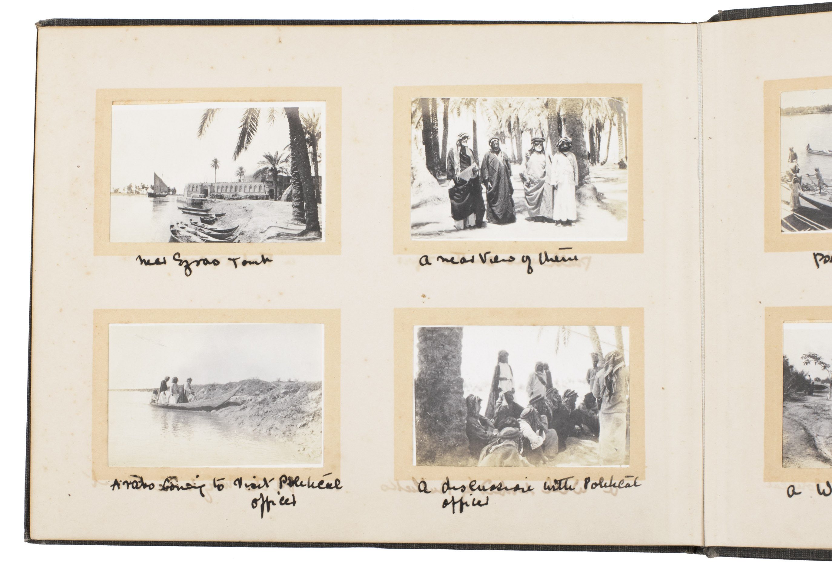 Remarkable set of Kodak photo albums, with nearly 200 photographs of military life and the oil industry in Iran and Iraq in the early 20th century. The photographs were most likely taken by the compiler of the albums, and show scenes from his daily life. Most of them are captioned. Included are images of Persian oil fields, Abu Zenema (Sinai coast), Port Sudan, Bushehr, Basra, various locations along the Tigris, Euphrate and Shatt al-Arab rivers, Ashwaz and Shush. The photographs also show locals involved in various activities, including races, shark hunting, and selling wares. The compiler of the album was likely a British soldier who was stationed in Basra and other locations in Iran and Iraq after the First World War.