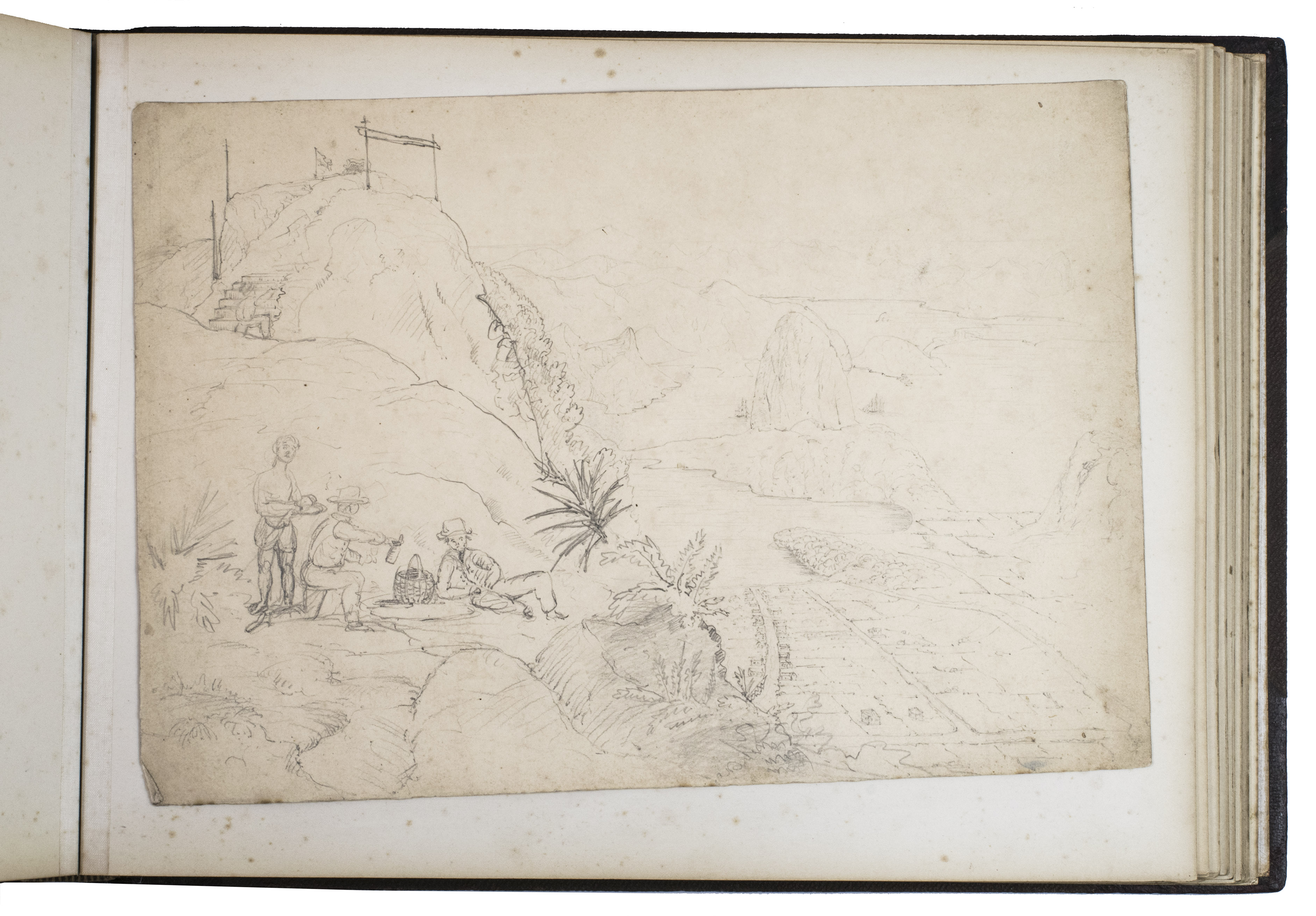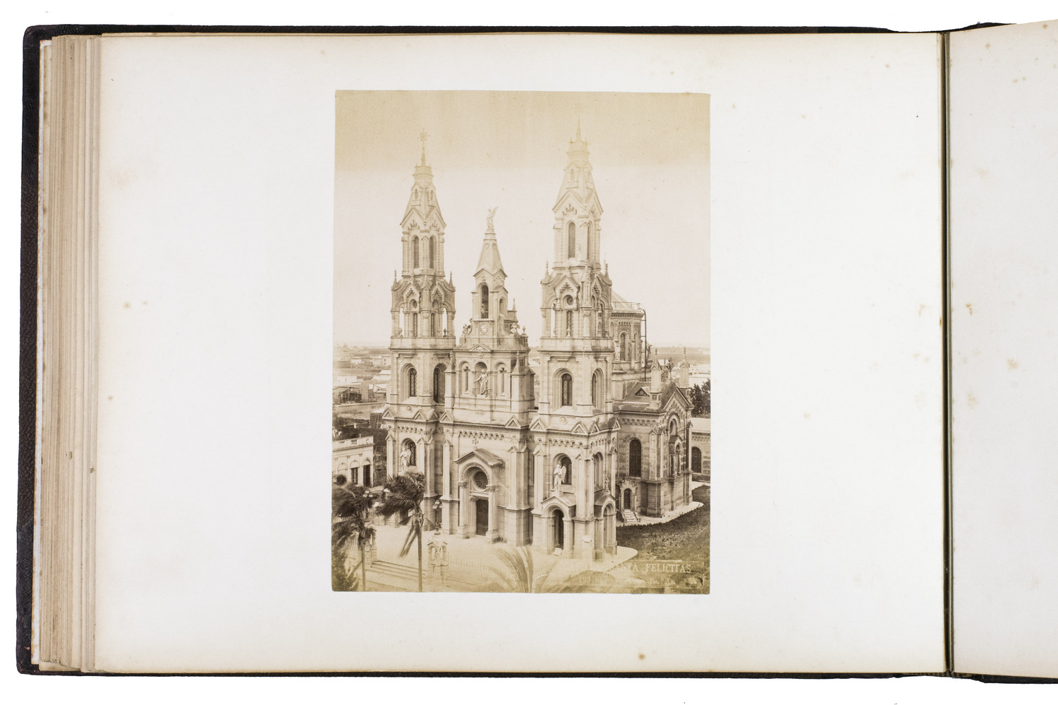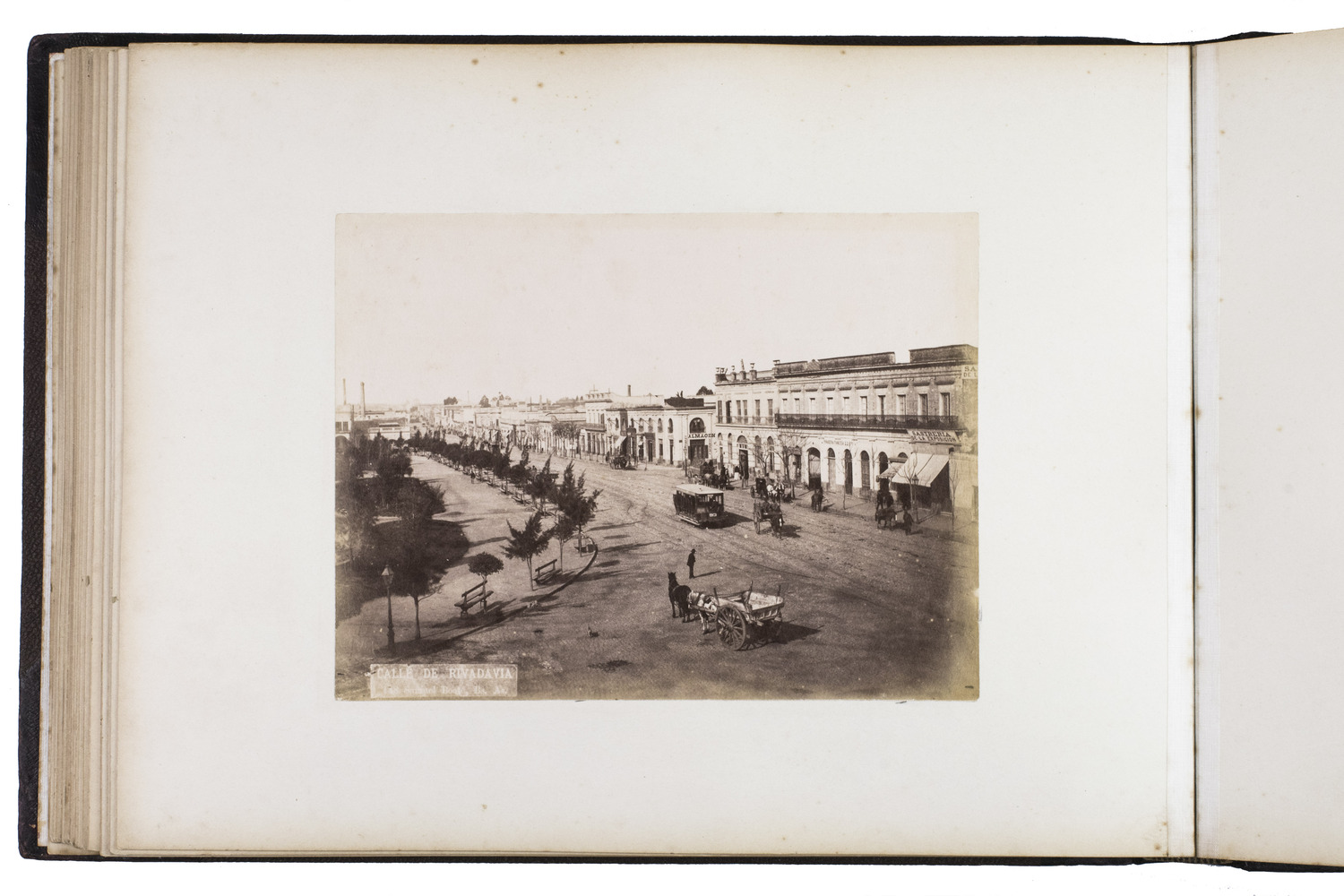 The album contains photographs, drawings, and plates relating to the places the Calliope visited between 1838-1840. It starts with photographs of Madeira and Tenerife, like the Loo Rock in the harbour of Madeira, locals carrying a tourist down the Pico Grande, the town of Güímar in Tenerife, and an age-old Dragon Tree. As the ship's next destination was Brazil, the album contains a number of photographs and illustrations of Rio de Janeiro, as well as a drawing of a picnic at the summit of the Corcovado. The Calliope then sailed to Buenos Aires and Santa Fe, arriving in August 1838. This part of the album contains a drawing of a gaucho, and 6 beautiful photographs by Samuel Boote (1844-1921), one of the most important photographers working in Argentina in the 19th century. His work shows the interior and exterior of the St. Felicitas Church in Santa Fe, as well as daily life in this city. The ship then carried the British ambassador from Argentina to Montevideo, arriving in June 1839, before continuing to Valparaíso. The final pages of the album contain a map of Montevideo, views of Valparaíso and the mountains nearby, and a drawing of a bridge.