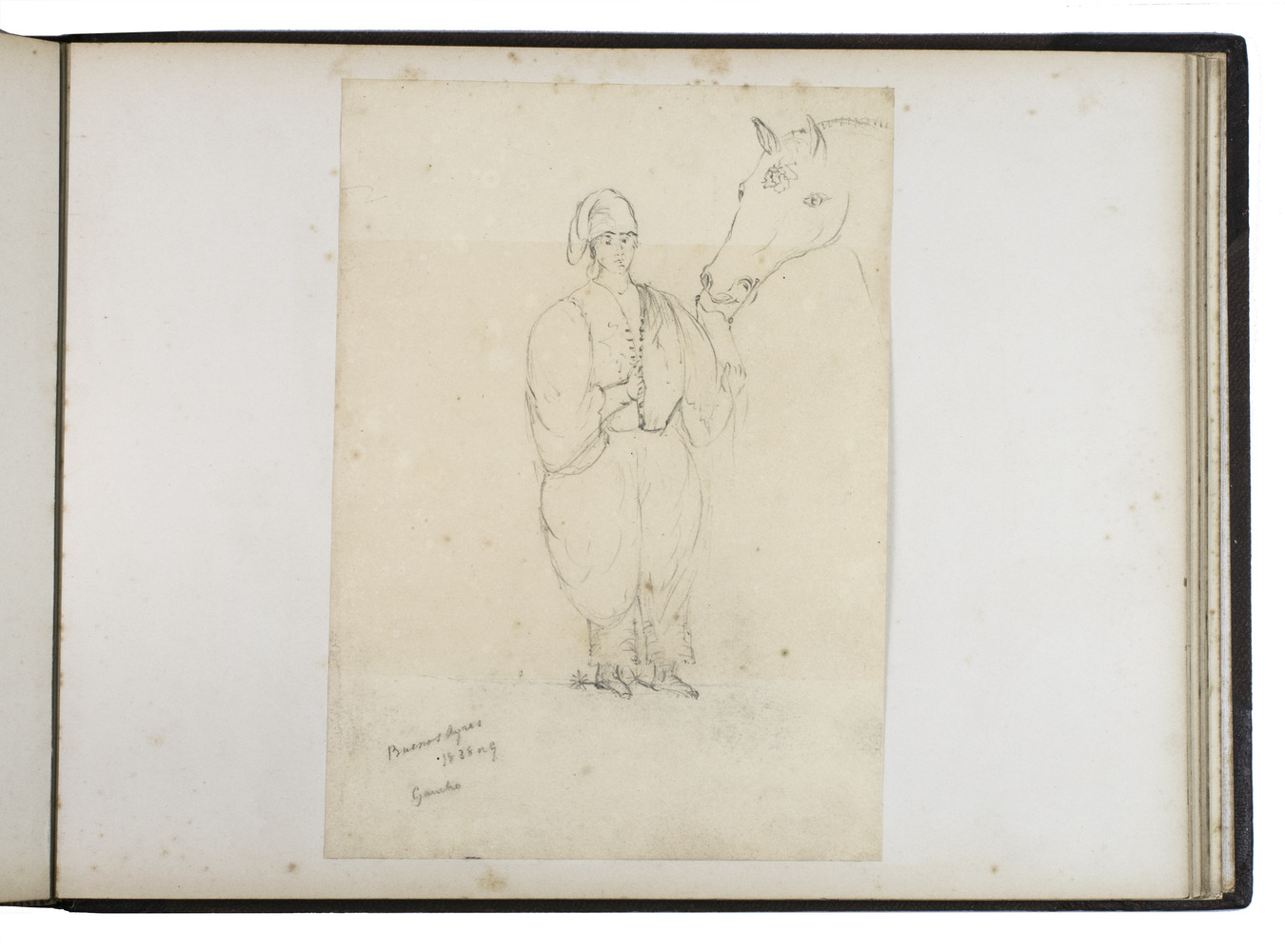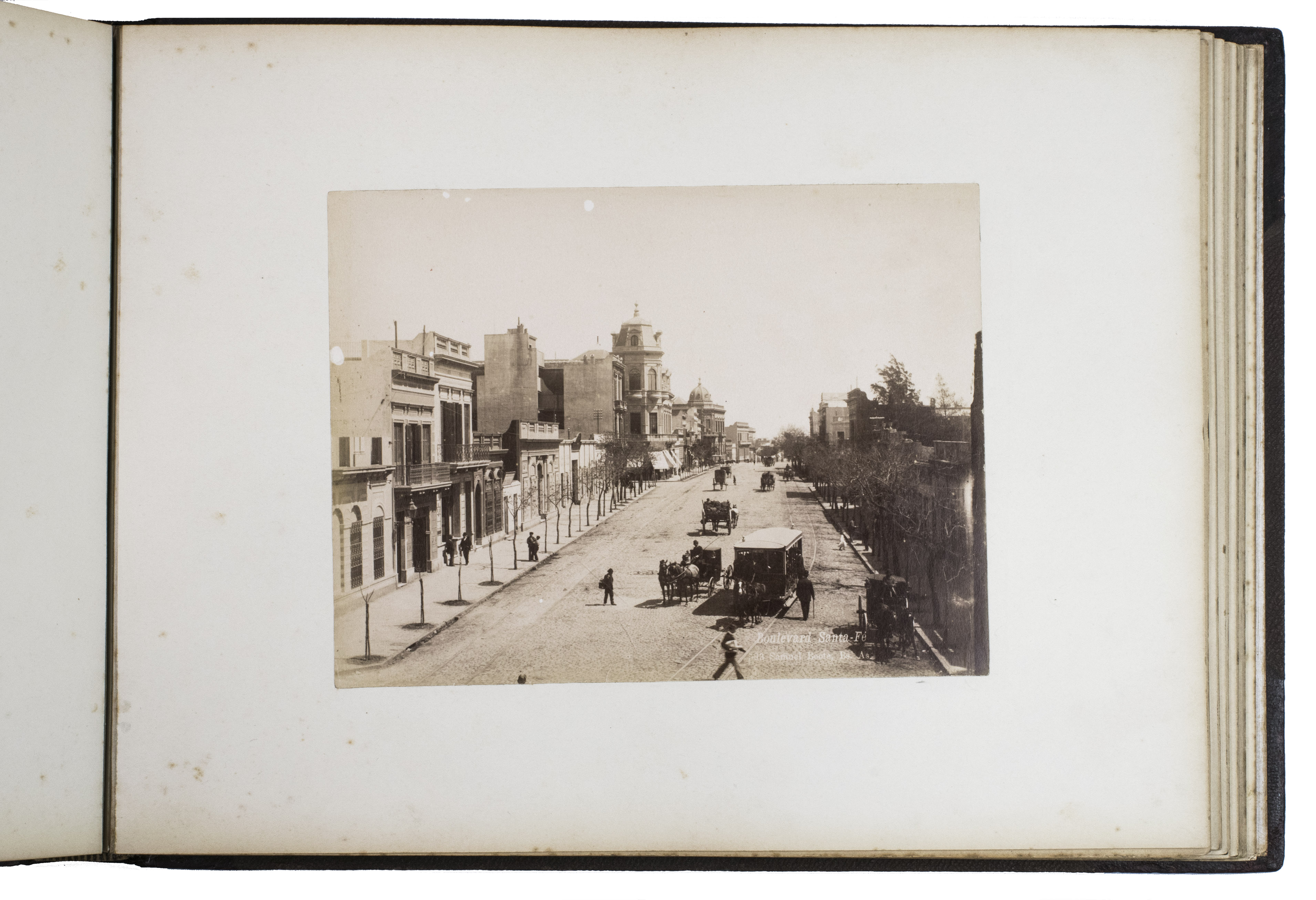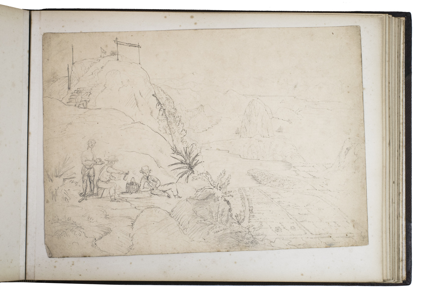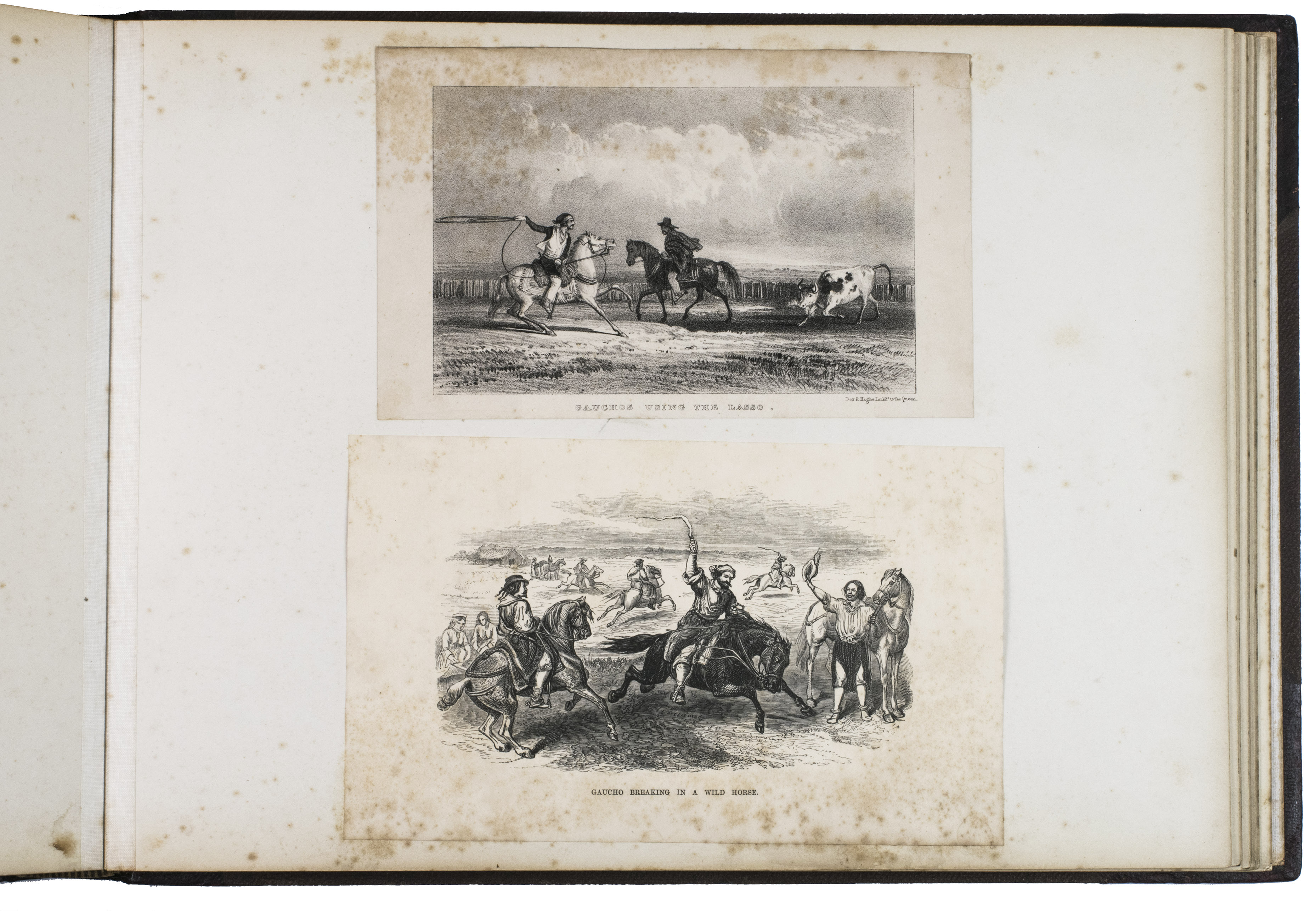 The album contains photographs, drawings, and plates relating to the places the Calliope visited between 1838-1840. It starts with photographs of Madeira and Tenerife, like the Loo Rock in the harbour of Madeira, locals carrying a tourist down the Pico Grande, the town of Güímar in Tenerife, and an age-old Dragon Tree. As the ship's next destination was Brazil, the album contains a number of photographs and illustrations of Rio de Janeiro, as well as a drawing of a picnic at the summit of the Corcovado. The Calliope then sailed to Buenos Aires and Santa Fe, arriving in August 1838. This part of the album contains a drawing of a gaucho, and 6 beautiful photographs by Samuel Boote (1844-1921), one of the most important photographers working in Argentina in the 19th century. His work shows the interior and exterior of the St. Felicitas Church in Santa Fe, as well as daily life in this city. The ship then carried the British ambassador from Argentina to Montevideo, arriving in June 1839, before continuing to Valparaíso. The final pages of the album contain a map of Montevideo, views of Valparaíso and the mountains nearby, and a drawing of a bridge.