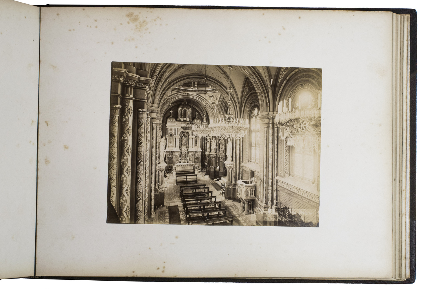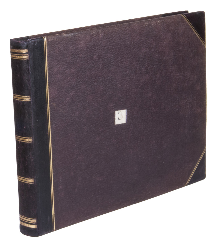[ca. 1885]. Oblong (ca. 38 x 27.5 cm). With 20 albumen prints, 43 plates (engraved and lithographed), and 3 drawings. Contemporary gold-tooled dark purple quarter morocco, brownish-purple pebble-grain cloth sides, with a paper label ("3") mounted on the front. [31] ll.