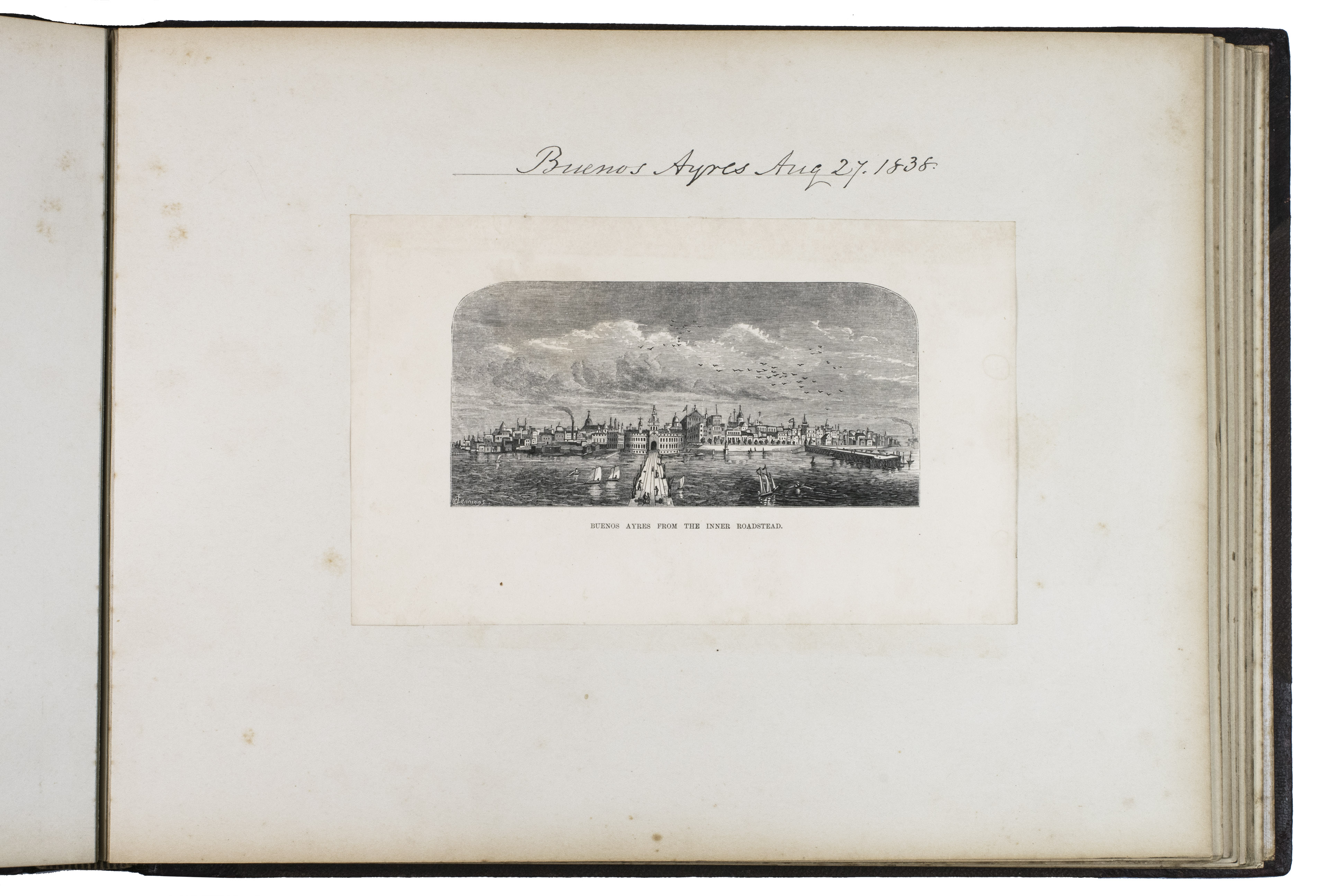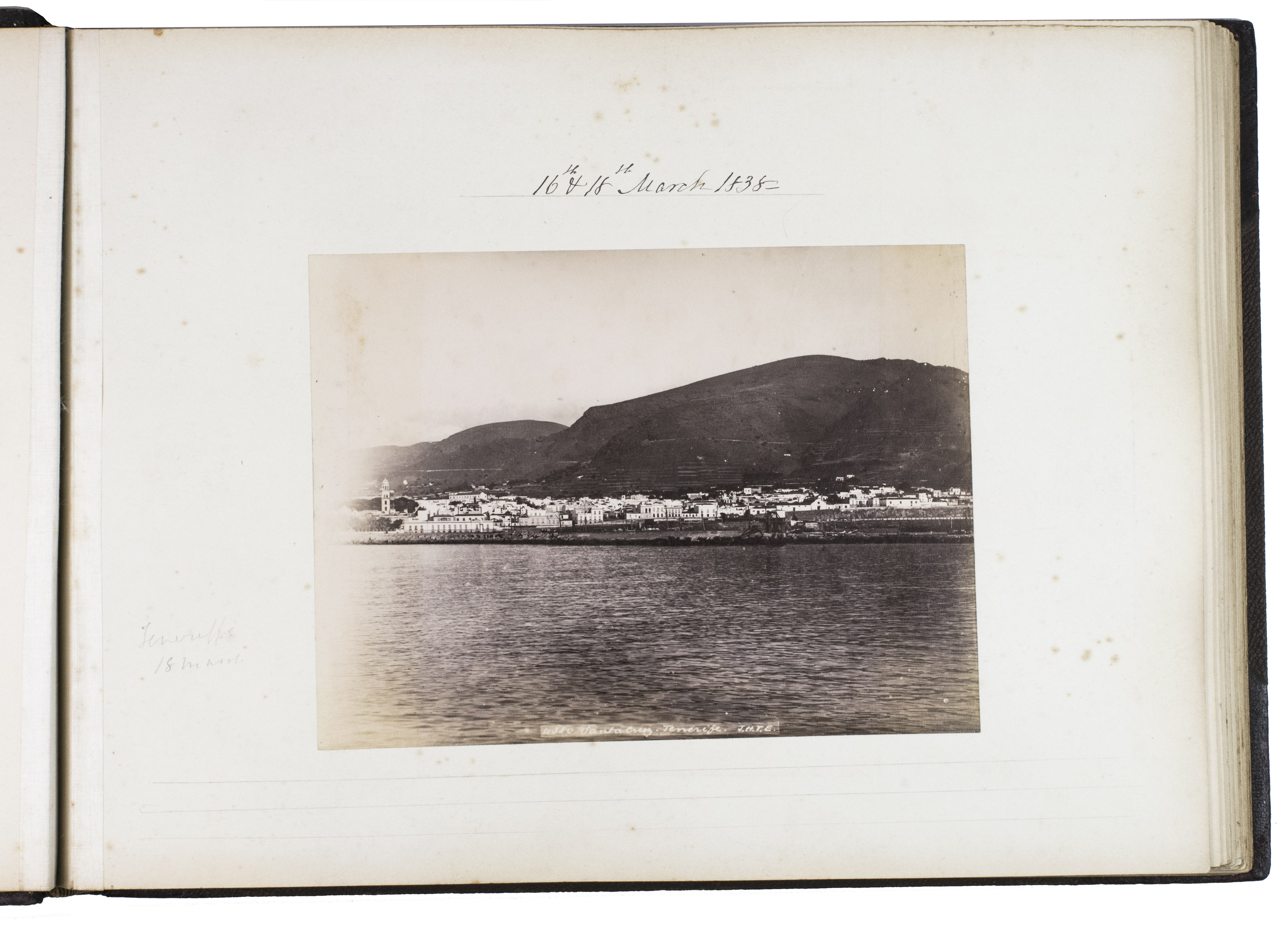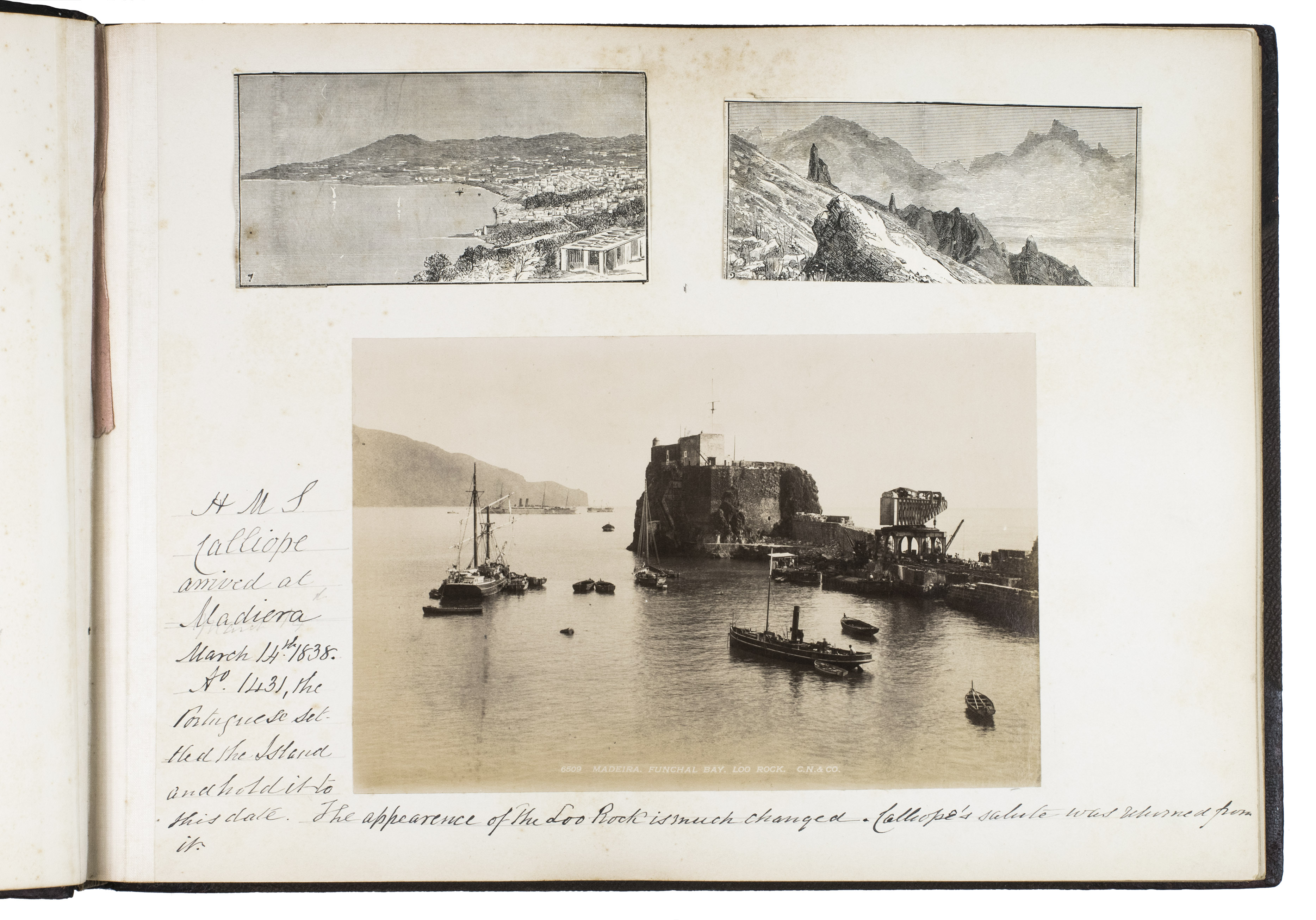 Remarkable album documenting the travels of HMS Calliope (1837-1883), a British warship, in the first few years after her launch. The ship first sailed to Madeira and Tenerife, after which she crossed the Atlantic Ocean to visit various harbour cities in Brazil, Argentina, Uruguay, and Chile. Many of the illustrations and photographs include handwritten annotations about the ship's journey, with the exact dates of when she arrived where. As such, the album was likely compiled by someone who sailed on the ship during these years, possibly a crew member.