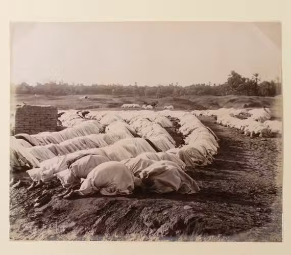Striking image of a large group of Arabic men, dressed in white, engaged in prayer on a field. The large image was likely taken by a photographer who was active in the Middle East in the late 19th-century, but is unfortunately unsigned.