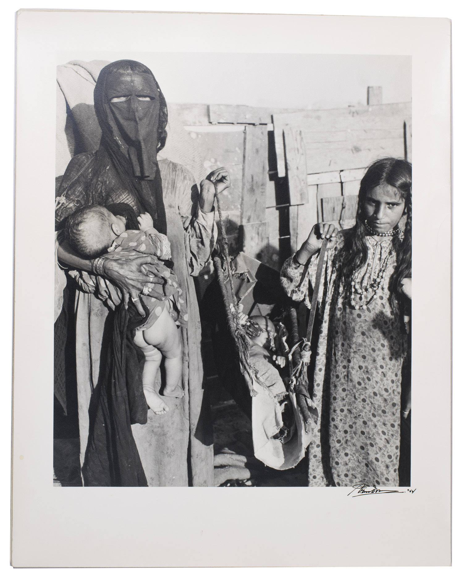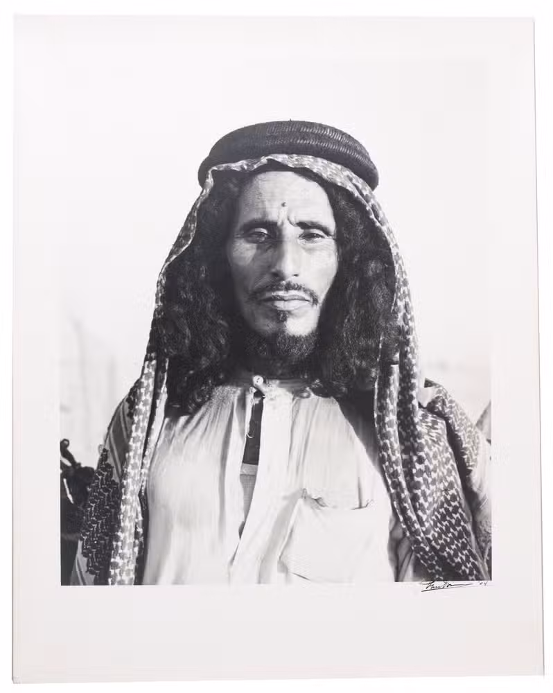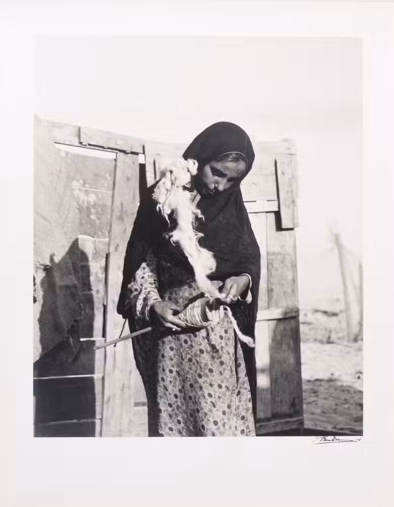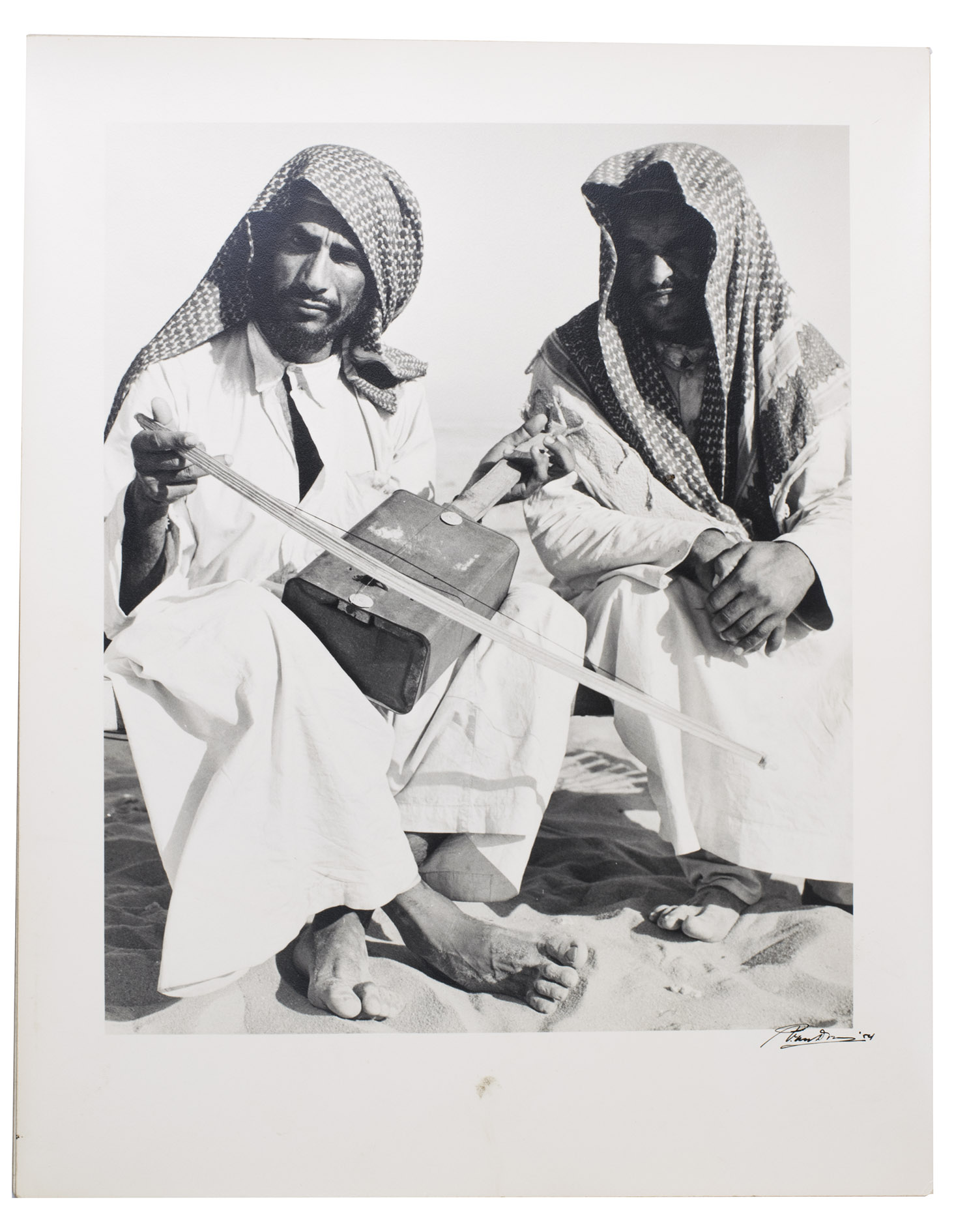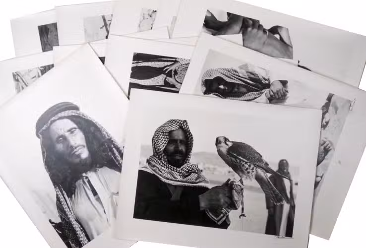 Remarkable collection of twelve photographs, showing daily life of a community in Saudi Arabia or Kuwait in a time before oil wealth. The photographed people are likely all members of the same family. The moving images show the children engaged in wool spinning, playing music on homemade instruments, or posing in front of a wooden shed with their mother. The men are shown playing music and engaged in falconry. The beautifully captured portraits truly offer a glimpse into the lives and personalities of these people. All photographs are signed and dated by hand. They must have been made by a skilled photographer, but the signature is unfortunately unclear.