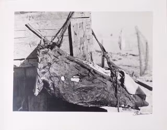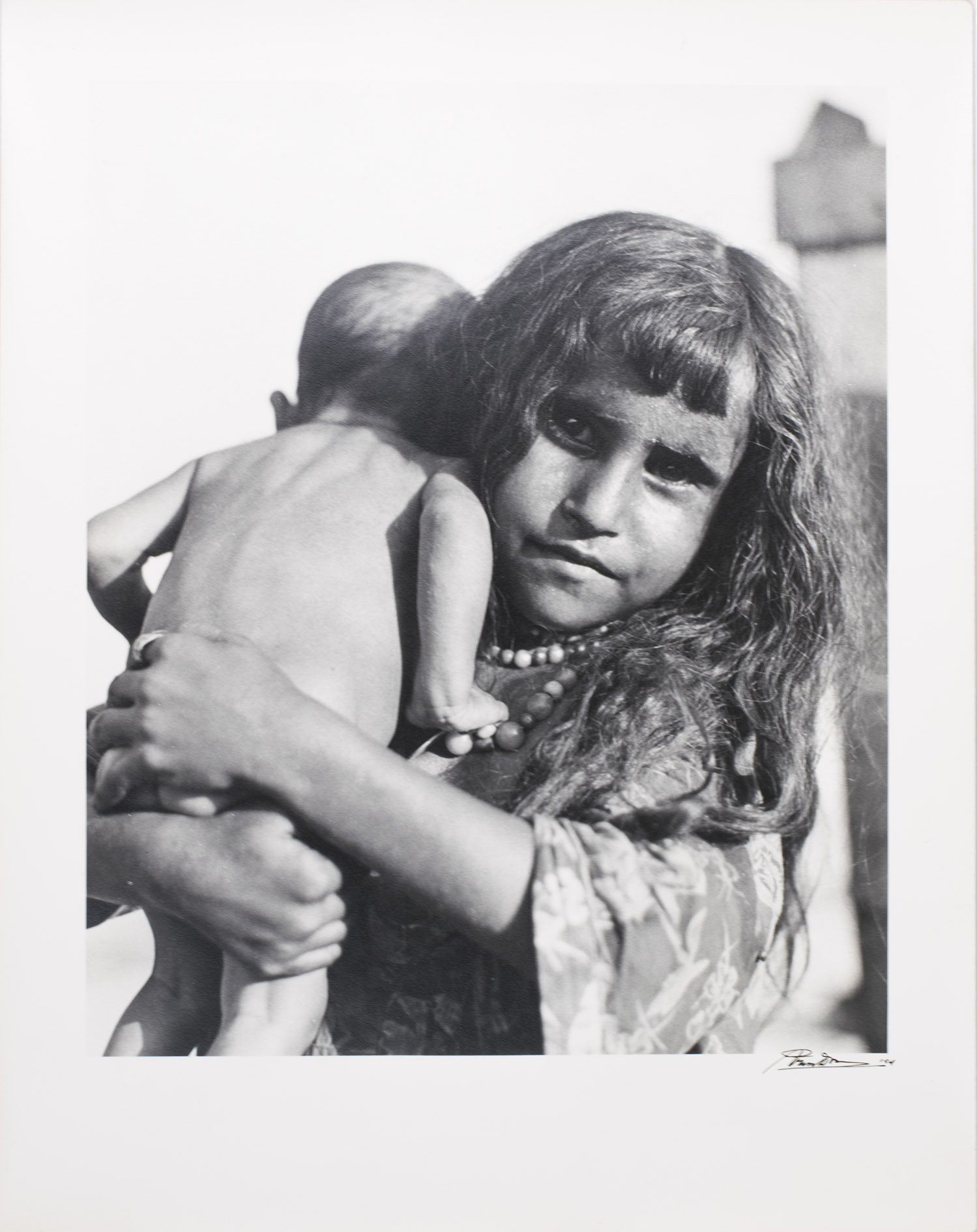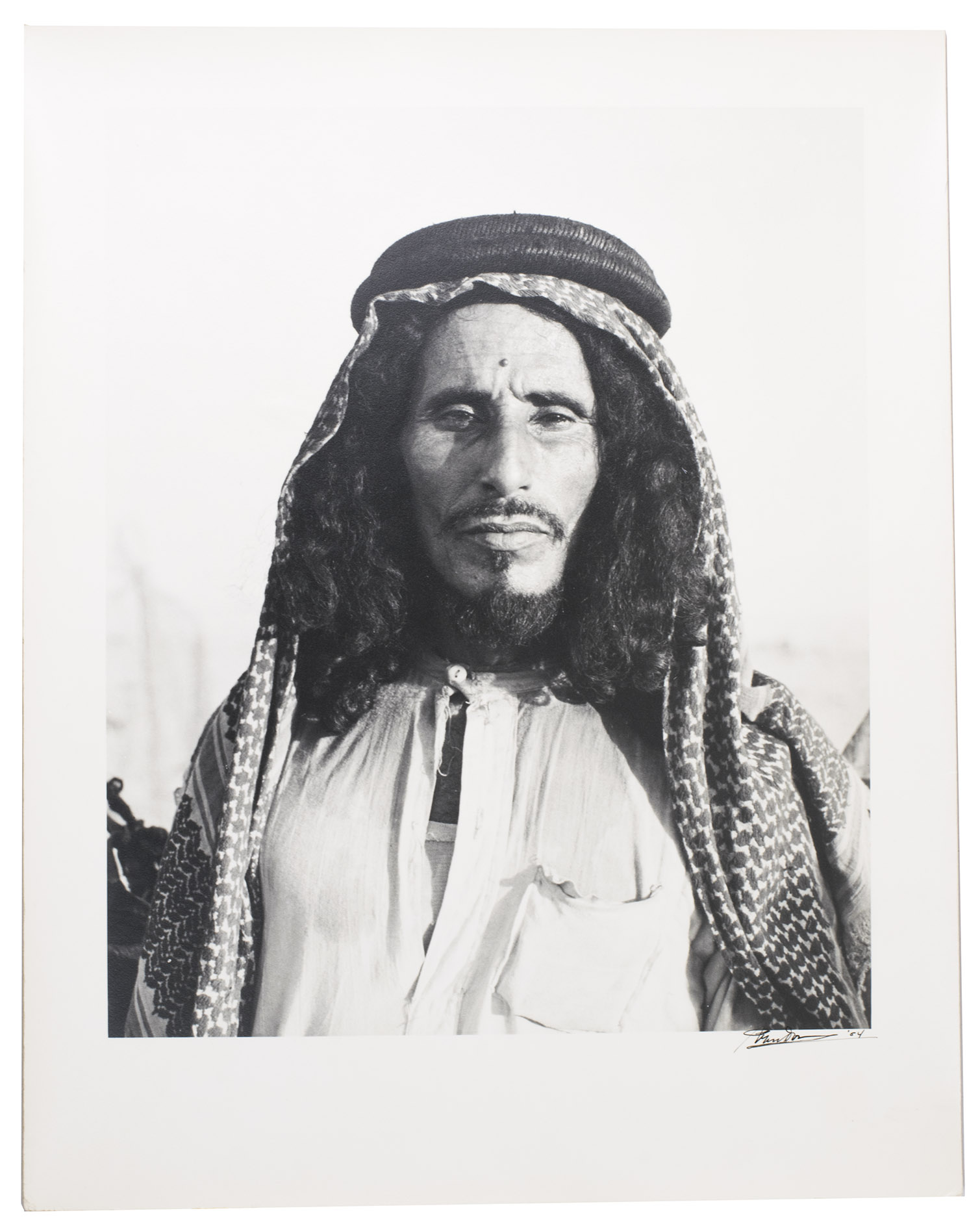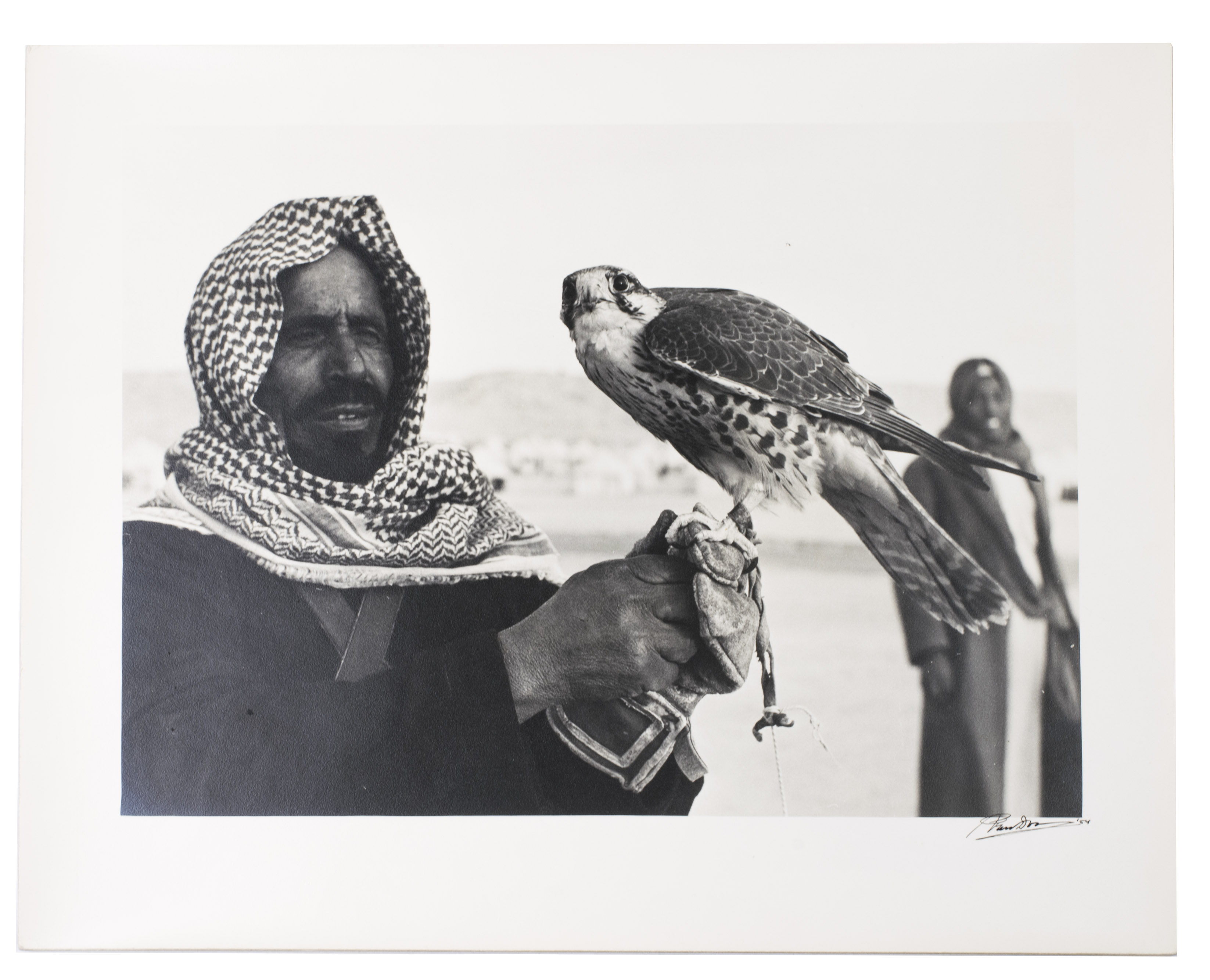 Remarkable collection of twelve photographs, showing daily life of a community in Saudi Arabia or Kuwait in a time before oil wealth. The photographed people are likely all members of the same family. The moving images show the children engaged in wool spinning, playing music on homemade instruments, or posing in front of a wooden shed with their mother. The men are shown playing music and engaged in falconry. The beautifully captured portraits truly offer a glimpse into the lives and personalities of these people. All photographs are signed and dated by hand. They must have been made by a skilled photographer, but the signature is unfortunately unclear.