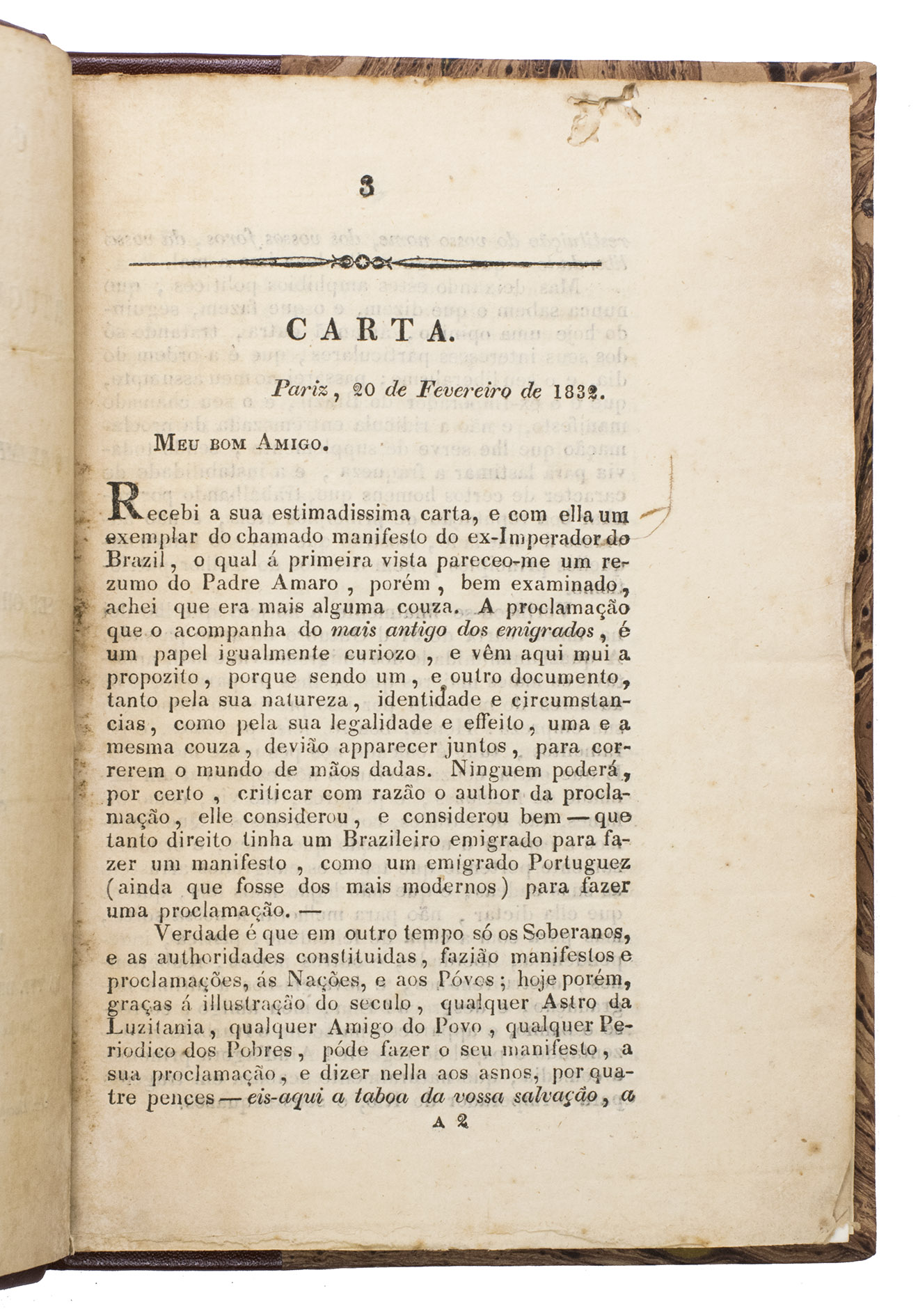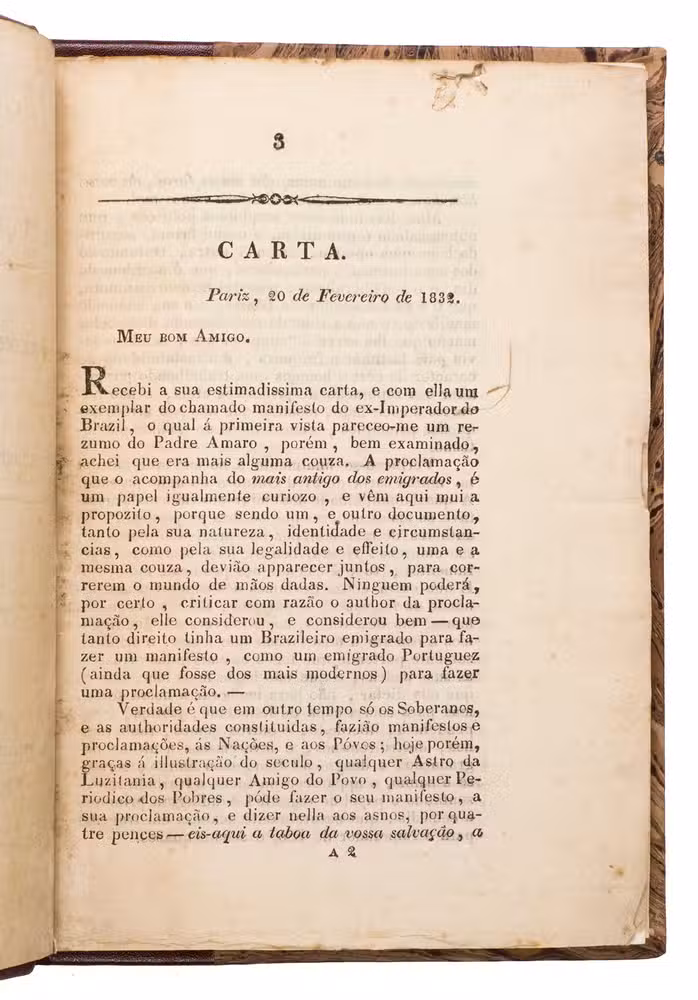This letter - dated Paris, 20 February 1832, addressed to "Meu bom Amigo" (My good friend) and signed "Seu Amigo" (Your friend) - critiques a manifesto by the first Emperor of Brazil, Dom Pedro I (1798-1834), drafted on 2 February 1832. The author begins by acknowledging the receipt of the manifesto, in which Dom Pedro I attempts to reassert his political influence and authority after his abdication in April 1831 in favour of his then 5-year-old son Dom Pedro II. The manifesto appears to be an effort by Dom Pedro I to reclaim power, despite having previously renounced it, by declaring himself regent of his son and seeking to be proclaimed as king. The author criticises Dom Pedro I's hypocrisy and contradictions; his attempt to return to power is seen by the author as a betrayal of the emperor's previous decisions. The author is particularly outraged by how Dom Pedro I, after promising to uphold the Charter, undermines it by claiming regency, thus betraying the very principles he swore to protect.