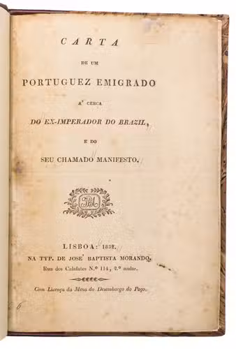 Extremely rare publication written in the form of a letter by an anonymous author, who may have been the Portuguese military officer and politician Rodrigo Pinto Pizarro Pimentel de Almeida Carvalhais (1788-1841). The attribution is based on Borba de Moraes' note concerning this title, mentioning that he consulted the copy in the National Library of Brazil which contains the following manuscript inscription on the last page: "He Pizarro o autor desta Carta, o qual sendo nomeado p. Ministro d'estado do Ex-Imperador, este passado tempos o depoz; e lhe prohibido por hum decreto a sua entrada em Portugal".