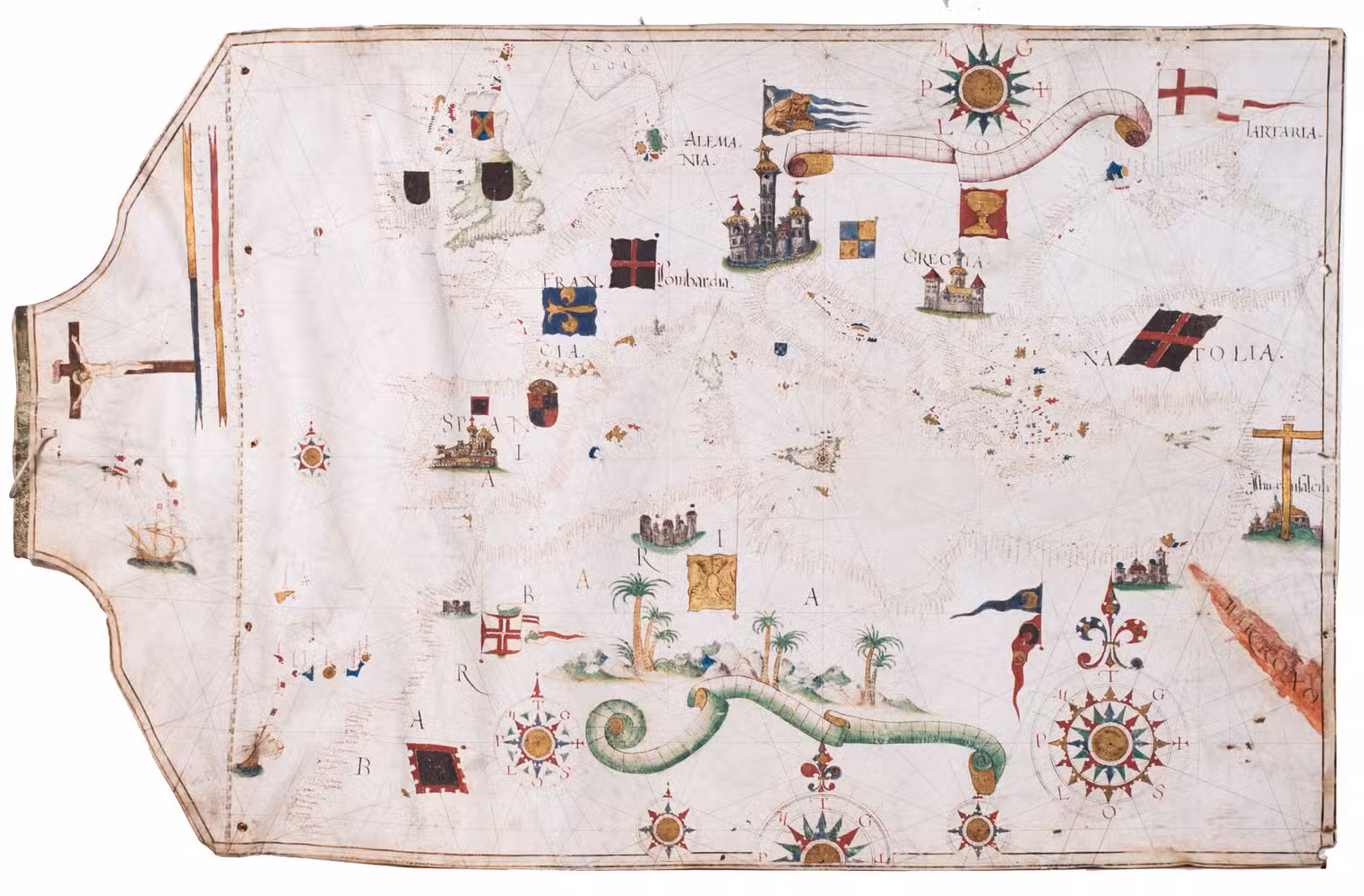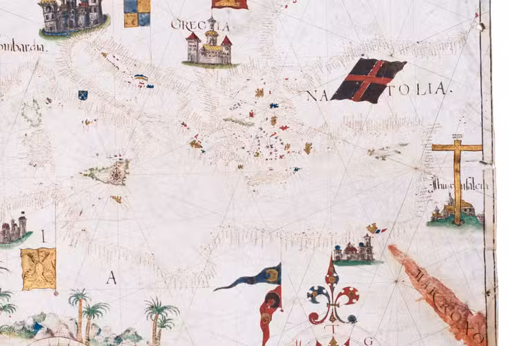 Portolan charts have existed since the 13th century, with the earliest known examples dating to the second half of the 14th century. Originally, they served as tools for coastal navigation in the Mediterranean and Atlantic, providing a European-centred understanding of the known world. Charts intended for practical navigation typically left inland areas blank, whereas luxury examples such as this one feature elaborate decoration and symbolic embellishments.