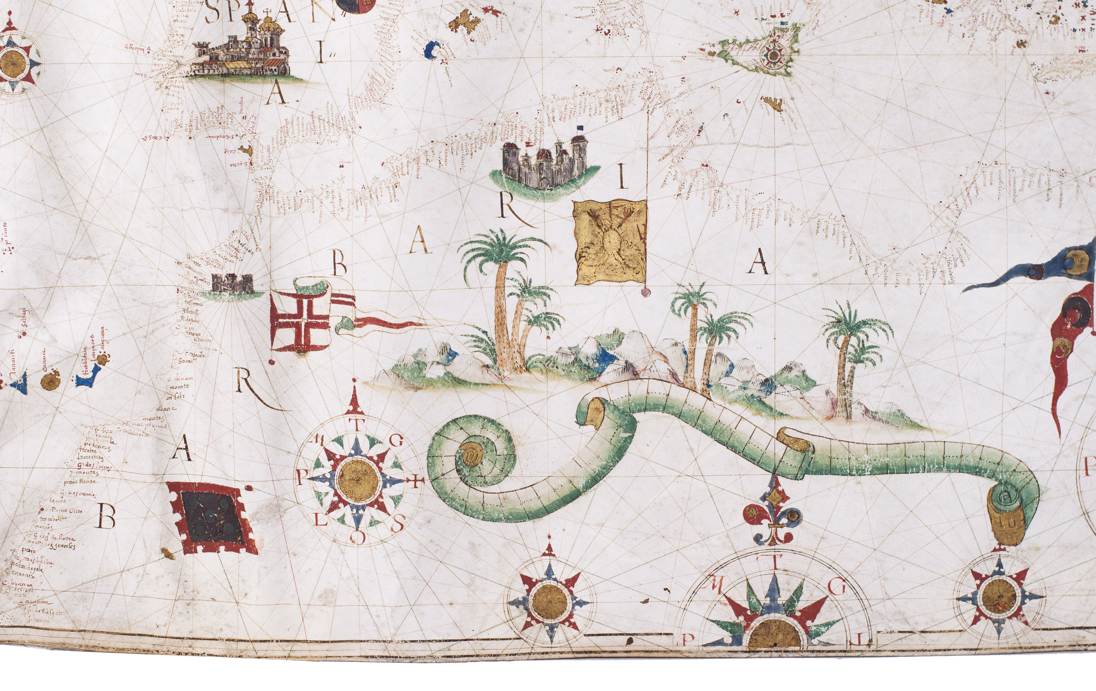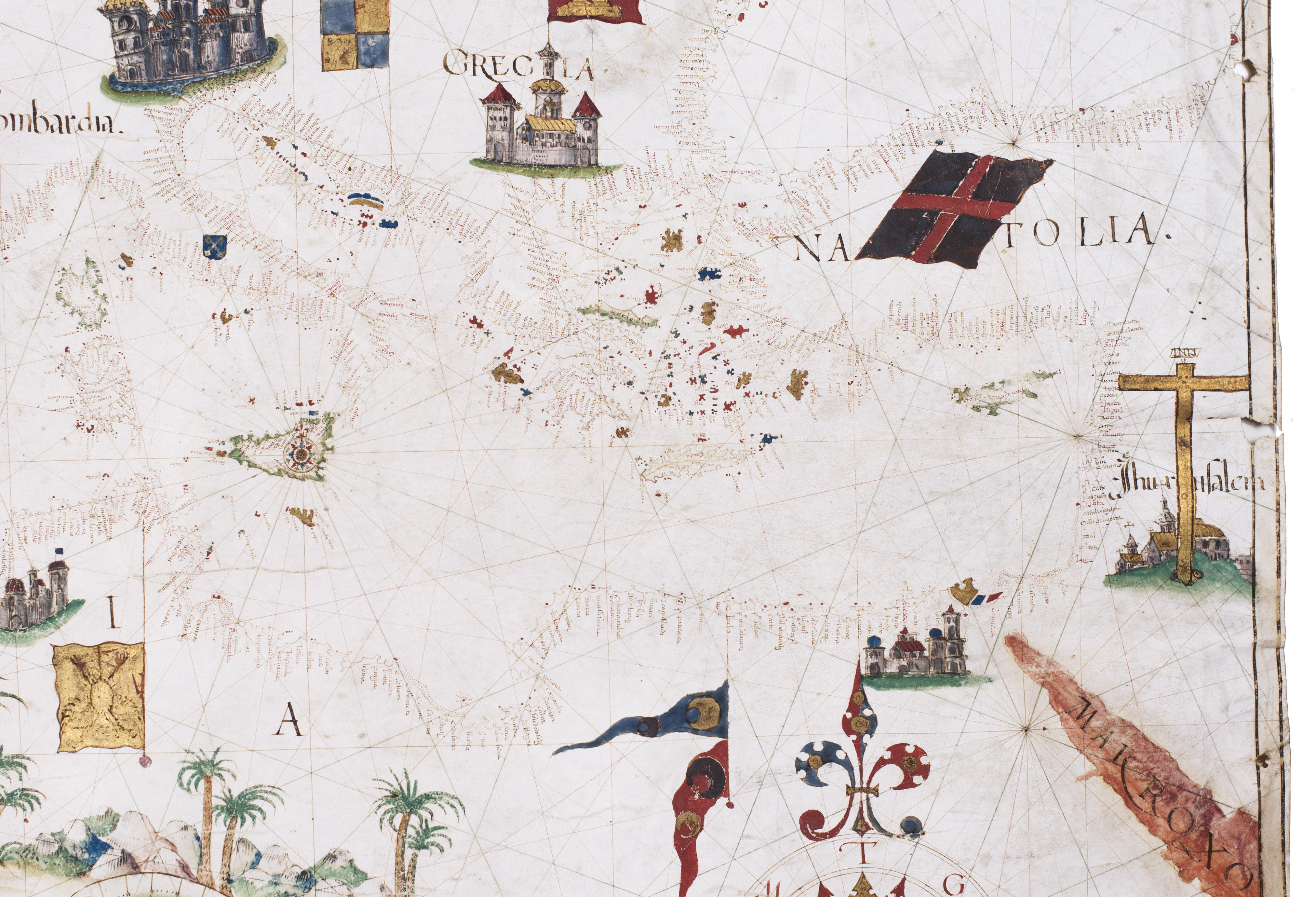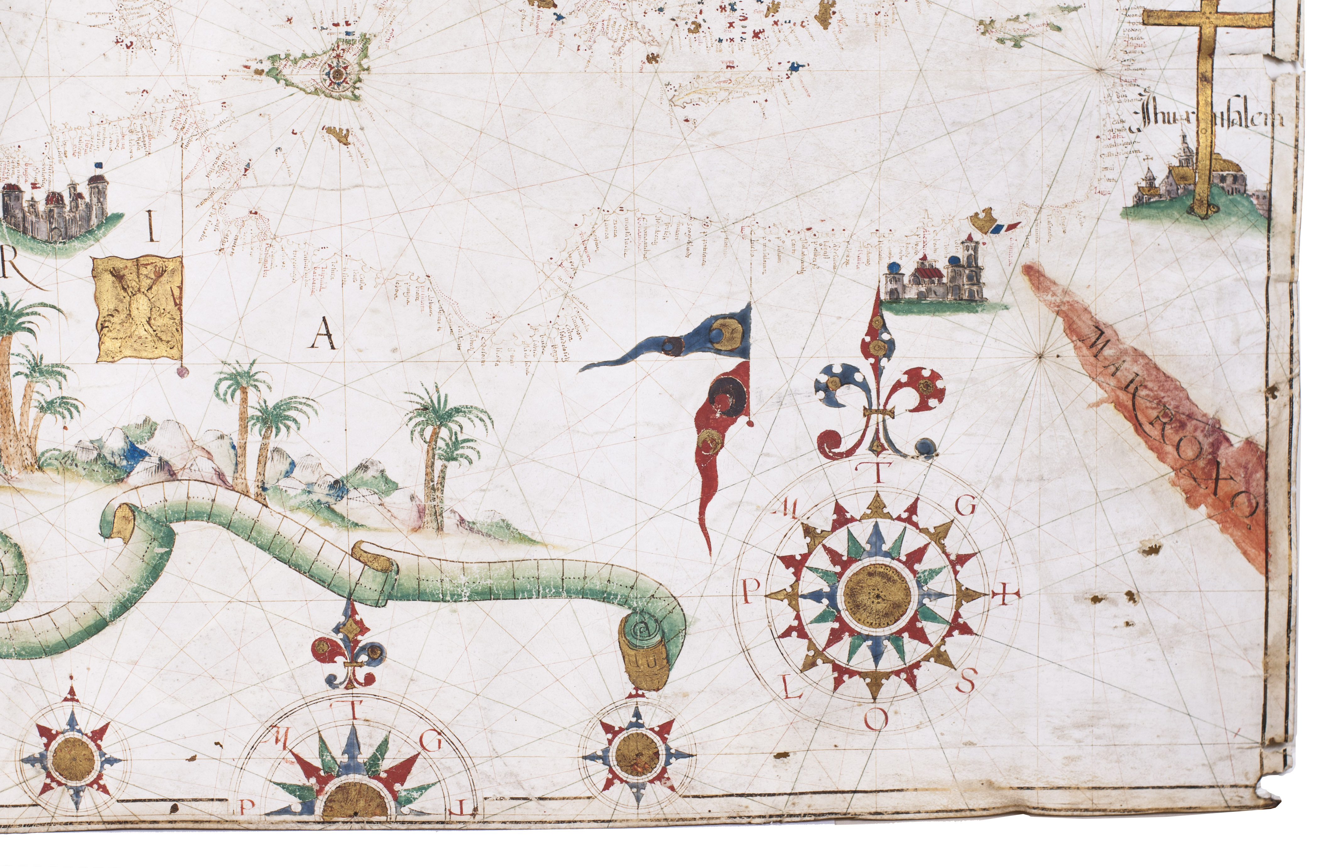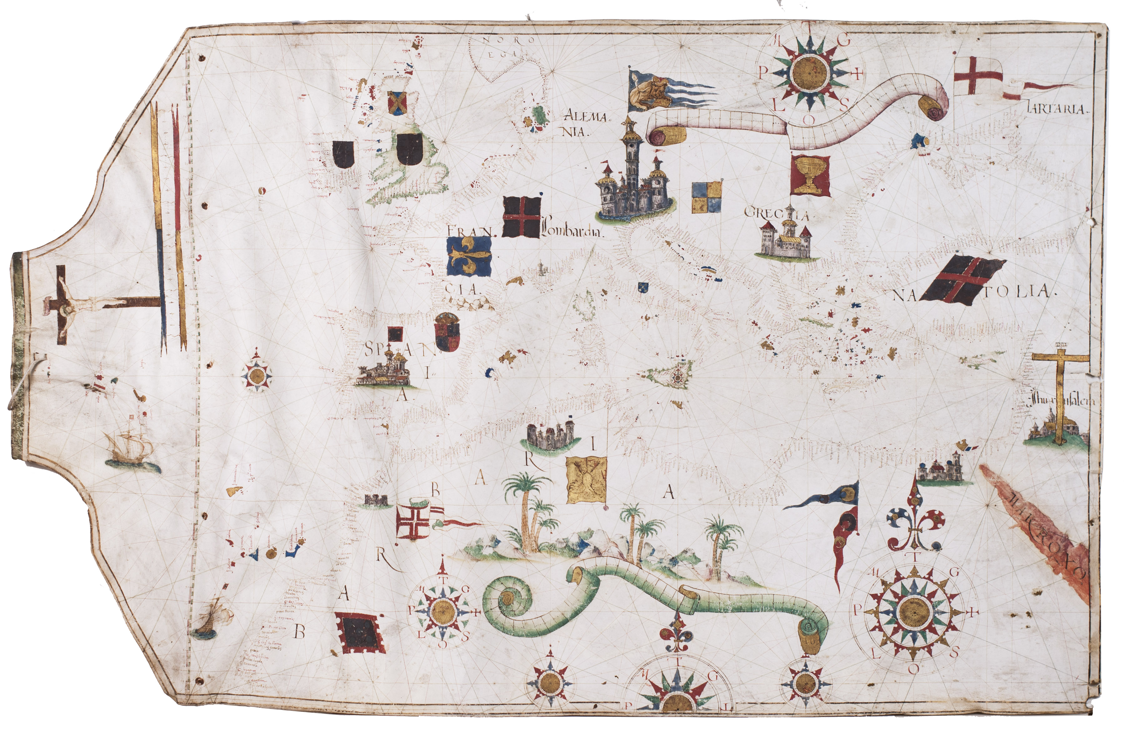 As typical of portolans produced in the Iberian Peninsula during the period of the Iberian Union, the chart is richly embellished. It depicts the desert-like yet greenish landscapes of North Africa, the castles of Spain and Germany, and the Cross over Jerusalem, among other features. Coastlines are drawn in reddish ink; smaller islands are fully painted in gold, blue, red, or green, while major islands are outlined in green. No rivers are indicated. Toponyms, names of cities and towns, are rendered in red and black ink, numbering over 800 coastal place names.