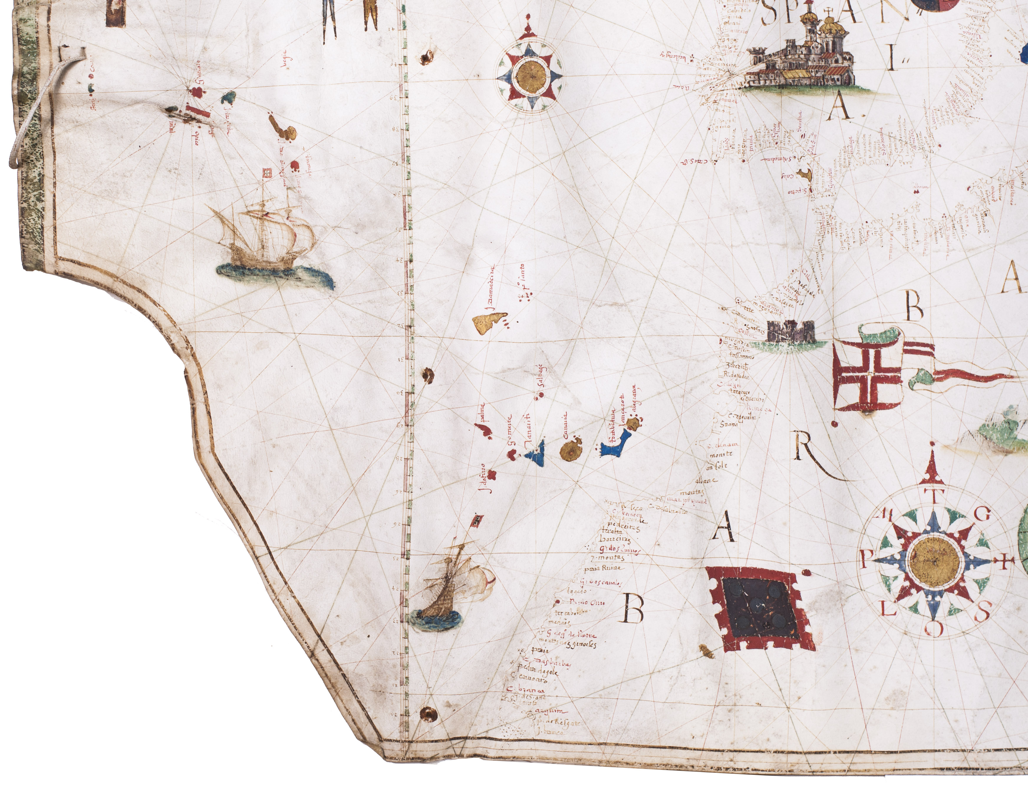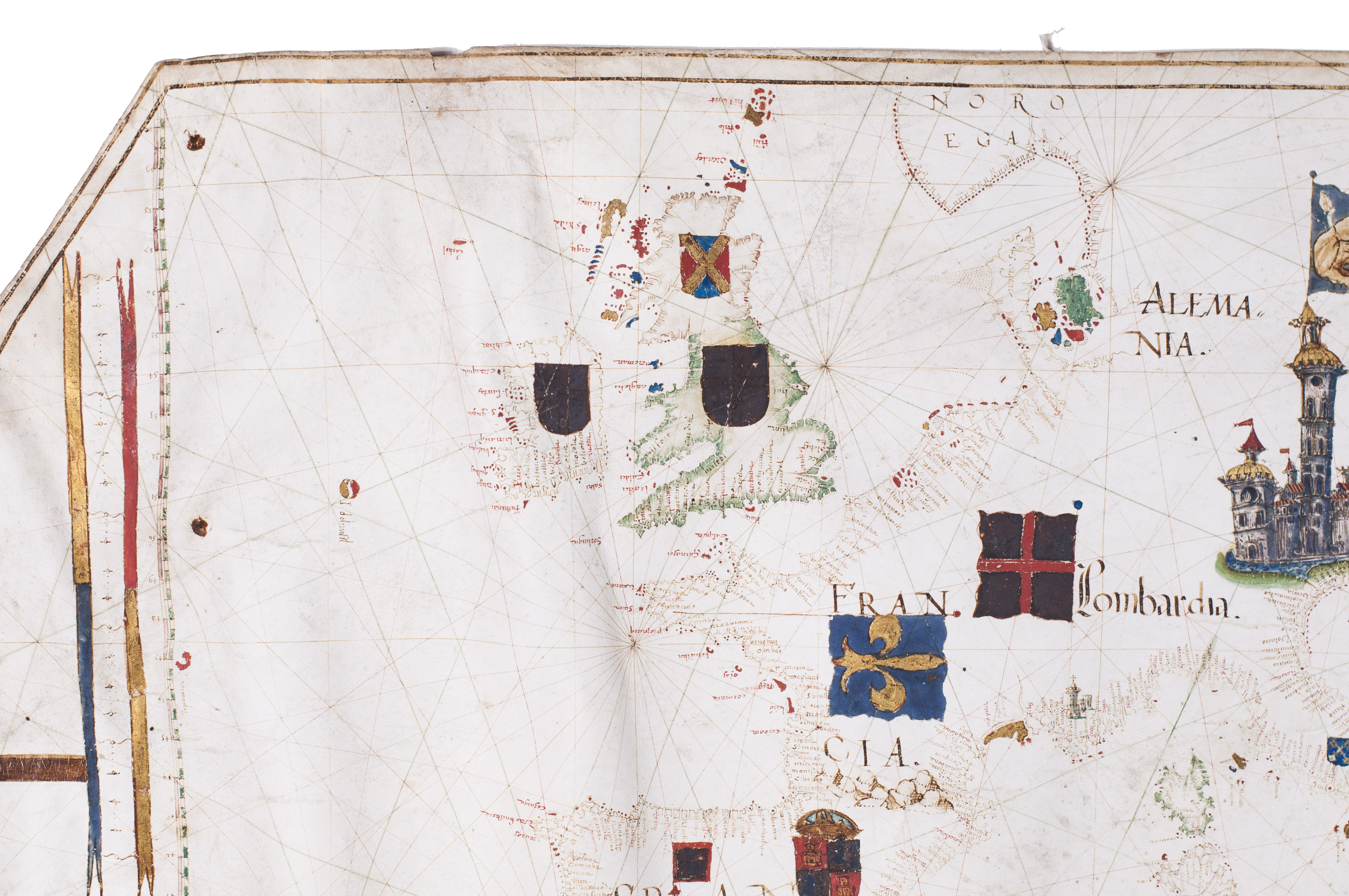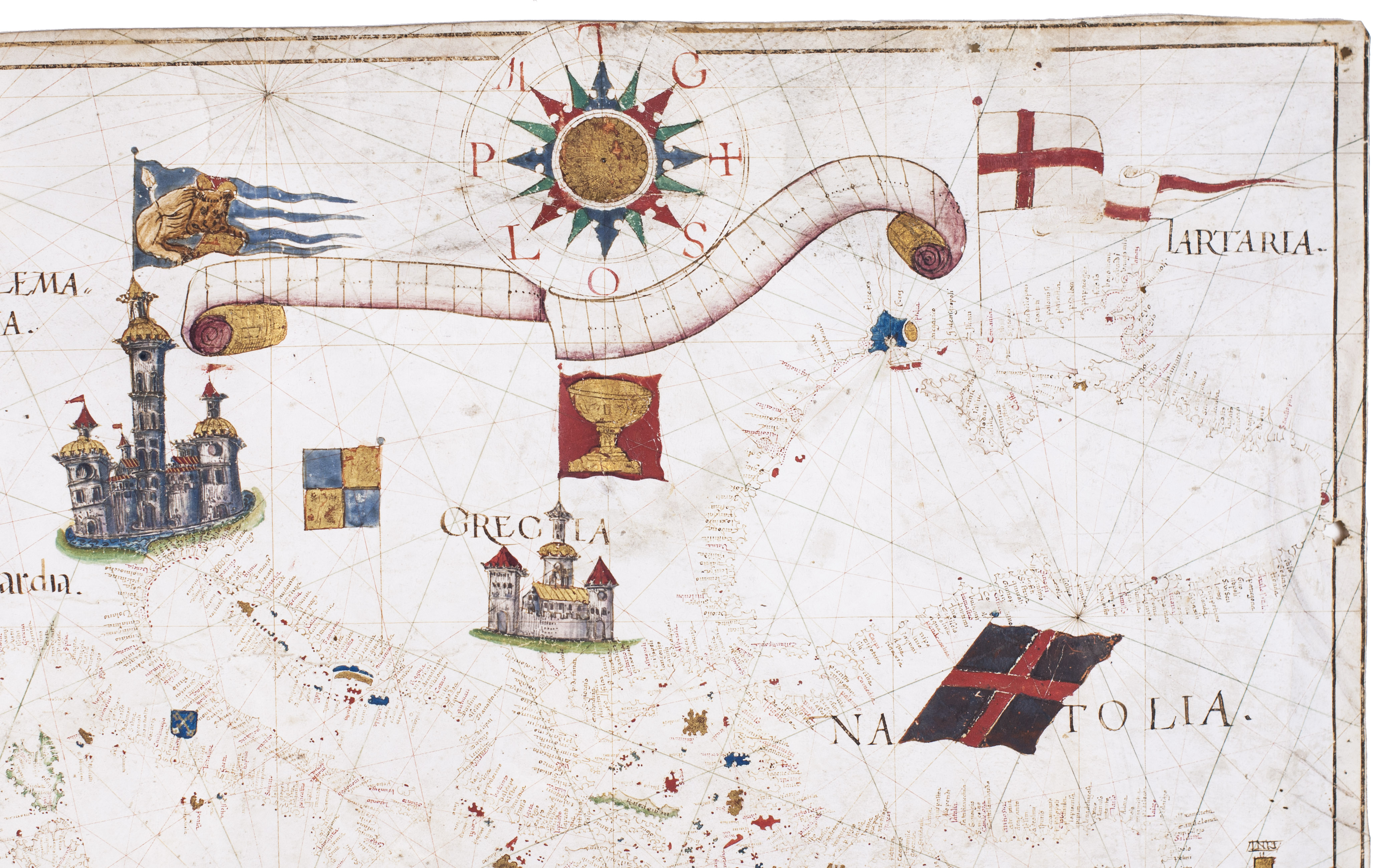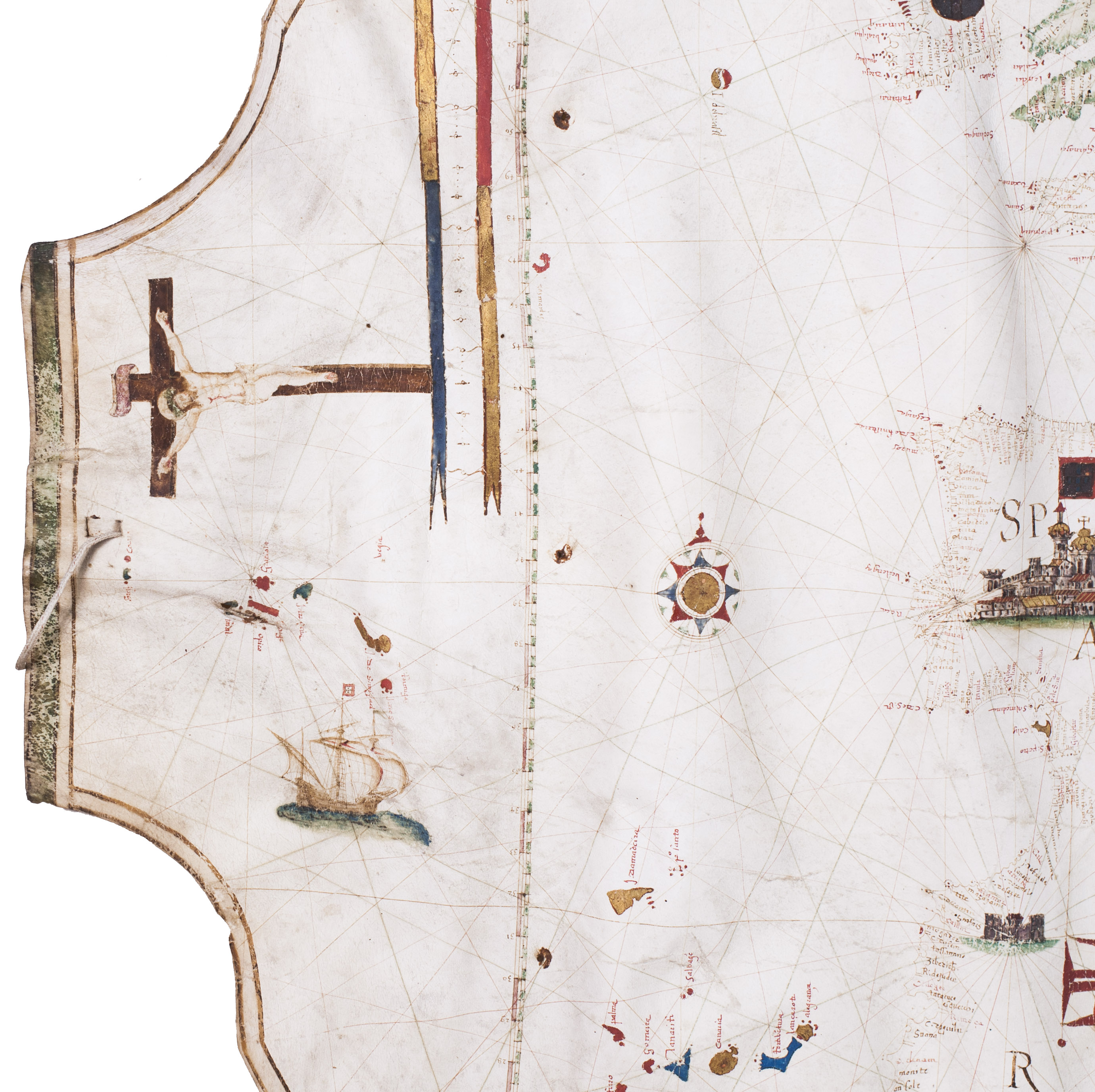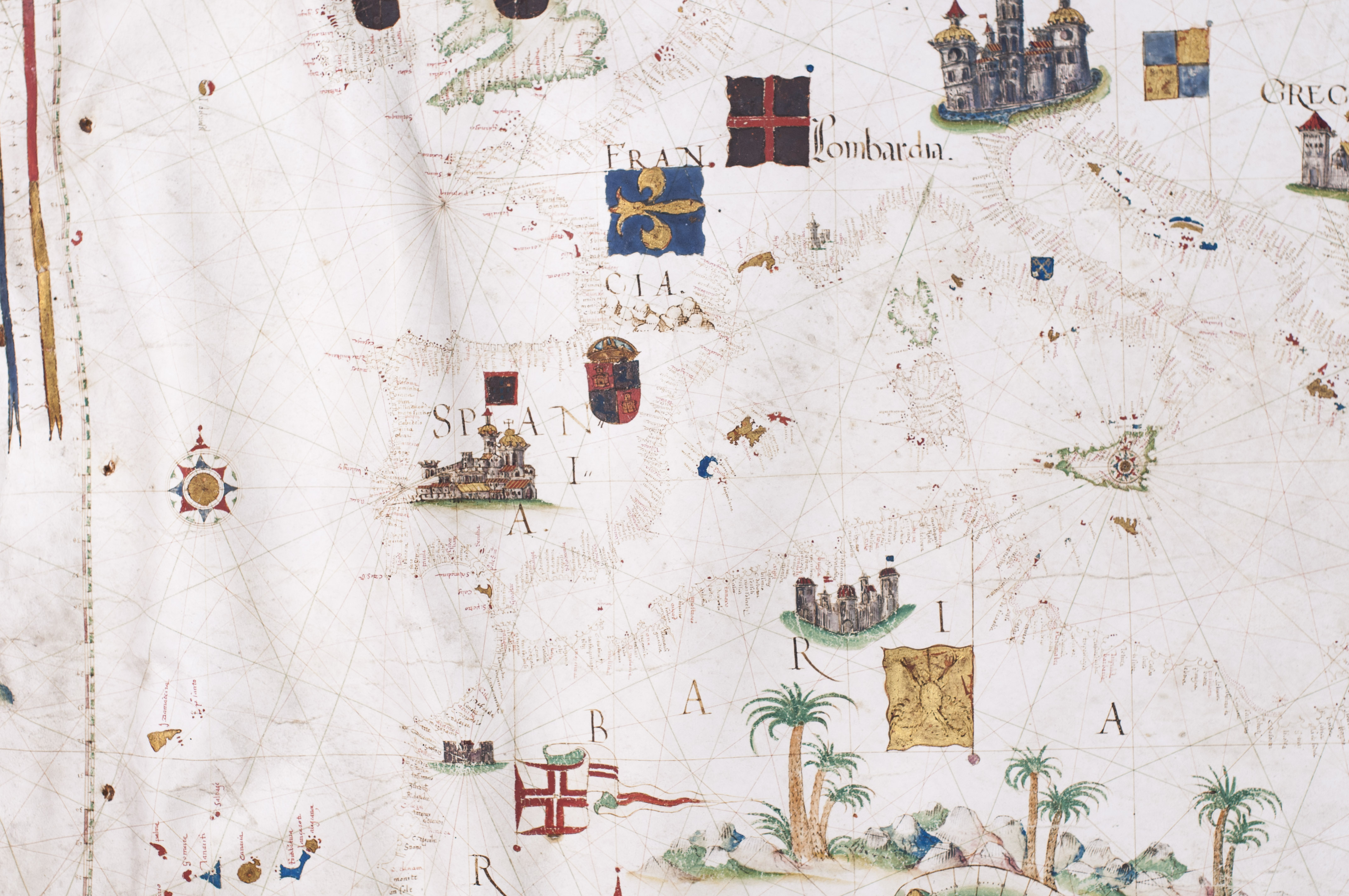 As typical of portolans produced in the Iberian Peninsula during the period of the Iberian Union, the chart is richly embellished. It depicts the desert-like yet greenish landscapes of North Africa, the castles of Spain and Germany, and the Cross over Jerusalem, among other features. Coastlines are drawn in reddish ink; smaller islands are fully painted in gold, blue, red, or green, while major islands are outlined in green. No rivers are indicated. Toponyms, names of cities and towns, are rendered in red and black ink, numbering over 800 coastal place names.