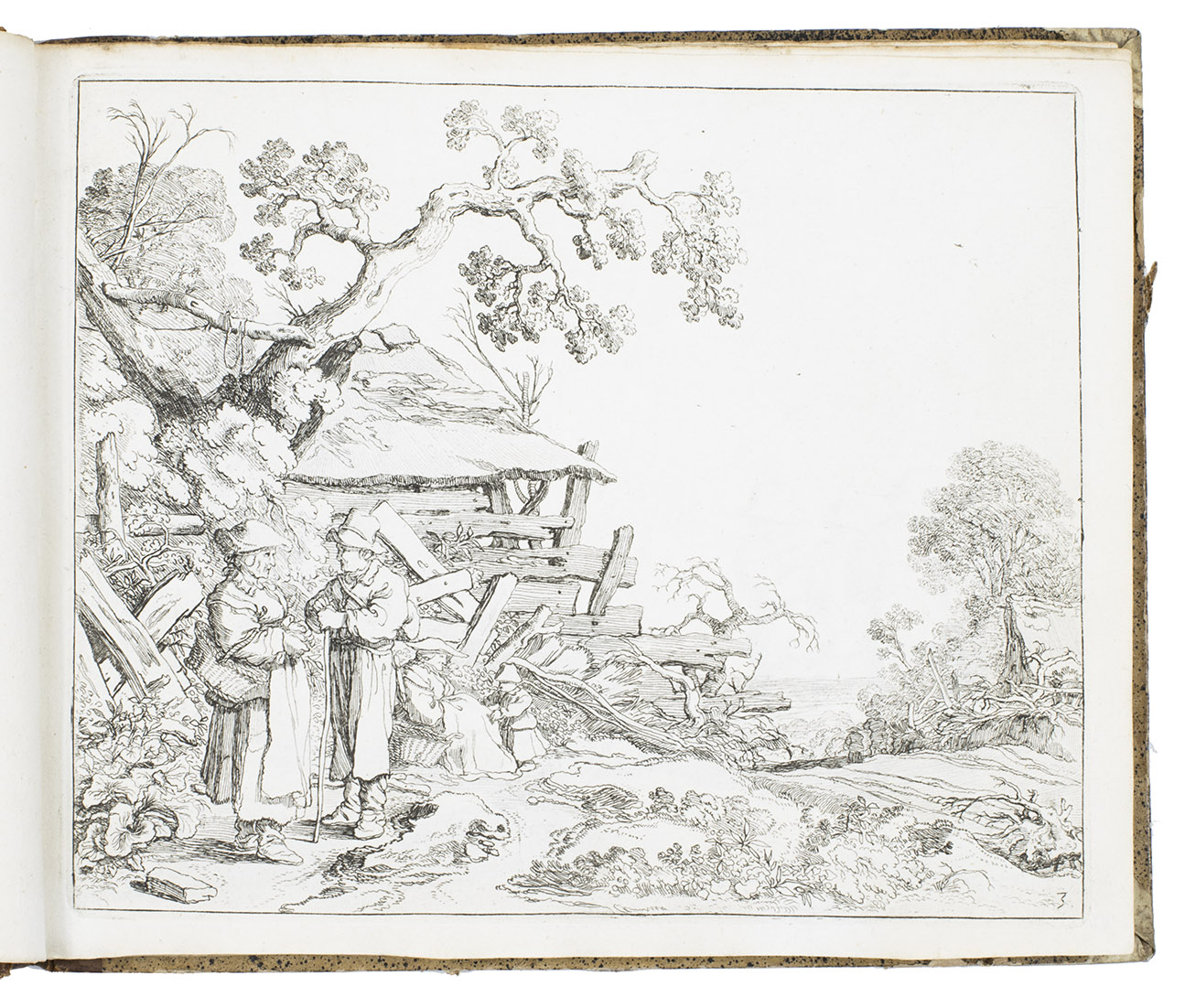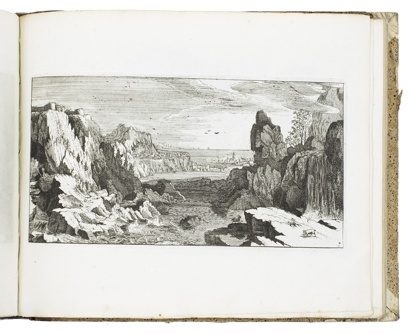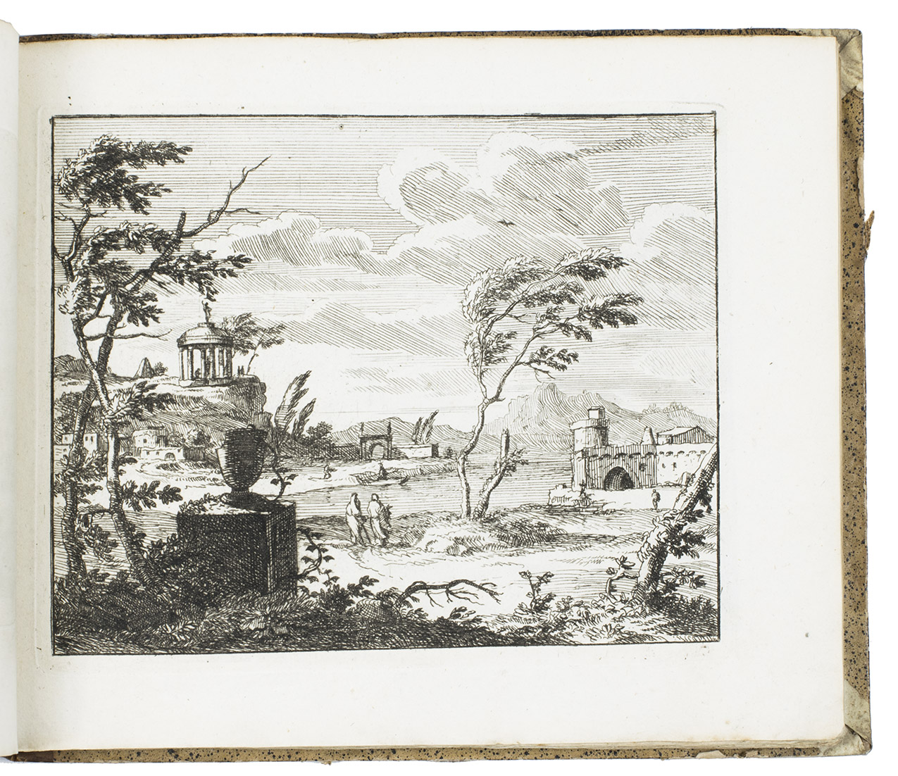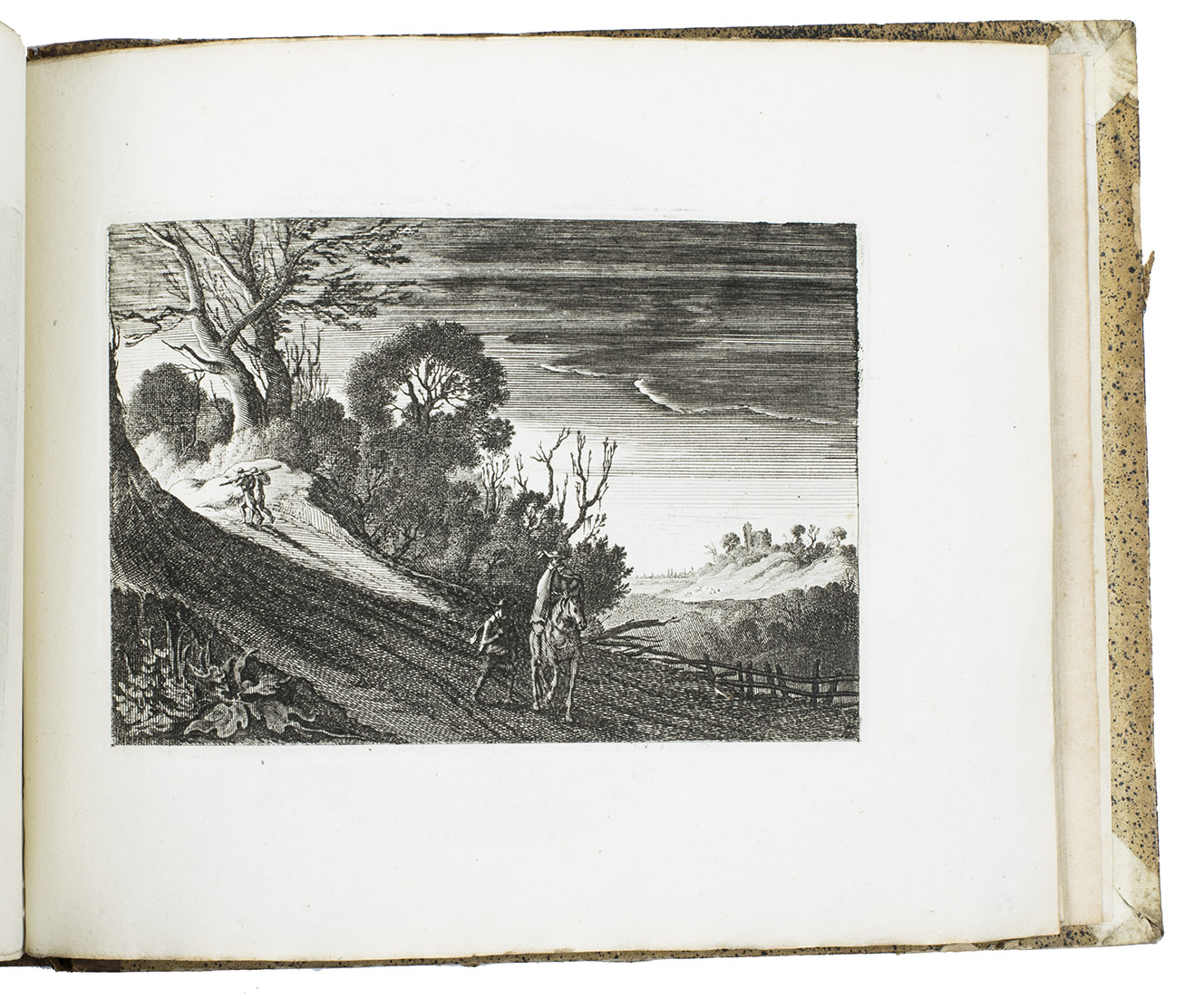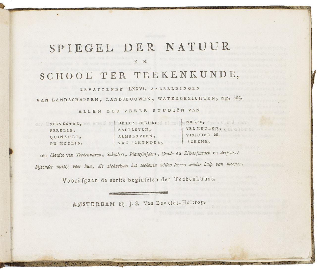 Very rare drawing manual with exceptionally fine plates by mainly 17th-century old masters. The confirmed artists of the prints are: Jan van Almeloveen, Cornelis Danckerts (I), Pieter de Molijn, Nicolas Perelle, Gillis van Scheyndel (I), Claes Jansz. Visscher (I). Furthermore the title-page names Silvestre, Quinault, Della Bella, Nolpe, Schenk and Vermeulen, which we could not confirm. Possibly several prints in this album are unknown works by these masters. The signatures and marks were erased from the plates, making these prints all new states. Only the first 10 plates are typical instructional illustrations, showing the basics of geometry and anatomy. The other 66 are all high quality engravings and etchings by the most renowned Dutch and international old masters. These served the readers as examples for drawing. The plates are of remarkable high quality, especially for a manual, the imprints are very fresh and well inked. They show beautiful and professional drawing models of finished landscapes, seascapes, architectural and other views, genre pieces, etc. The plates are of various sizes and forms, several circular, and also of various styles, both in design and in the art of engraving, several including the use of chiaroscuro. A short introduction and explanation of the first 6 "onderwysplaatjens" (teaching plates) is present. On verso of the title-page a motto from Formey is given: "Men kan zichzelven onderwijzen in het teekenen van eenige kleene voorwerpen: vooral van landschappen" (One can teach oneself the drawing of some small objects: especially of landscapes).