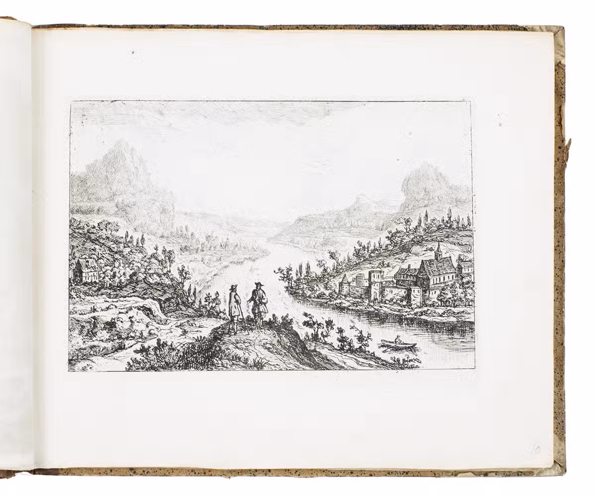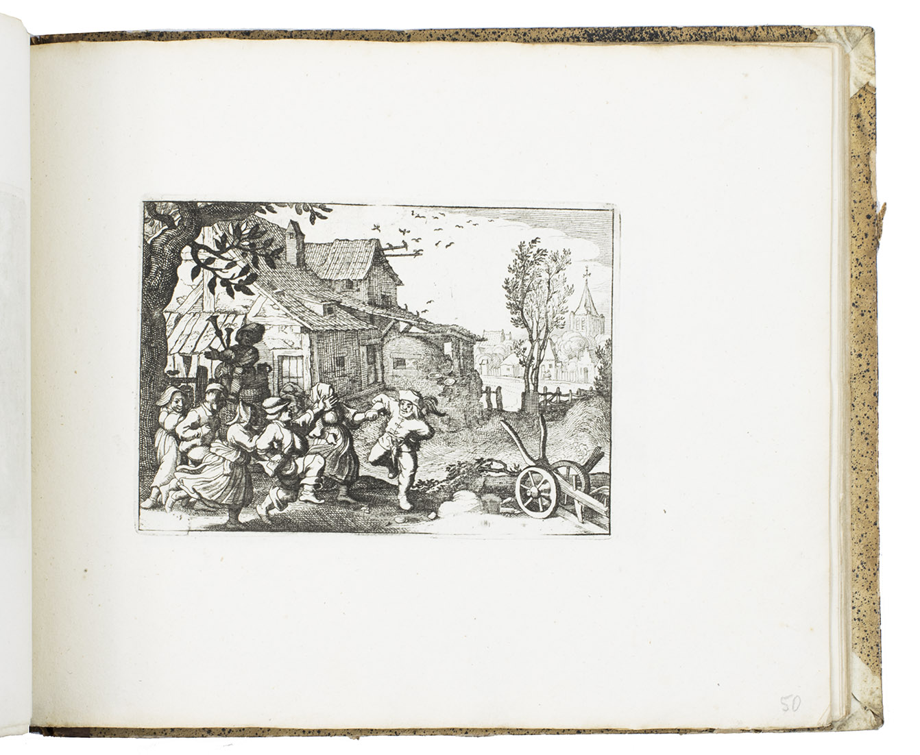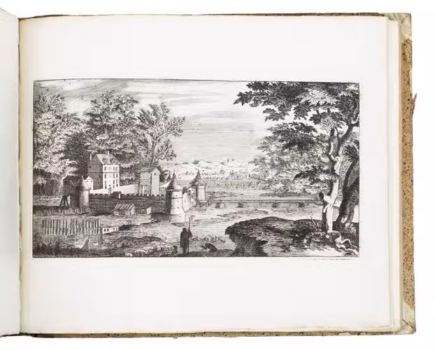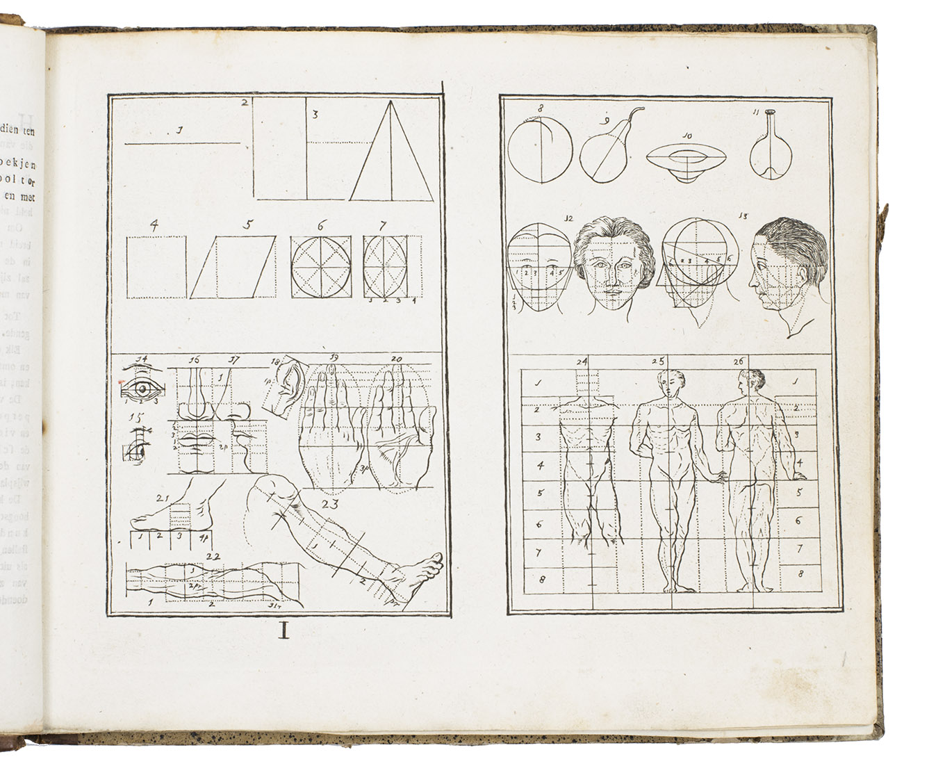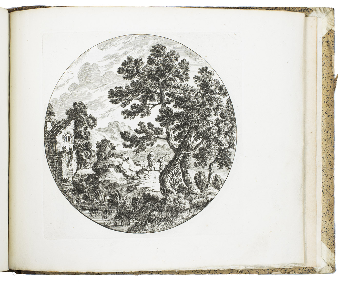 Very rare drawing manual with exceptionally fine plates by mainly 17th-century old masters. The confirmed artists of the prints are: Jan van Almeloveen, Cornelis Danckerts (I), Pieter de Molijn, Nicolas Perelle, Gillis van Scheyndel (I), Claes Jansz. Visscher (I). Furthermore the title-page names Silvestre, Quinault, Della Bella, Nolpe, Schenk and Vermeulen, which we could not confirm. Possibly several prints in this album are unknown works by these masters. The signatures and marks were erased from the plates, making these prints all new states. Only the first 10 plates are typical instructional illustrations, showing the basics of geometry and anatomy. The other 66 are all high quality engravings and etchings by the most renowned Dutch and international old masters. These served the readers as examples for drawing. The plates are of remarkable high quality, especially for a manual, the imprints are very fresh and well inked. They show beautiful and professional drawing models of finished landscapes, seascapes, architectural and other views, genre pieces, etc. The plates are of various sizes and forms, several circular, and also of various styles, both in design and in the art of engraving, several including the use of chiaroscuro. A short introduction and explanation of the first 6 "onderwysplaatjens" (teaching plates) is present. On verso of the title-page a motto from Formey is given: "Men kan zichzelven onderwijzen in het teekenen van eenige kleene voorwerpen: vooral van landschappen" (One can teach oneself the drawing of some small objects: especially of landscapes).
