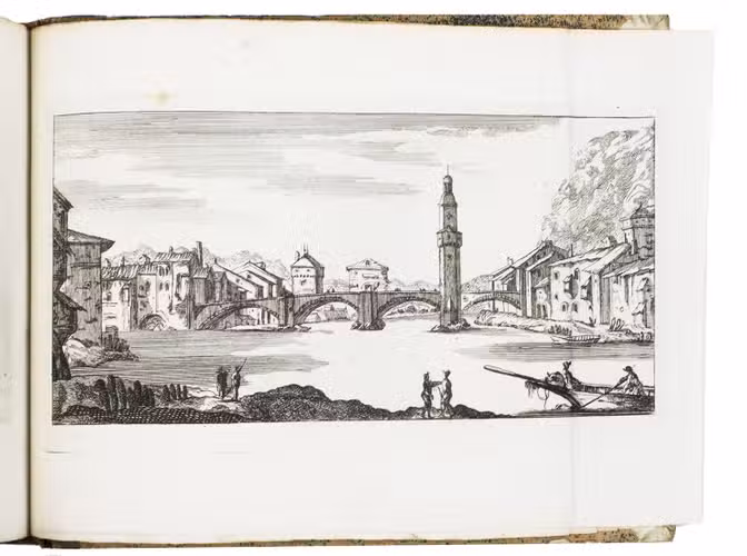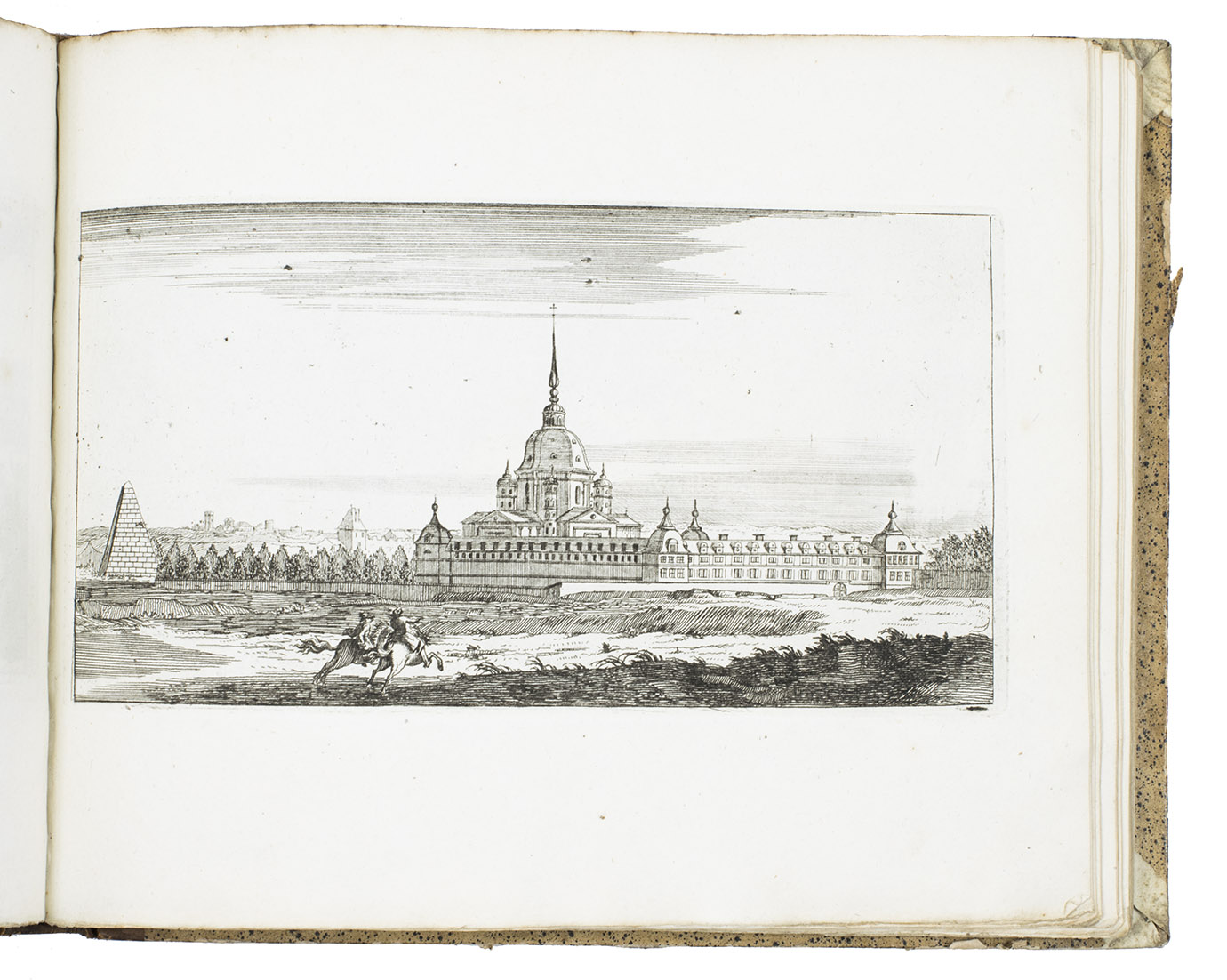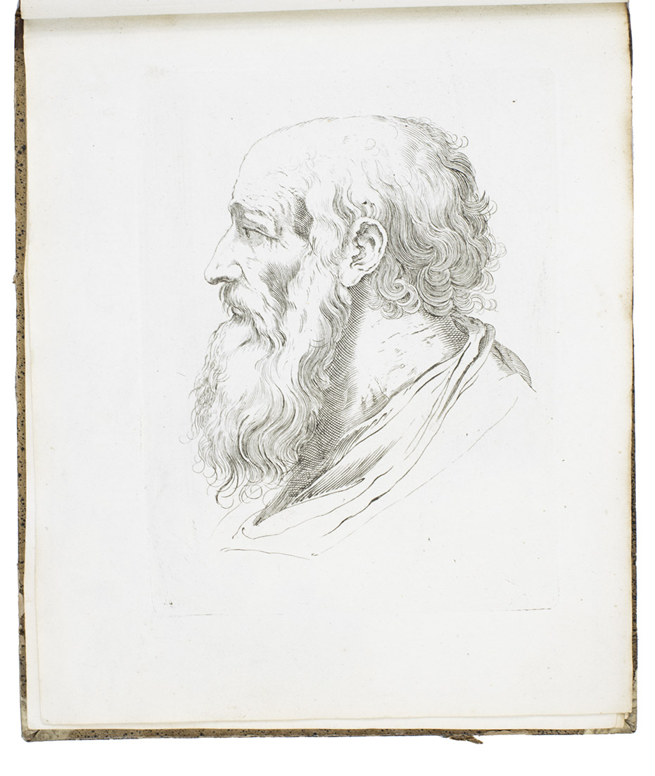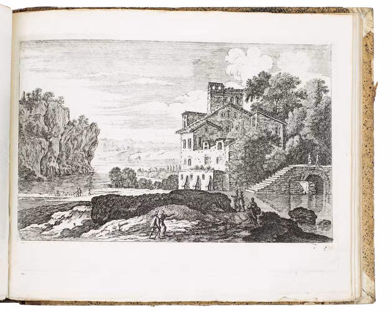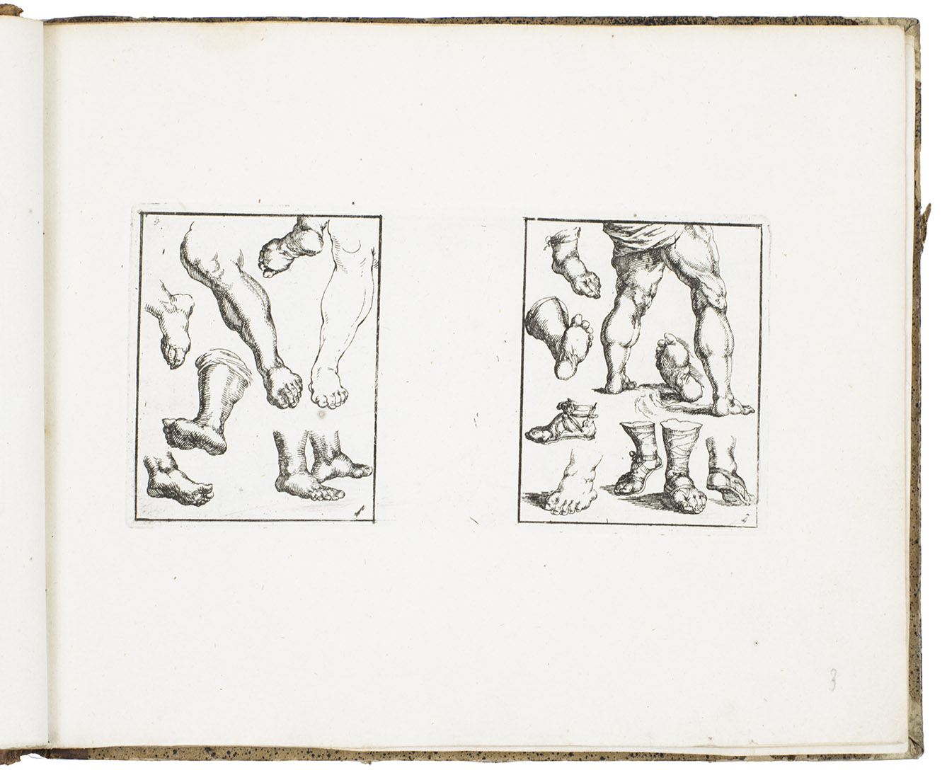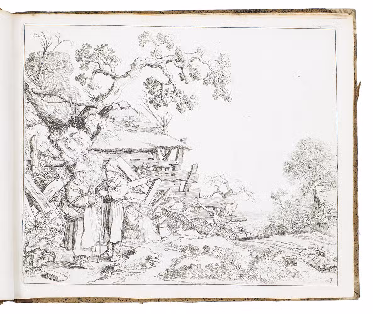 Very rare drawing manual with exceptionally fine plates by mainly 17th-century old masters. The confirmed artists of the prints are: Jan van Almeloveen, Cornelis Danckerts (I), Pieter de Molijn, Nicolas Perelle, Gillis van Scheyndel (I), Claes Jansz. Visscher (I). Furthermore the title-page names Silvestre, Quinault, Della Bella, Nolpe, Schenk and Vermeulen, which we could not confirm. Possibly several prints in this album are unknown works by these masters. The signatures and marks were erased from the plates, making these prints all new states. Only the first 10 plates are typical instructional illustrations, showing the basics of geometry and anatomy. The other 66 are all high quality engravings and etchings by the most renowned Dutch and international old masters. These served the readers as examples for drawing. The plates are of remarkable high quality, especially for a manual, the imprints are very fresh and well inked. They show beautiful and professional drawing models of finished landscapes, seascapes, architectural and other views, genre pieces, etc. The plates are of various sizes and forms, several circular, and also of various styles, both in design and in the art of engraving, several including the use of chiaroscuro. A short introduction and explanation of the first 6 "onderwysplaatjens" (teaching plates) is present. On verso of the title-page a motto from Formey is given: "Men kan zichzelven onderwijzen in het teekenen van eenige kleene voorwerpen: vooral van landschappen" (One can teach oneself the drawing of some small objects: especially of landscapes).