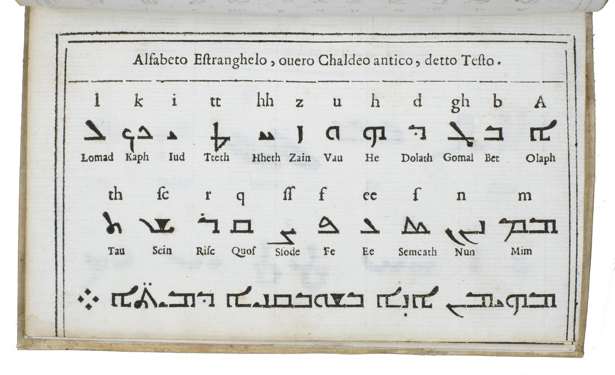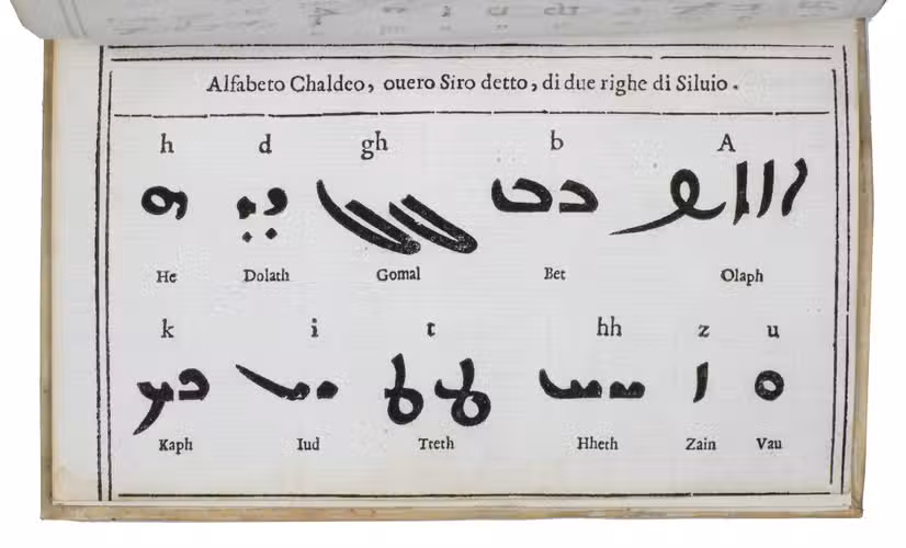 C4: Alfabeto Chaldeo, overo Siro detto, di due righe di Silvio. [serto Syriac type, Coakley W12 large size (1618), bought by the Propaganda Fide 1653]