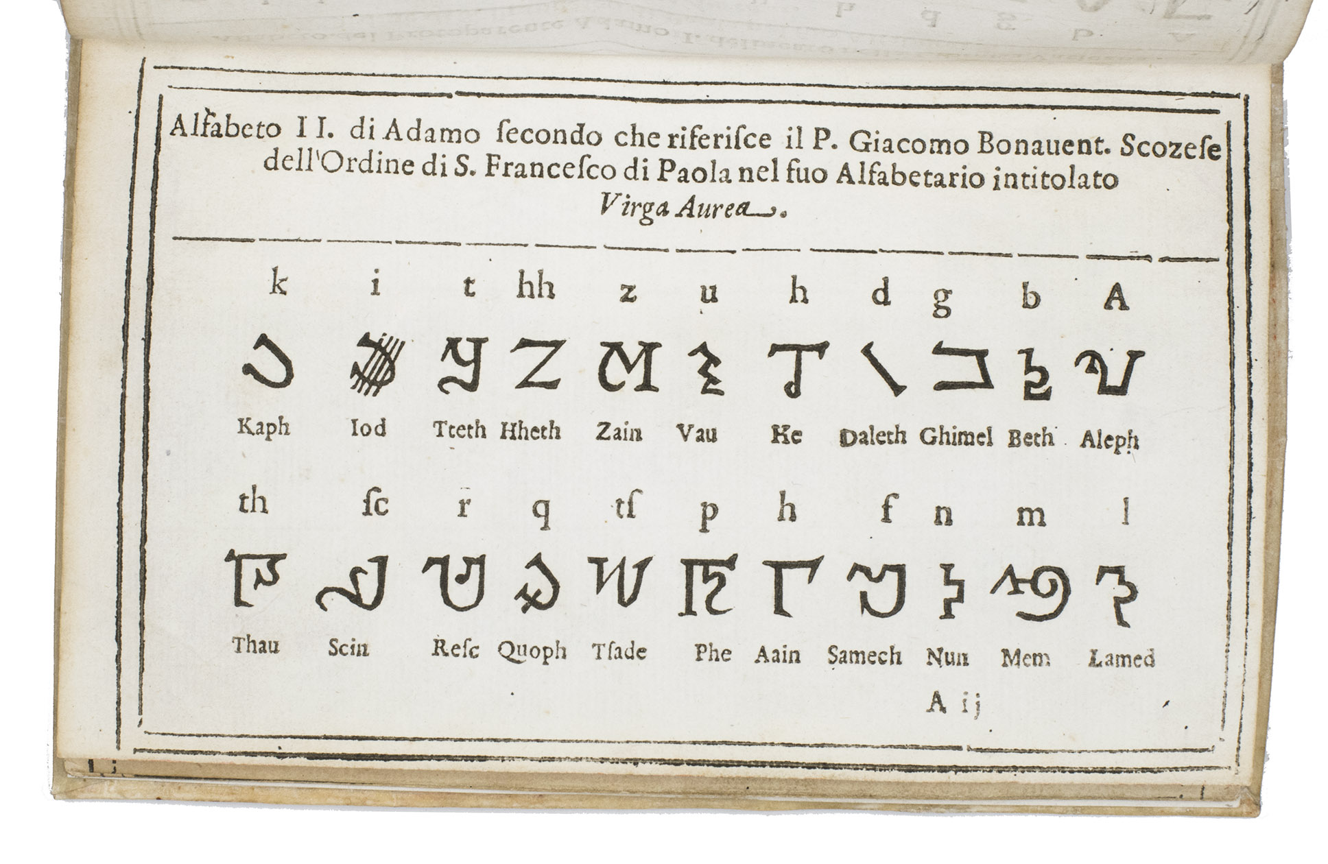 A2: Alfabeto II. di Adamo secondo che riferisce il P. Giacomo Bonavent. Scozese dell'Ordine di S. Francesco di Paolo nel suo alfabetario intitolato Virga aurea. [woodcut characters]