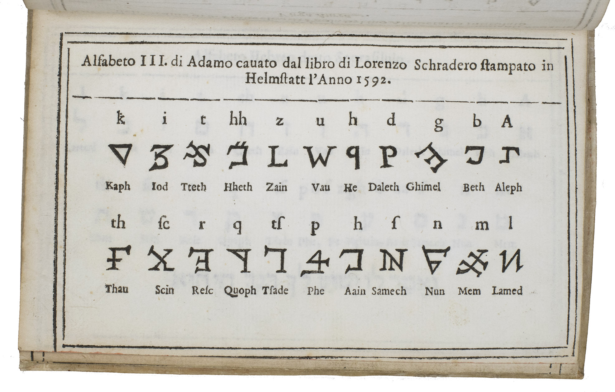 A3: Alfabeto III. di Adamo cavato dal libro di Lorenzo Schradero stampato in Helmstatt l'anno 1592. [woodcut characters]