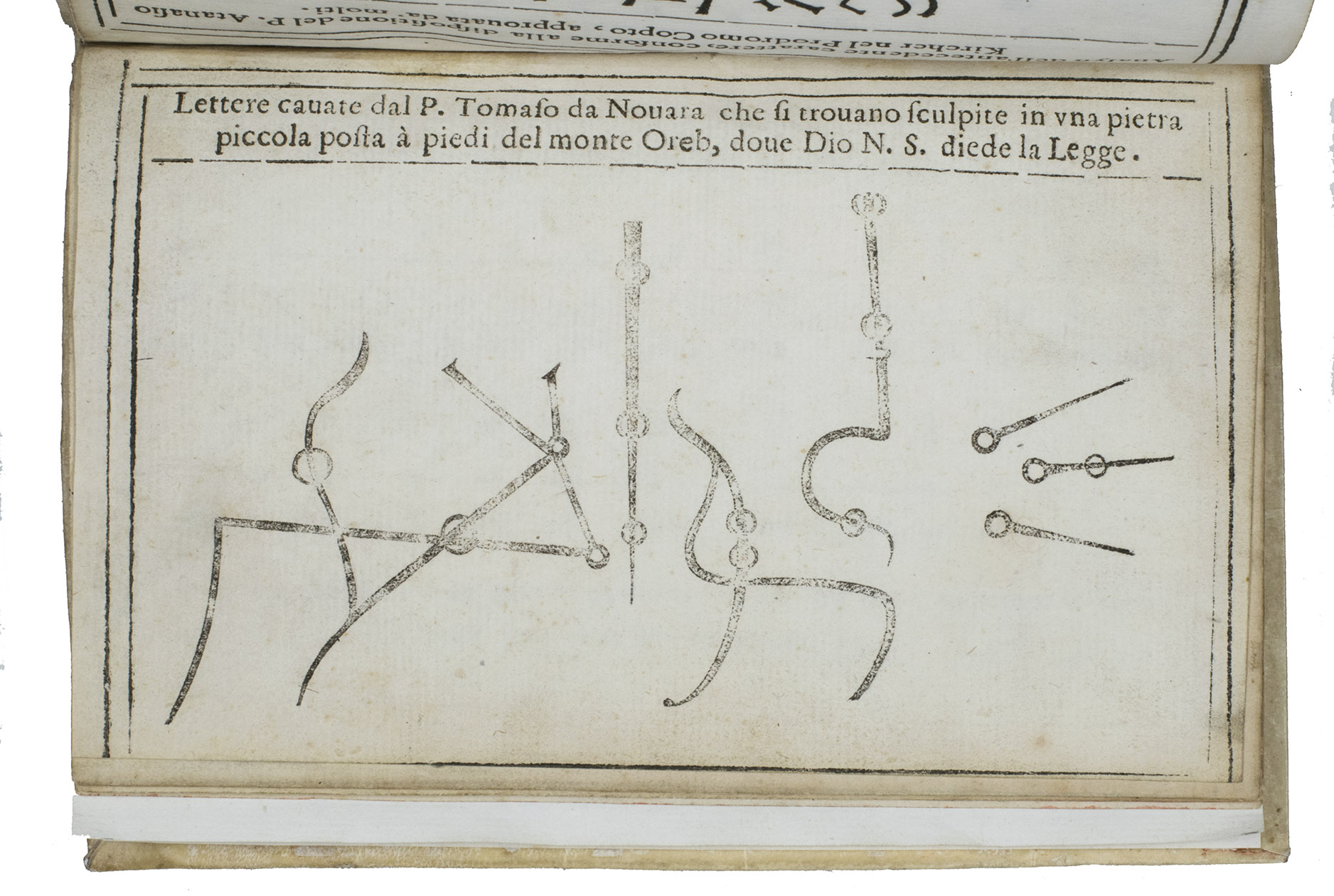 B4: Lettere cavata dal P. Tomaso da Navara che si trovano sculpite in una pietra piccola posta à piedi del Monte Oreb, dove Dio N.S. diede la legge. [woodcut of the Mount Horeb inscription]