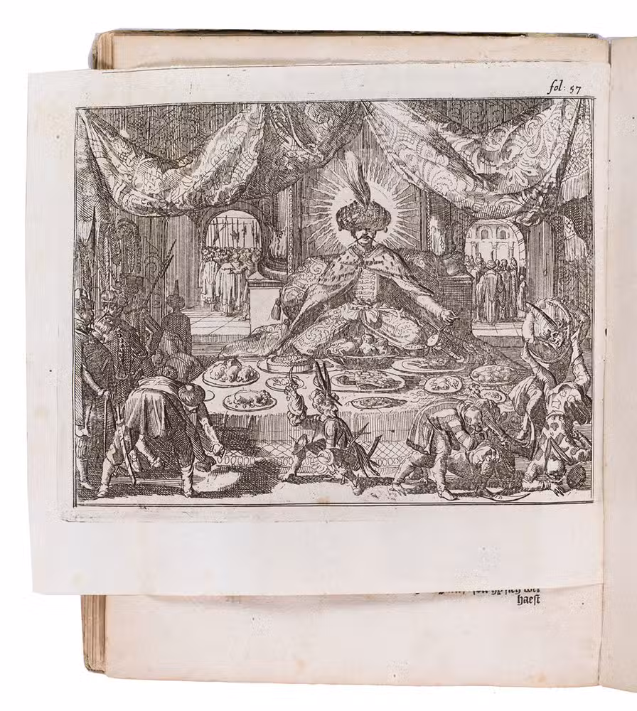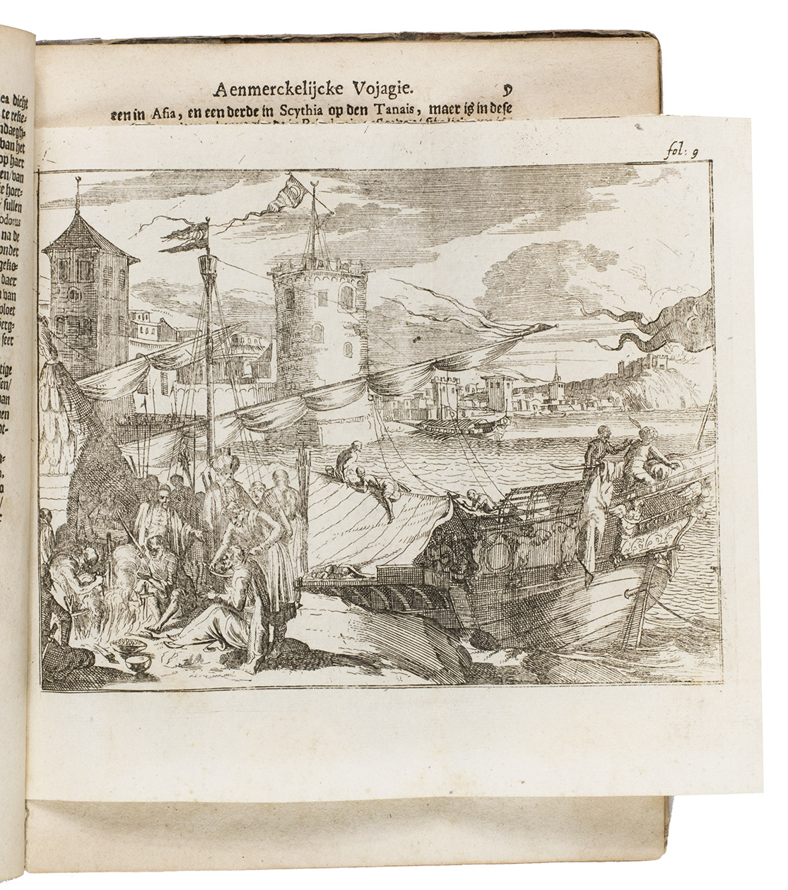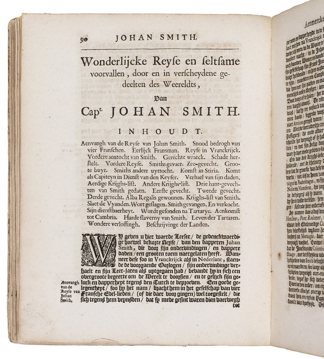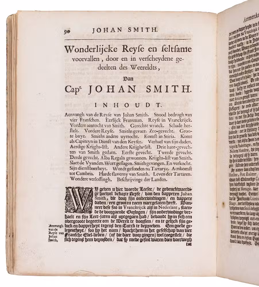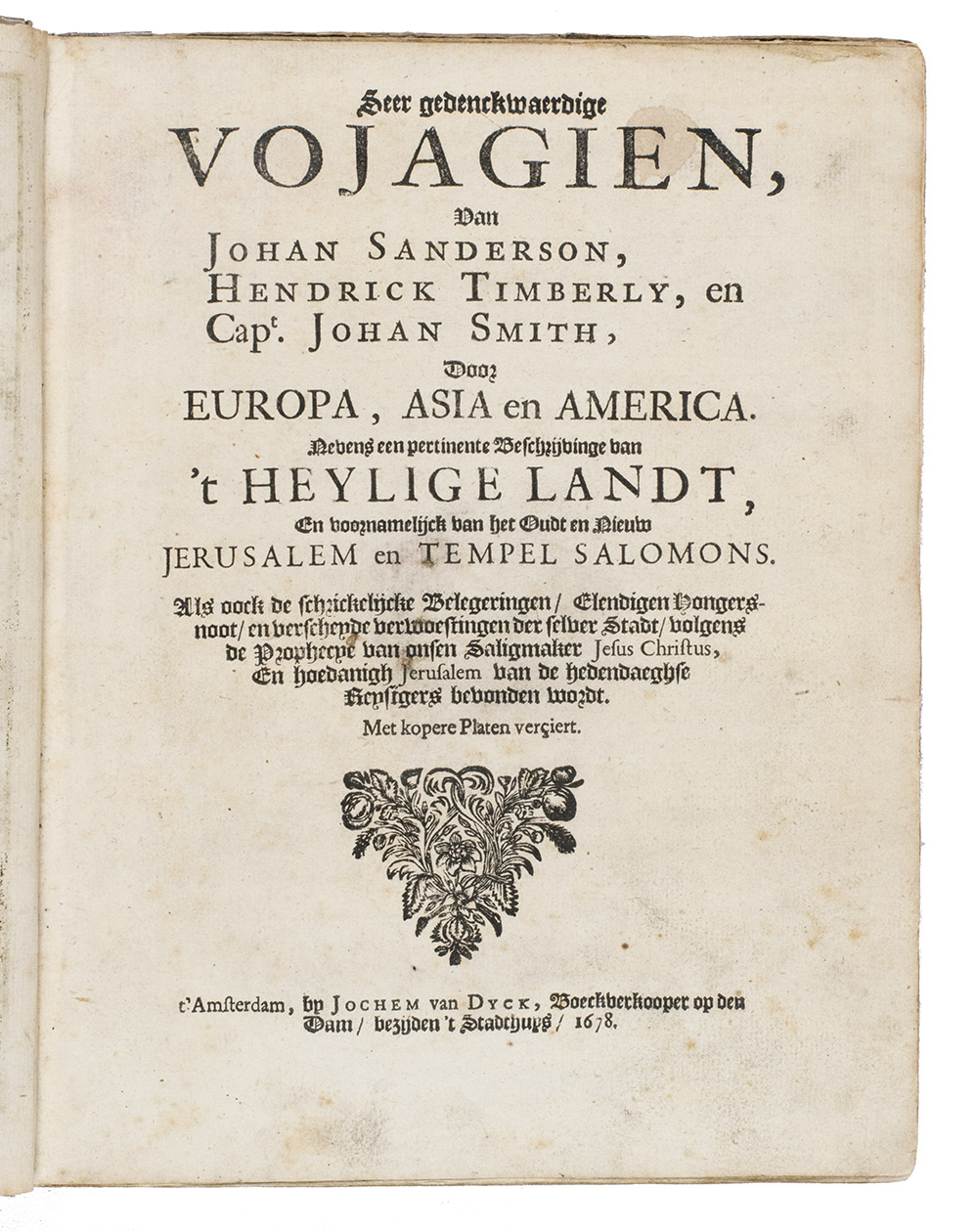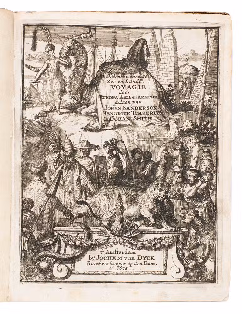 First and only Dutch edition of an account of the voyages of three English merchant adventurers: John Sanderson in the Levant, Egypt and Constantinople (Istanbul), presented here as 1671-1676 but in fact describing travels in the years 1584-1602; Henry Timberlake in Jerusalem (1601); and the young John Smith in the Ottoman Empire (ca. 1598-1604) before his more famous voyage to America. All three are loosely translated from the relevant accounts in Purchas his pilgrimes, London, 1625, but the accounts of Sanderson and Timberlake are written in the first person. The present publisher added some texts from other sources, and the frontispiece and other illustrations, etched and engraved in a style sometimes reminiscent of Romein de Hooghe, are also new. Timberlake, though Protestant himself, shocked more narrow-minded Protestants by his accounts of the kindness of a Muslim Moor journeying from Fez to Mecca, who had joined his ship at Algiers and secured his release when he was arrested in Jerusalem.