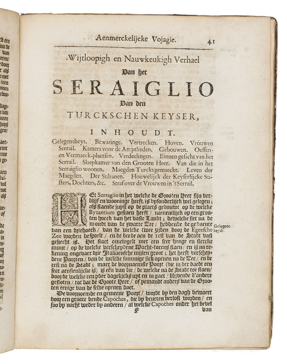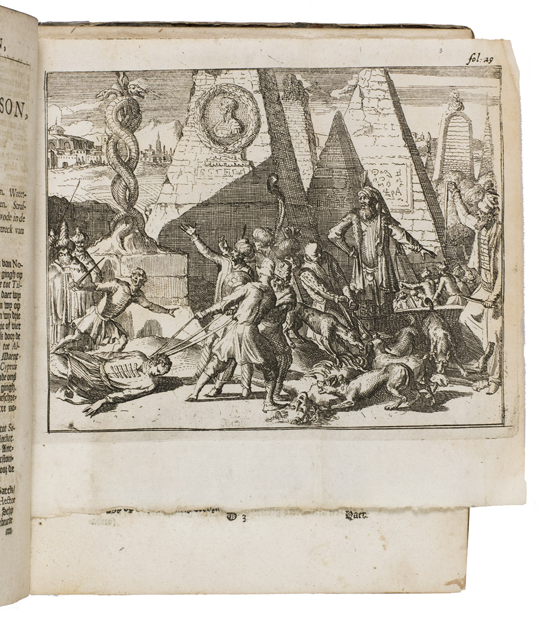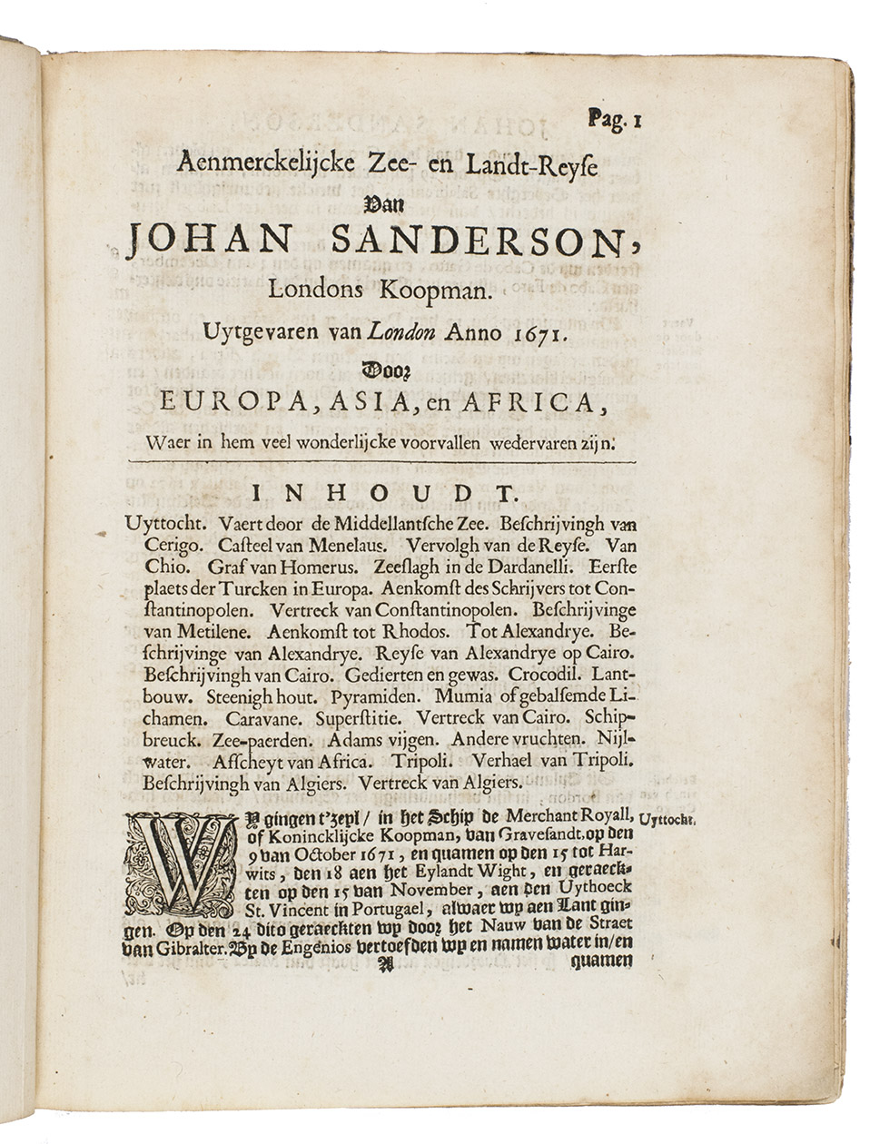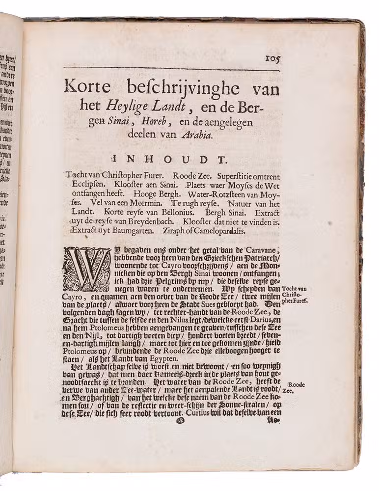 Slightly browned and with the title-page backed, apparently to strengthen it after a library stamp on the back was erased, minor and mostly marginal smudges or spots and a small marginal tear, but otherwise in good condition and with generous margins. Lacking the final blank leaf. The dedication was supposed to precede the publisher's note to the reader, but is here bound after it. The binding is rubbed and tattered, with most of the title-label gone. First Dutch edition of a fascinating account of English merchant adventurers in the Levant, Egypt and the Ottoman Empire: Indiana Jones ca. 1600. Alden & Landis 678/140; Sabin 78871; STCN (6 copies); Tiele, Bibl. 955.