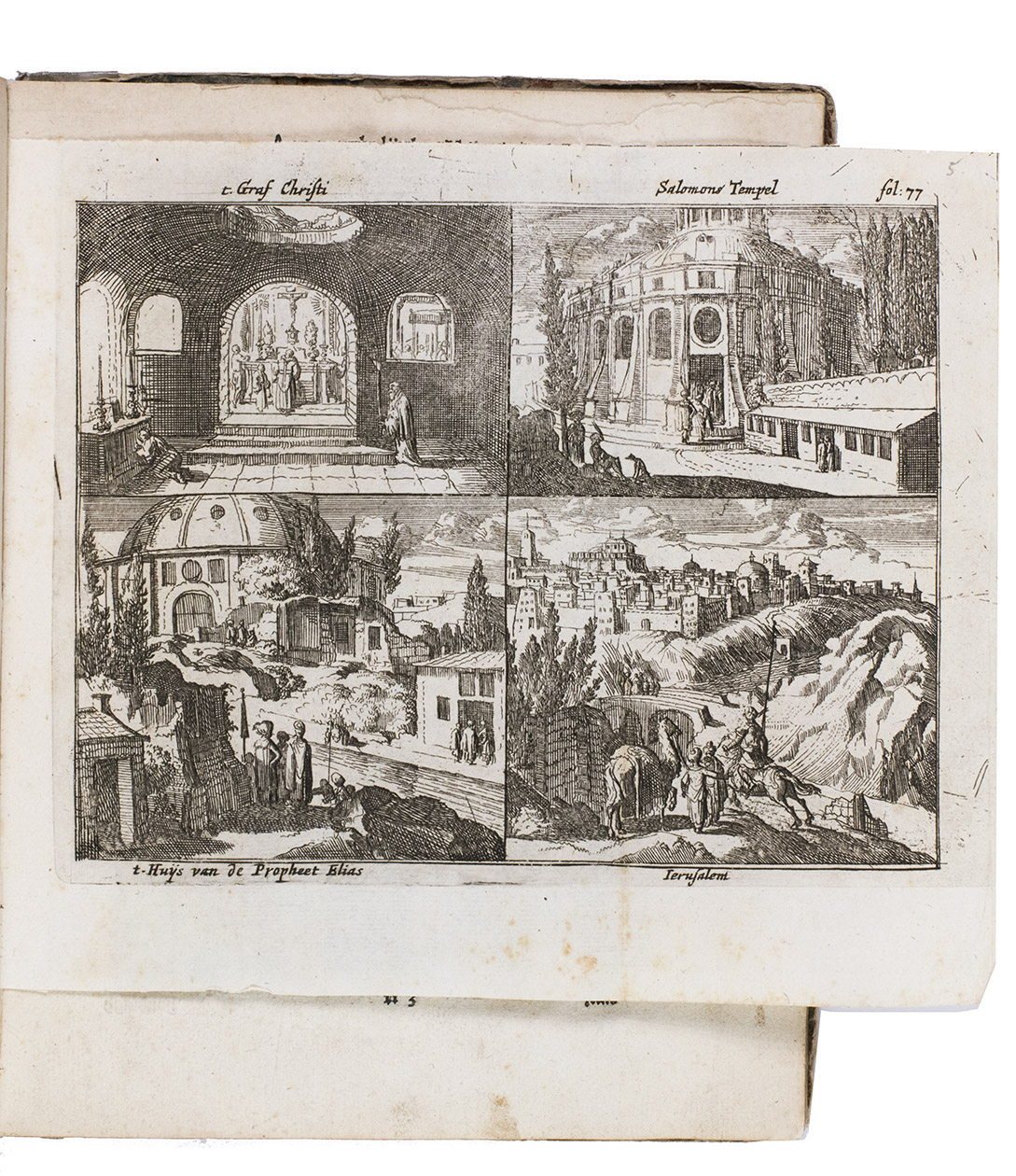 Amsterdam, Joachim van Dyck, 1678. 4to. With engraved title-page, letterpress title-page with a woodcut floral ornament, 4 folding engraved illustration plates (including 1 with 4 small views). 18th-century half vellum. [12], 158 pp. including integral frontispiece.