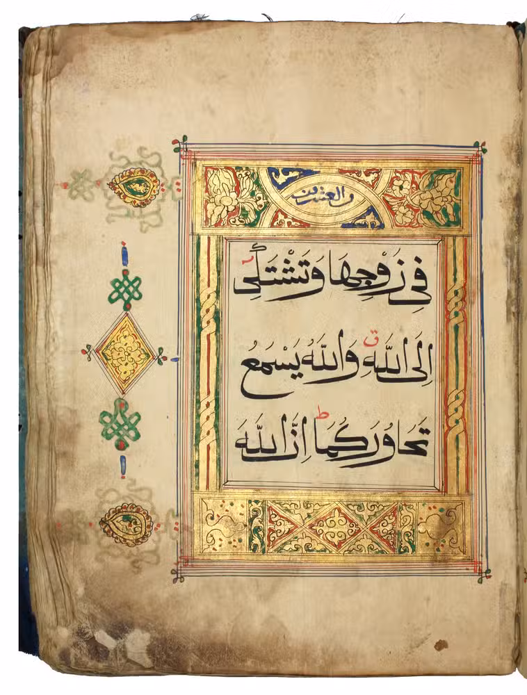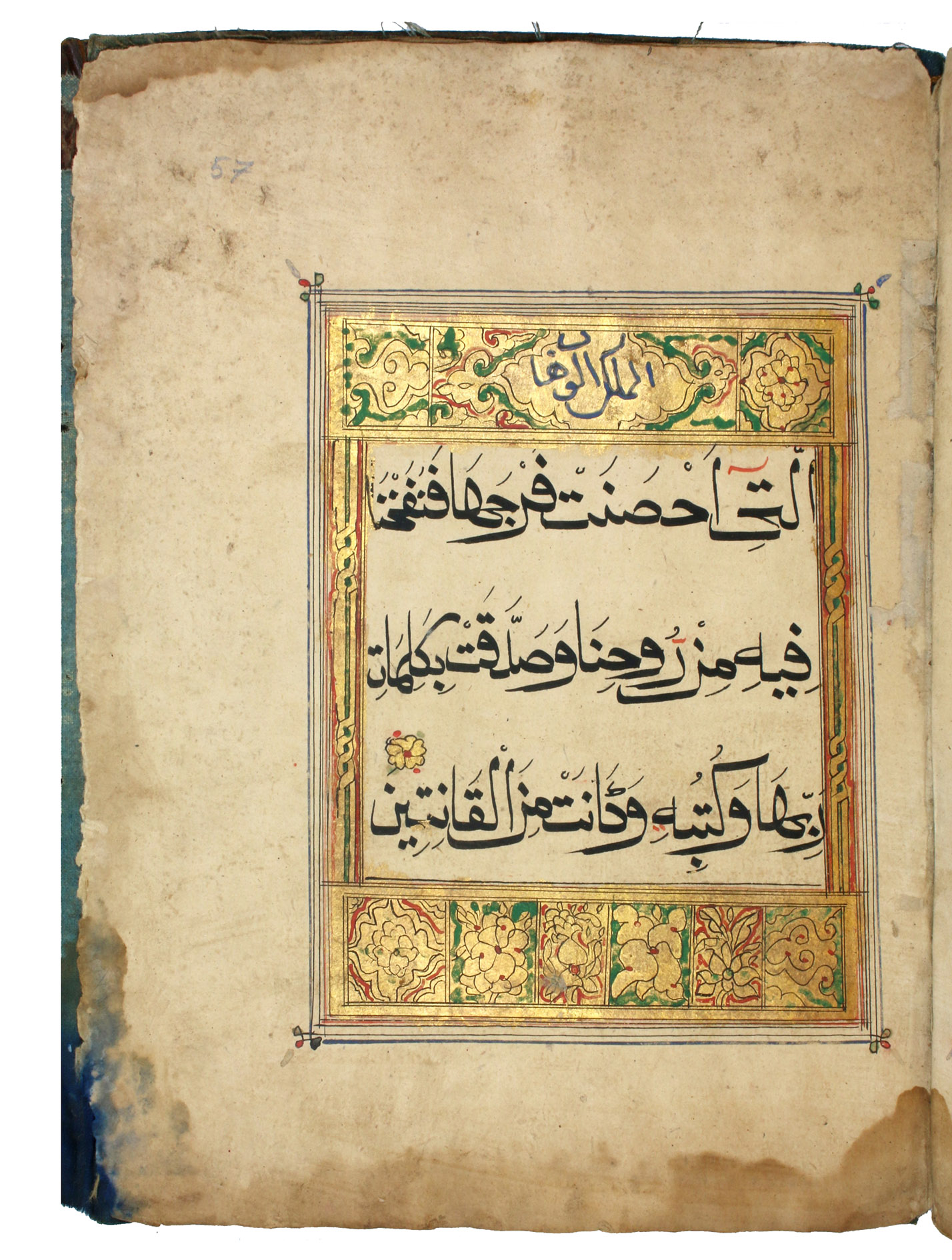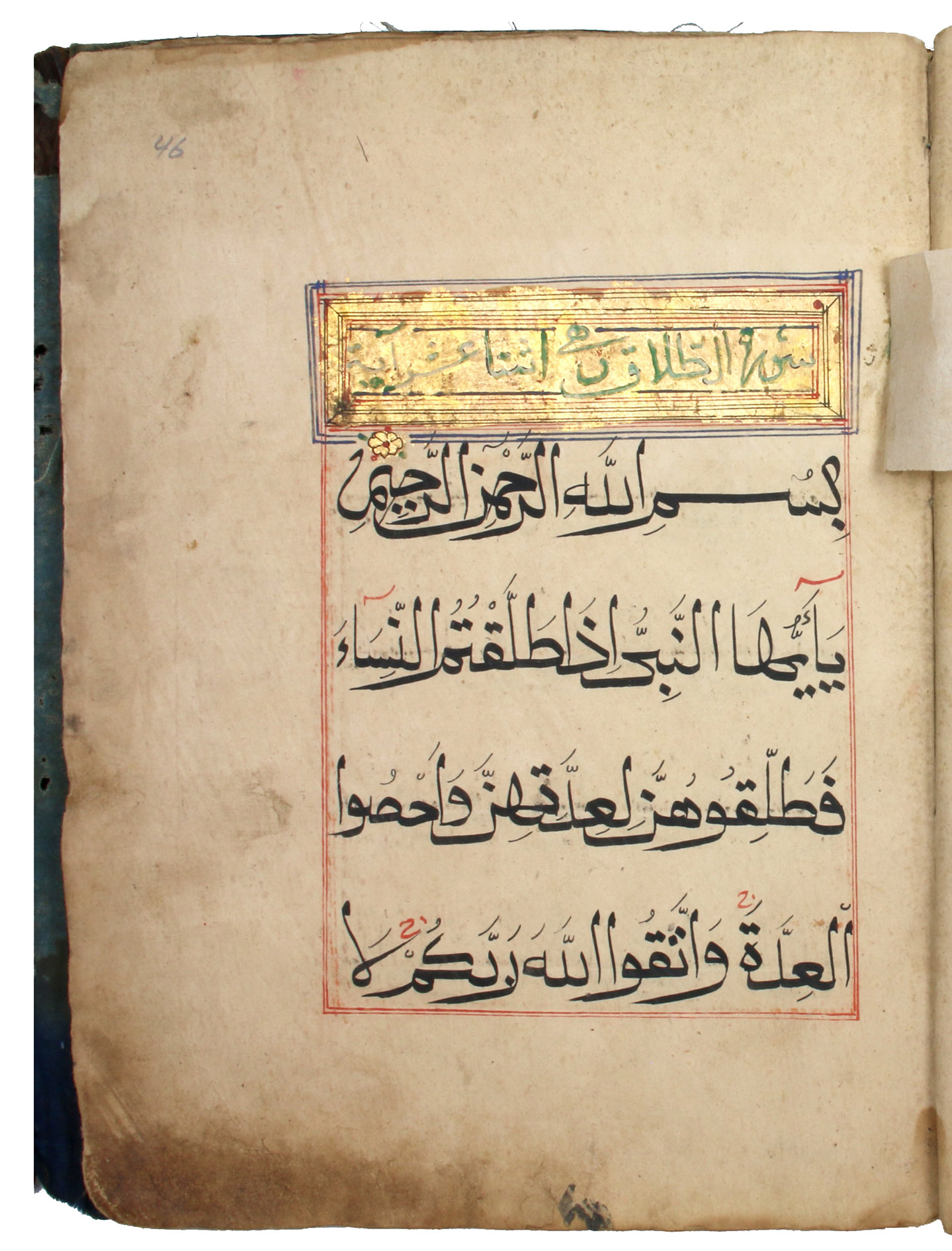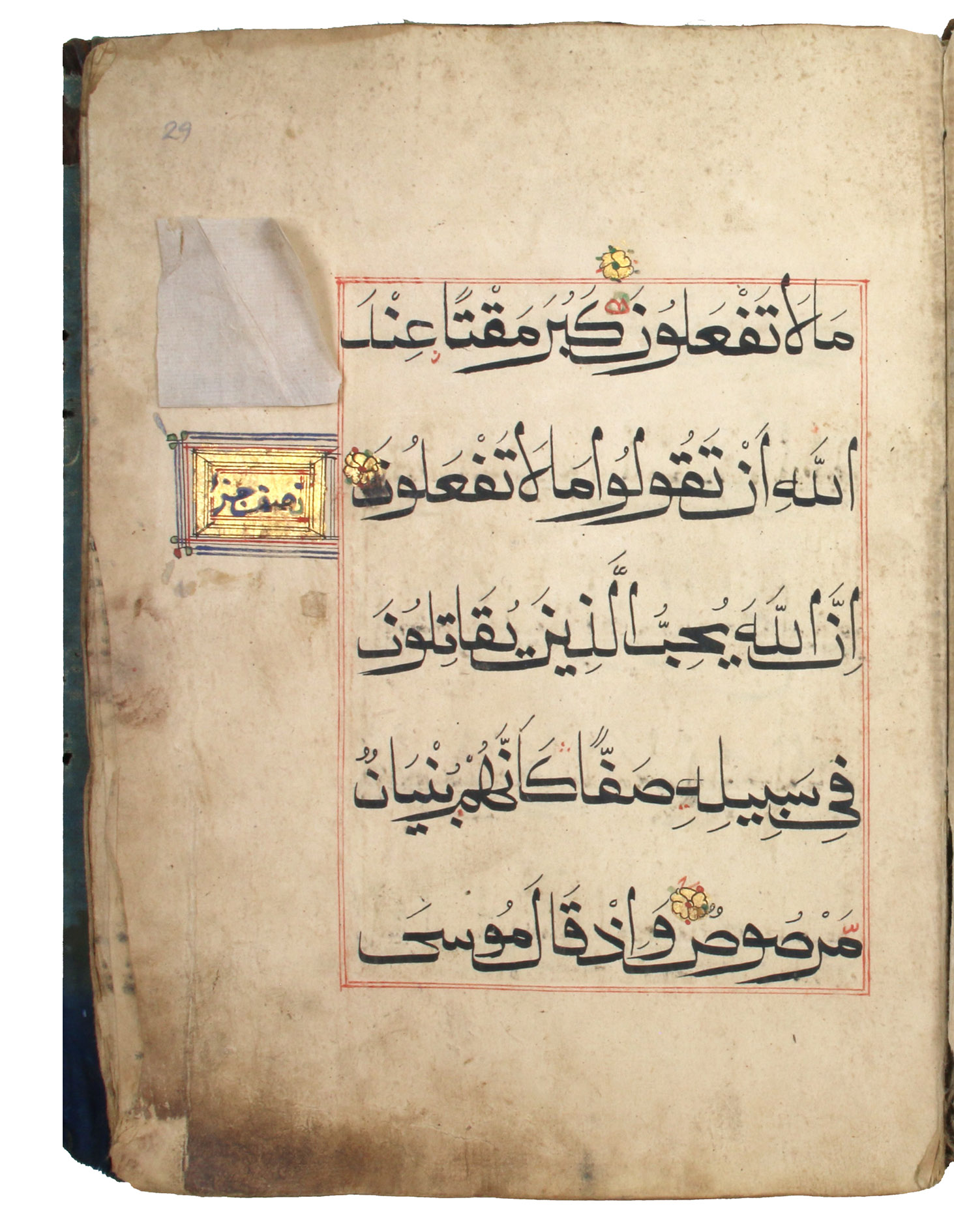 A complete Chinese manuscript of the 28th Juz' of the Qur'an, decorated with gold. This manuscript is part of the long Islamic manuscript tradition, especially popular among Chinese Muslims, of splitting the Qur'an into thirty sections, called Juz'. Each Juz' would be copied with particularly careful, beautiful Arabic calligraphy in the Chinese Sini script.