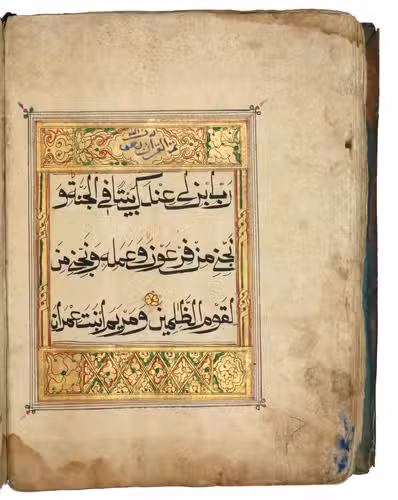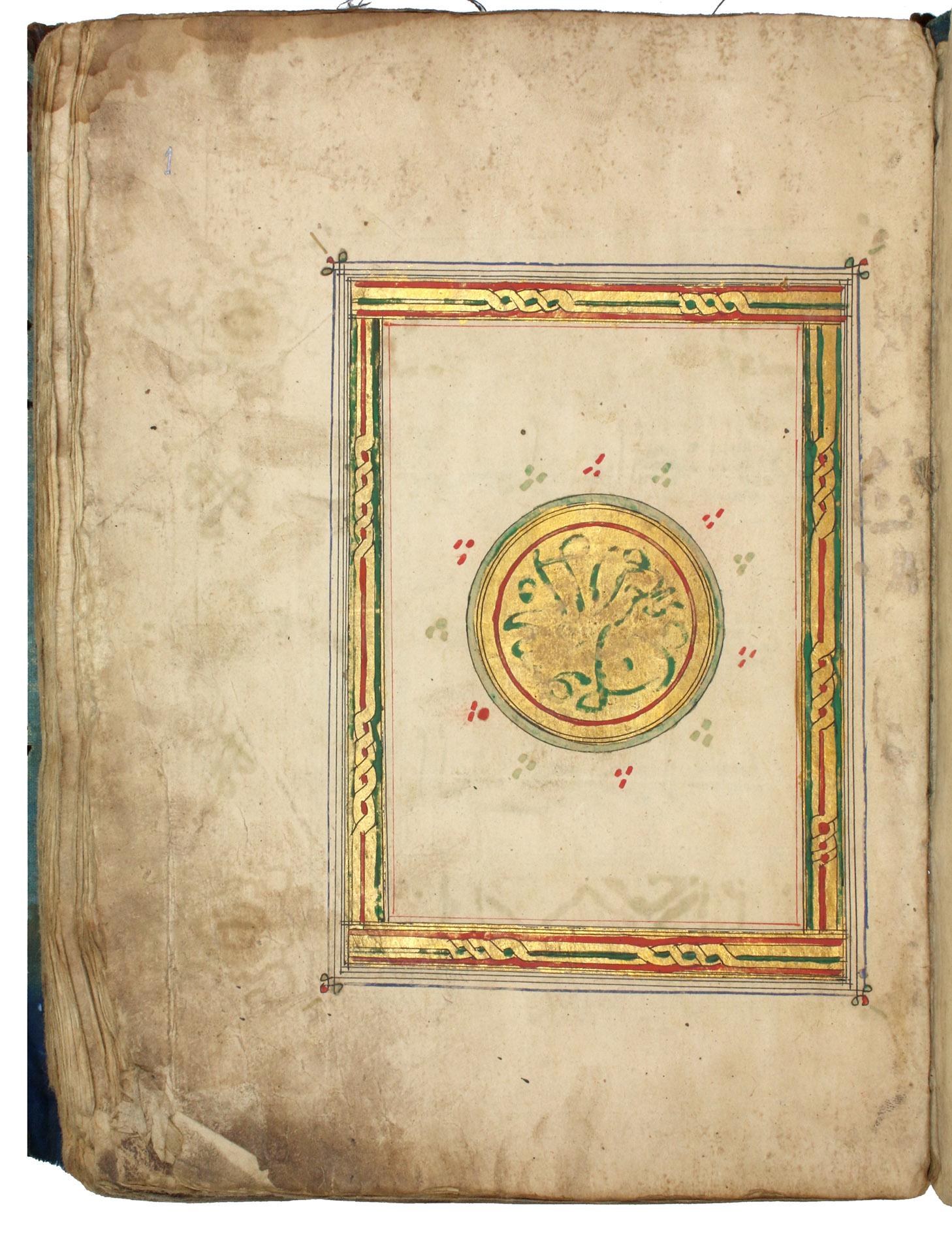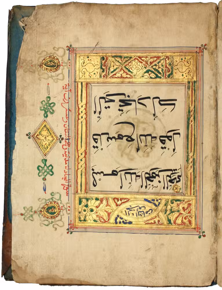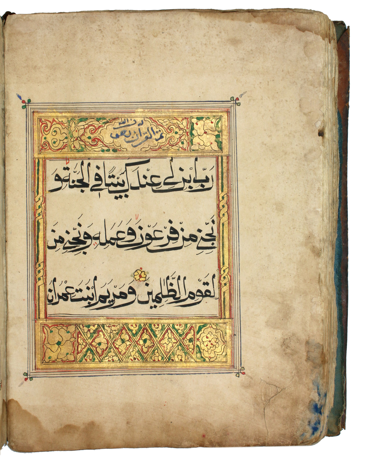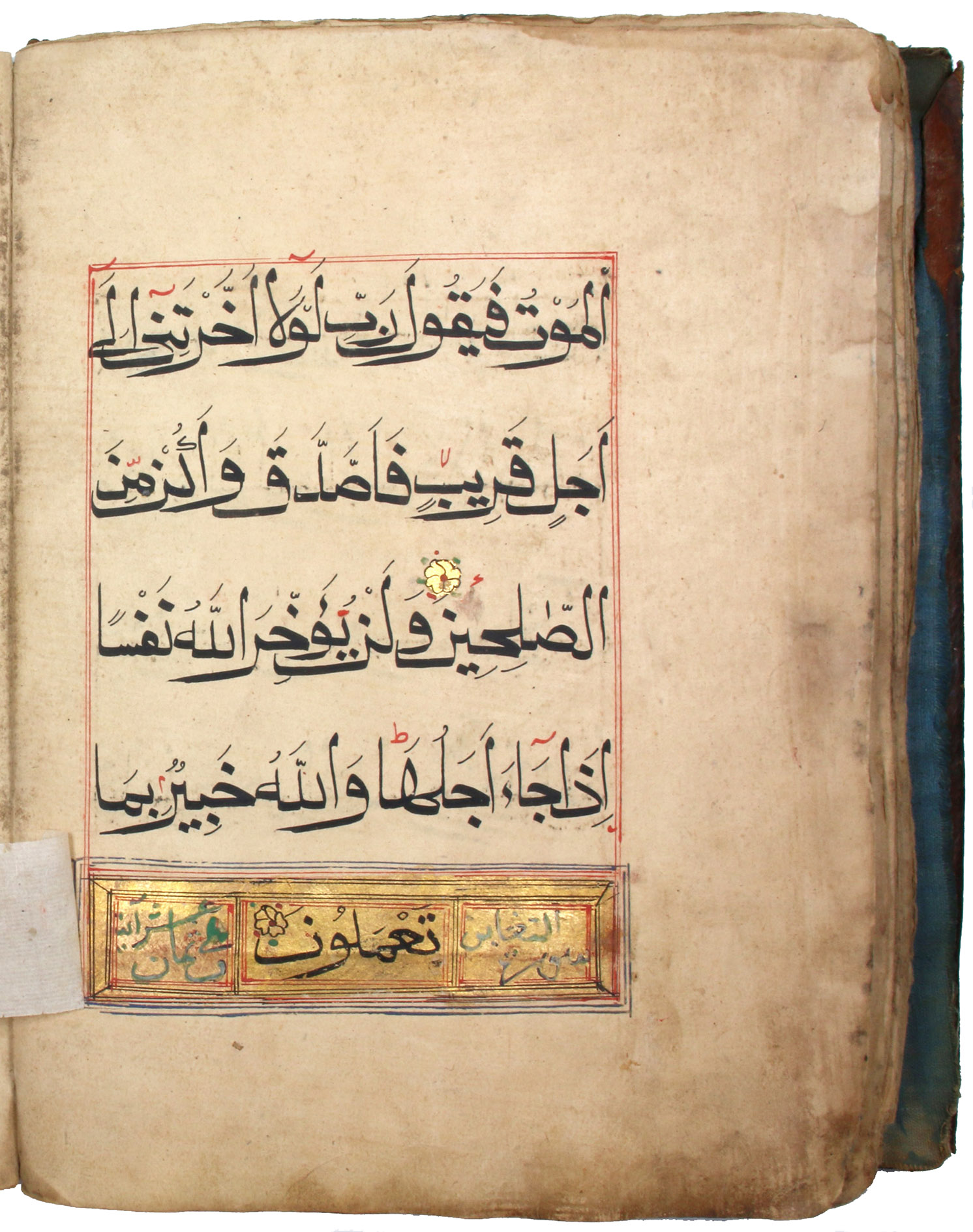 [Qing China, perhaps Yunnan or Gansu, ca. 18th century]. 4to (212 x 285 mm). Arabic manuscript on paper, written in a black Sini script in 5 lines, with some diacritics picked out in red, and the leaves outlined in red. The Arabic text on the opening page is calligraphed within a golden circle, surrounded by a gold border, the opening and closing bifolia have wide gold borders with multicoloured designs, and Chinese knots in the margins, the verse markers and Surah titles are calligraphed on fields of gold, with the Surah titles calligraphed with jade green ink. 19th-century gold tooled leather, blue cloth end papers. 60 ll.
