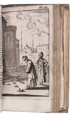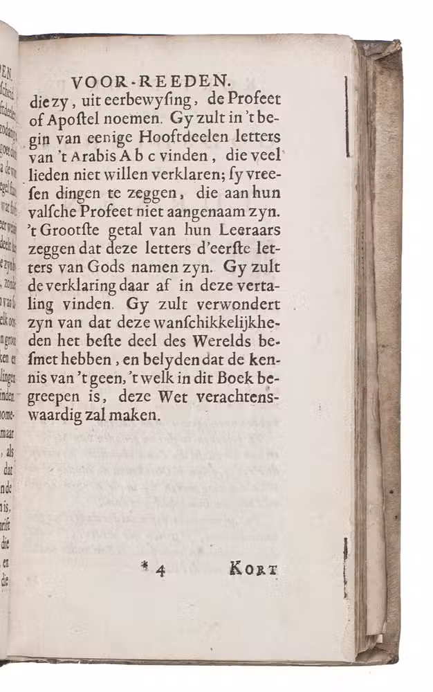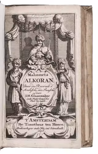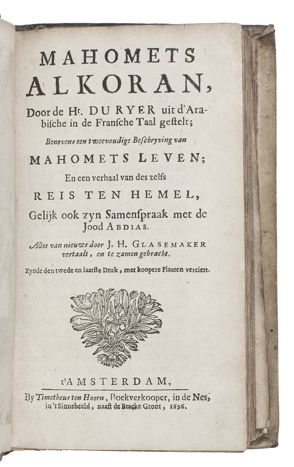Second edition, the first with the engraved plates by Caspar Luyken, of the second Dutch translation of the Quran, translated by Jan Hendrik Glazemaker from André Du Reyer's French translation. Glazemaker's translation was first published in 1657 and proved quite popular, going through six editions (the last, in 1734, called the seventh). The text of the Quran is followed by a life of Mohammed, extracted from Ibn al-Amid's history of the Saracens and several other sources, translated from Erpenius's Latin rendering of the original Arabic. This edition was intended for Christians, who did not concern themselves with the Islamic restrictions on pictorial illustration. The preface is followed by a 5-page summary of the religion of the Ottomans.