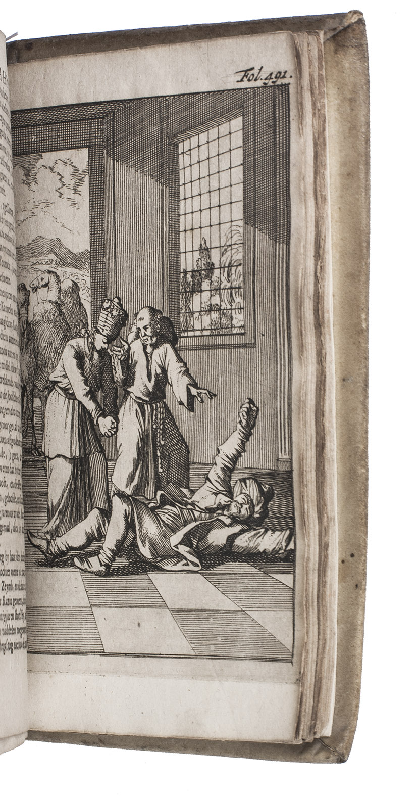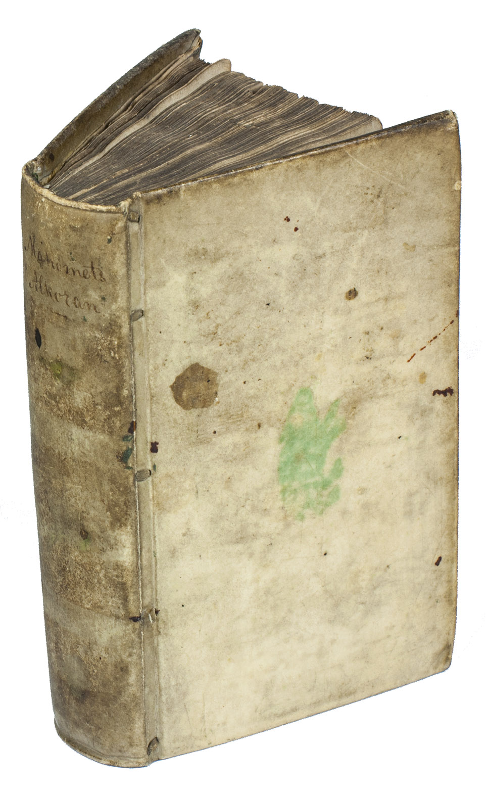 Amsterdam, Timotheus ten Hoorn, 1696. 8vo. With an integral engraved title-page, and 6 engraved plates showing the Prophet Mohammed, engraved by Caspar Luyken. Contemporary vellum, manuscript title on spine. [12], 547, [1 blank] pp.