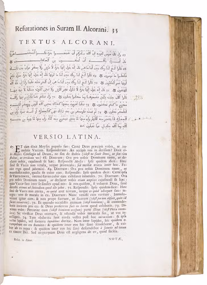 Alcorani textus universus ex correctioribus Arabum exemplaribus summa fide, ... Eadem fide, ... in Latinum translatus; appositis unicuique capiti notis, atque refutatione: ...