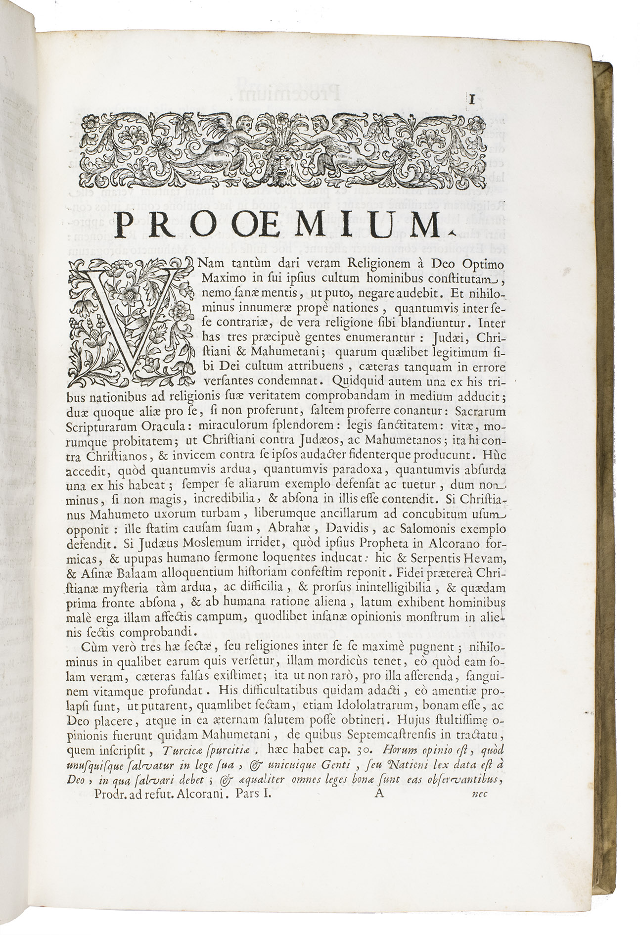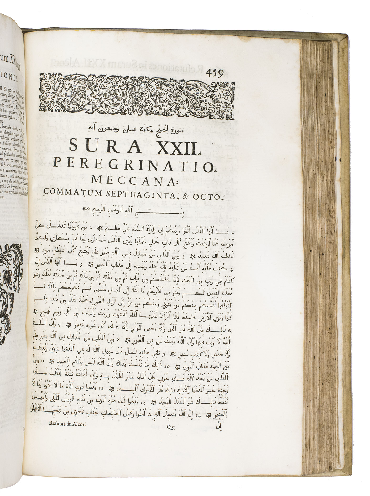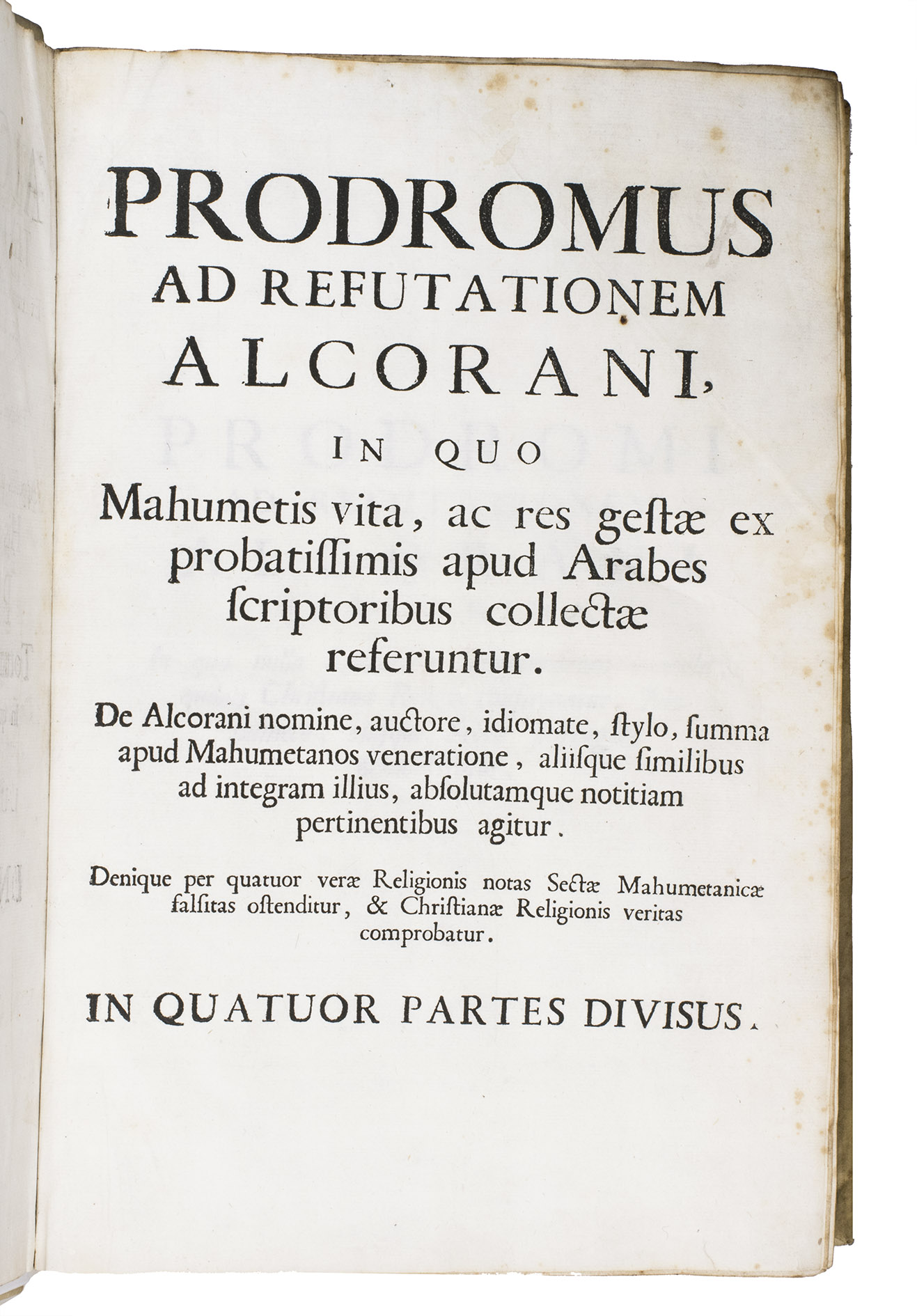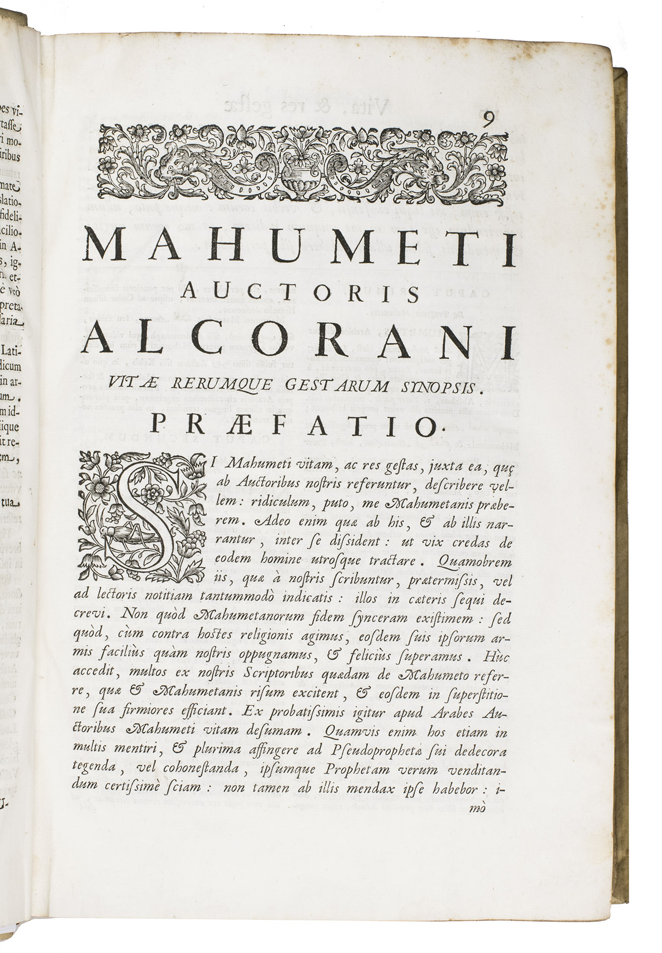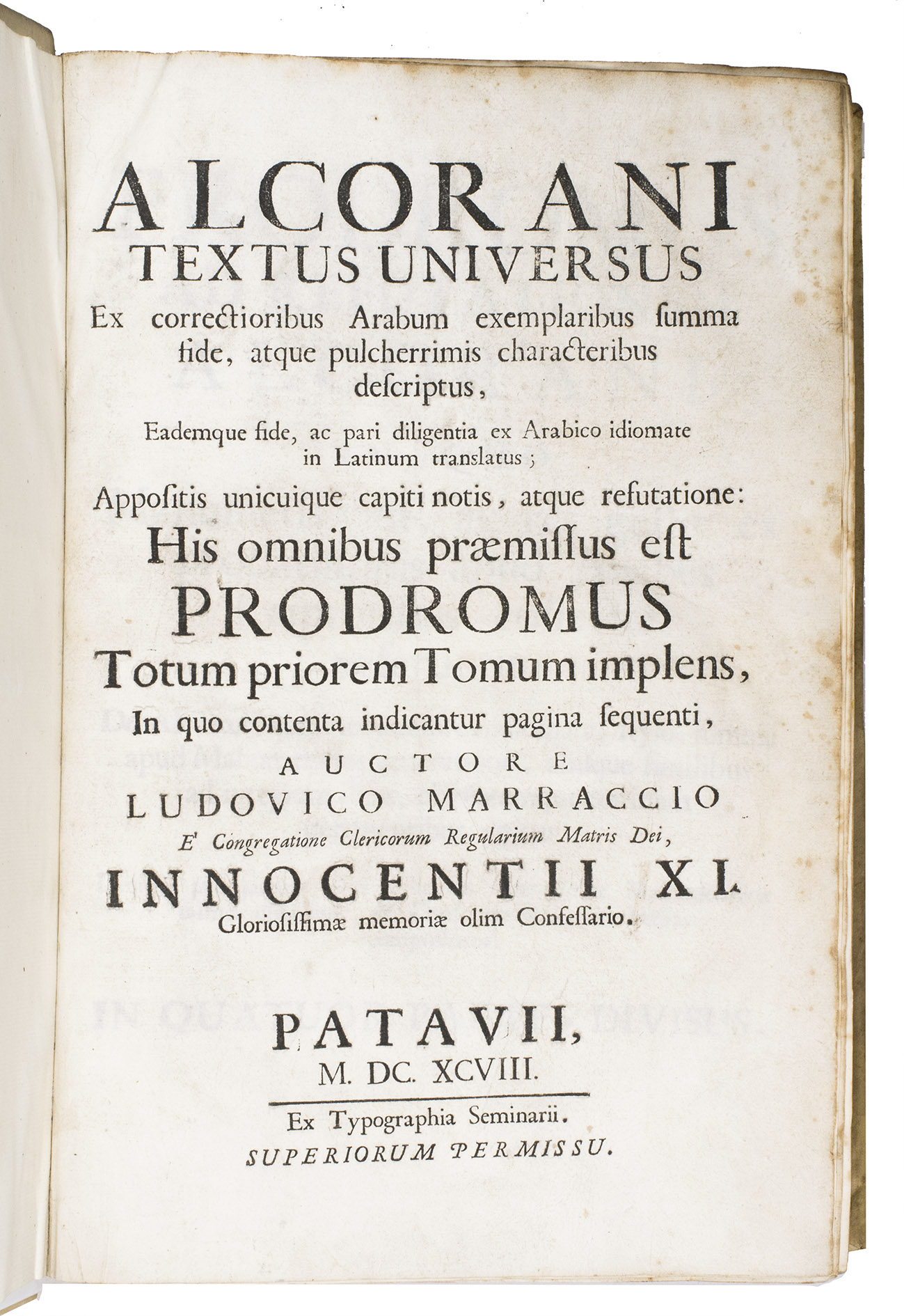 With two bookplates and an occasional early manuscript note and a few letters or numbers inscribed in the foot margin of one leaf. With a tear running into the text of one leaf, repaired, but otherwise in very good condition. With generous margins. The boards are slightly bowed and there is a small tear repaired at the foot of the spine. A ground-breaking work of Quranic scholarship, a valuable source for the study of the Quran and an essential source for European views of Islam. Cat. Bibl. A.-R. Courbonne, dont la vent ... 1er février 1842, 30 (this copy); A. Hamilton, Europe and the Arab world 34; Schnurrer 377; O. A. Sheikh Al-Shabab, "The place of Marraccis Latin translation of the Holy Quran: ...", in: Journal of King Saud University: language & tanslation, 13 (2001), pp. 57-74; USTC 1736471/1737617/1748538; not in Atabey; Blackmer; Philologia orientalis (but cited in 225g, 360a, 380b, 381c).
