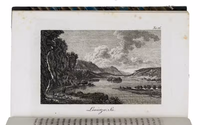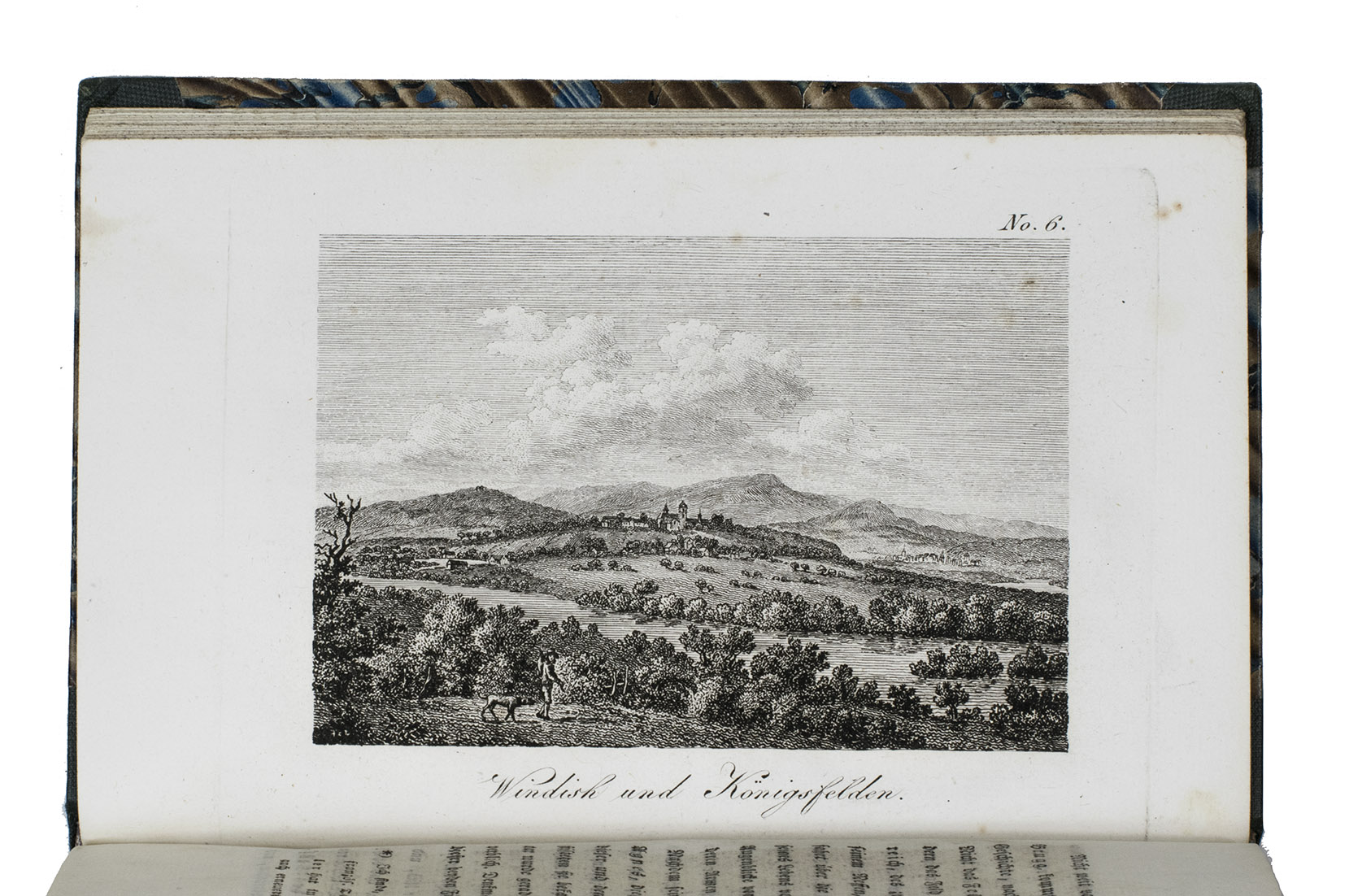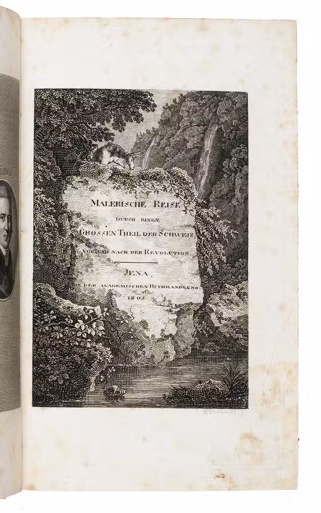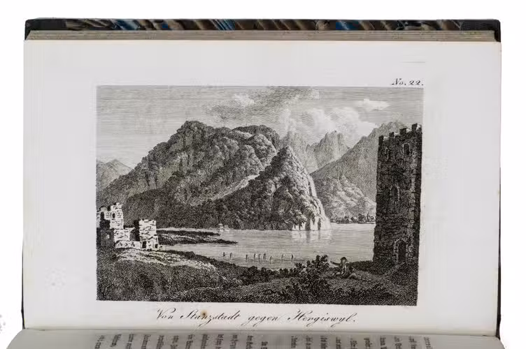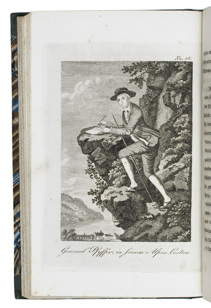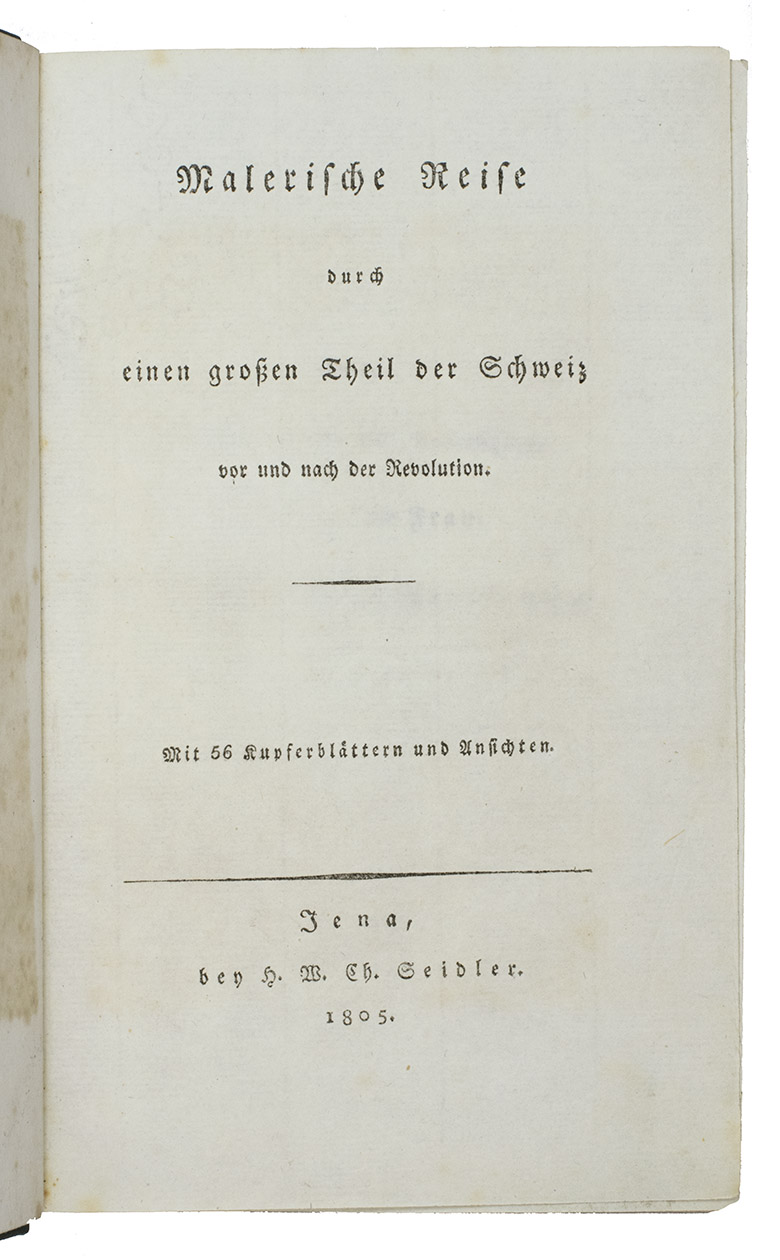 Jena, H.W.Ch. Seidler, 1805. 8vo. With engraved frontispiece with 4 medallion portraits, engraved title-page with the title on a rock in an alpine scene, 54 numbered engraved plates (1 folding) and 2 folding leaves with built-up letterpress music. With the 4 costume plates hand-coloured. Later 19th-century half cloth. XVI, 414, [2] pp.