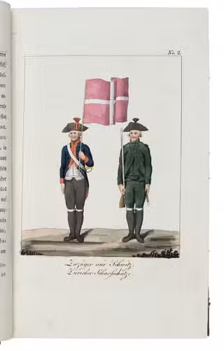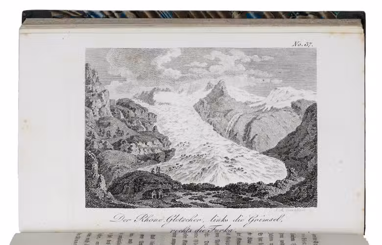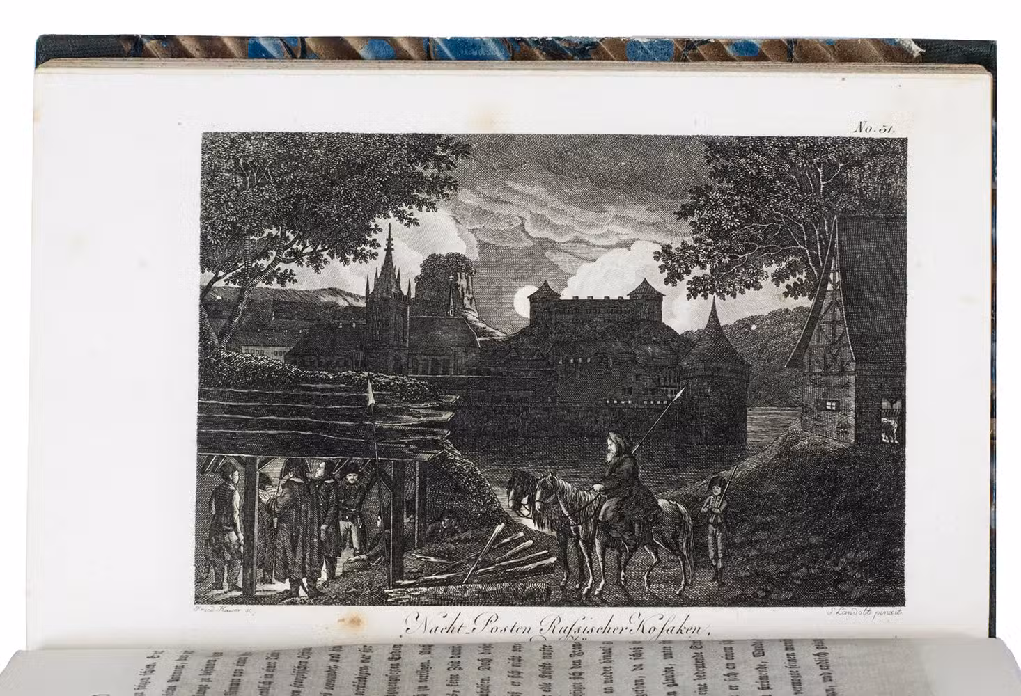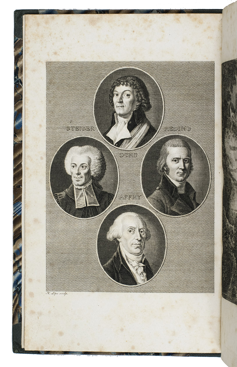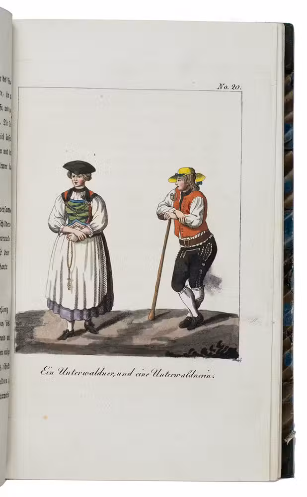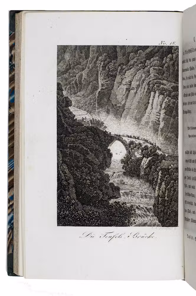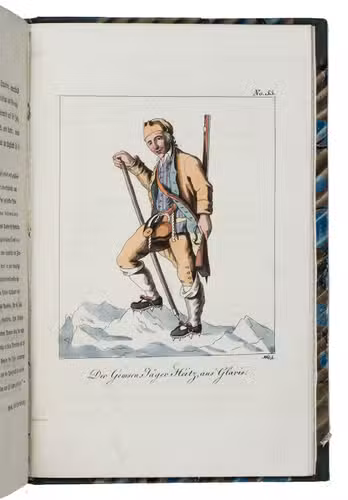 Jena, H.W.Ch. Seidler, 1805. 8vo. With engraved frontispiece with 4 medallion portraits, engraved title-page with the title on a rock in an alpine scene, 54 numbered engraved plates (1 folding) and 2 folding leaves with built-up letterpress music. With the 4 costume plates hand-coloured. Later 19th-century half cloth. XVI, 414, [2] pp.