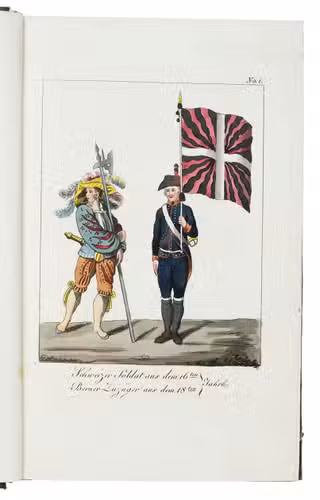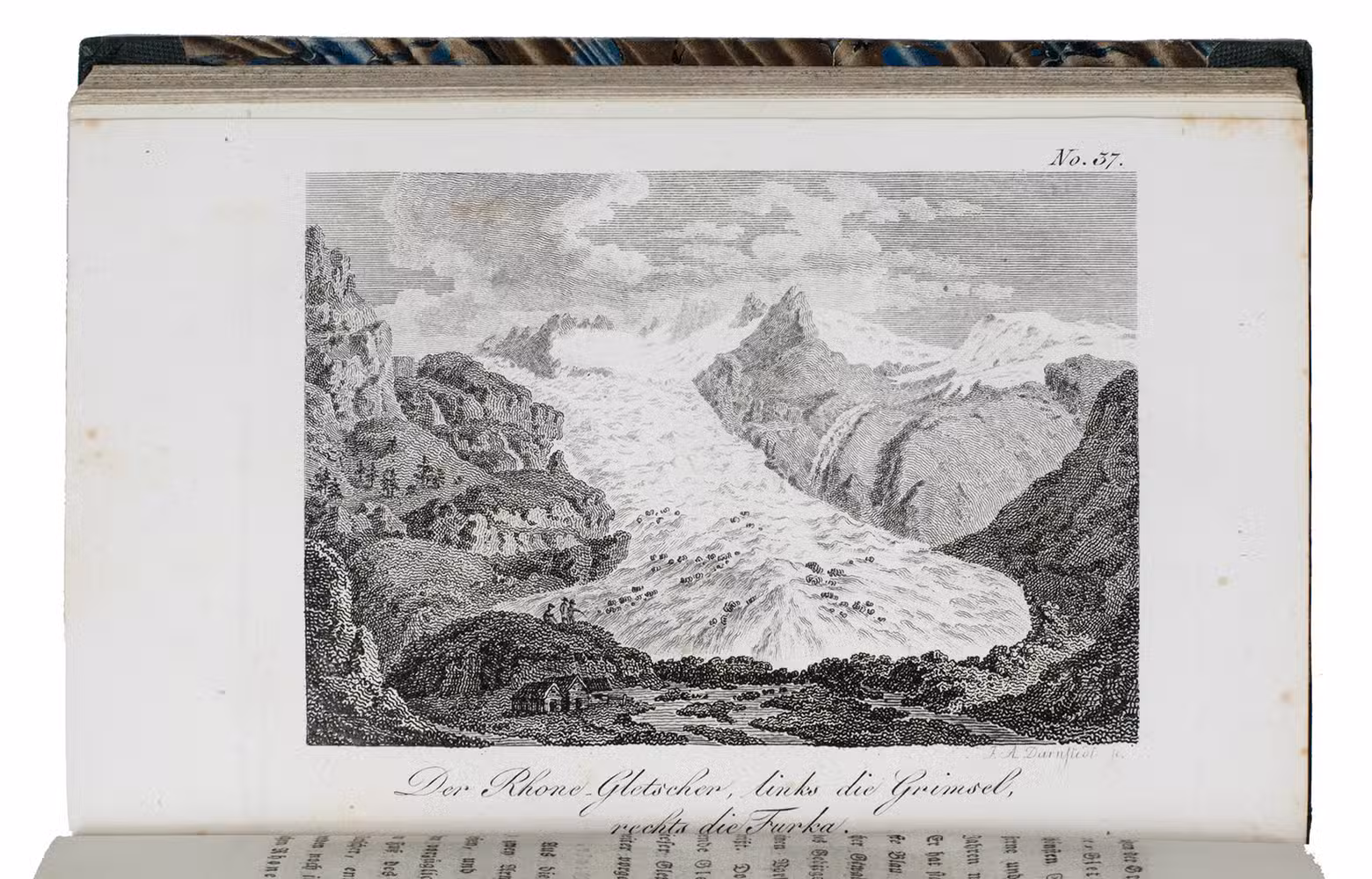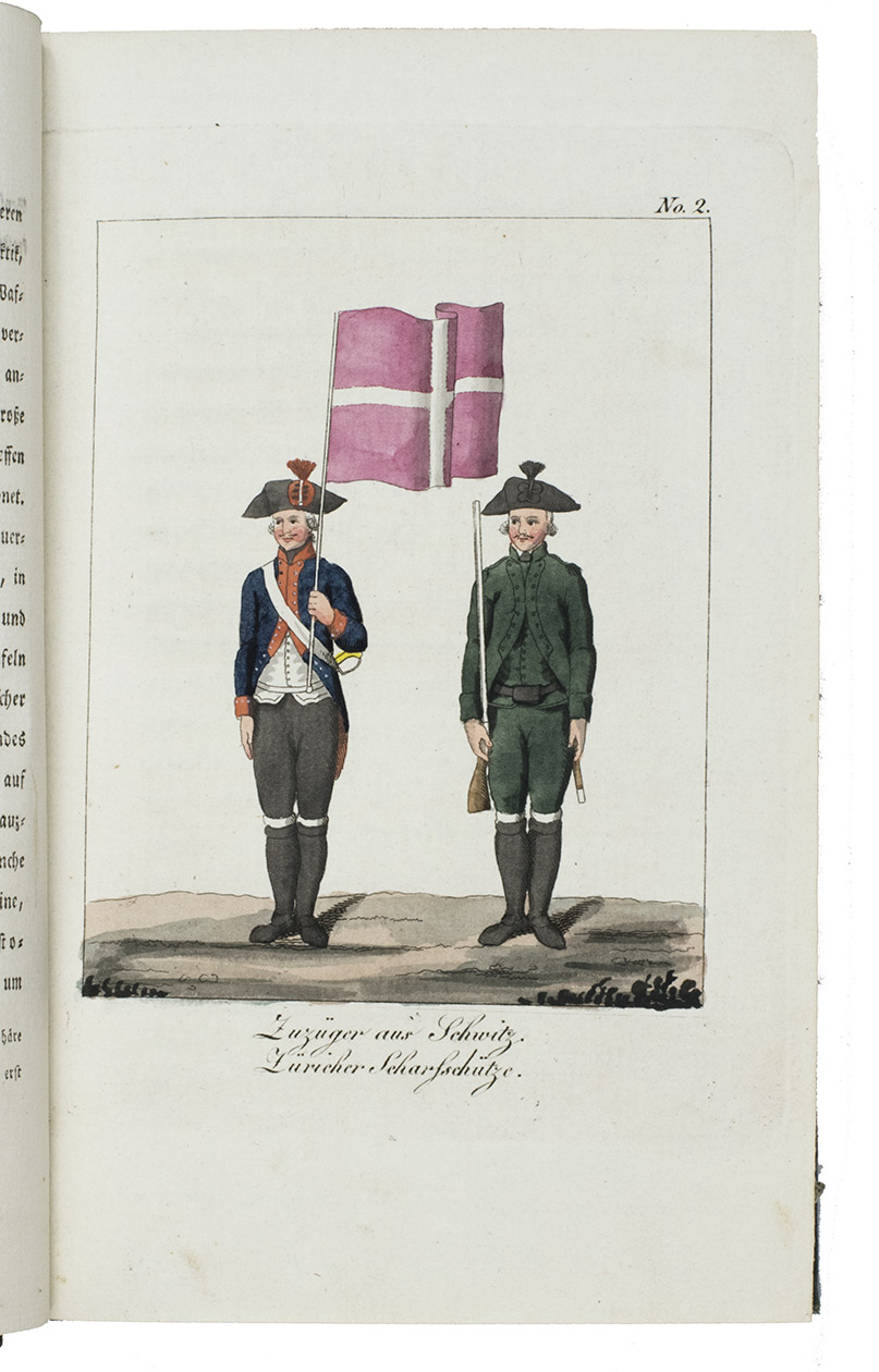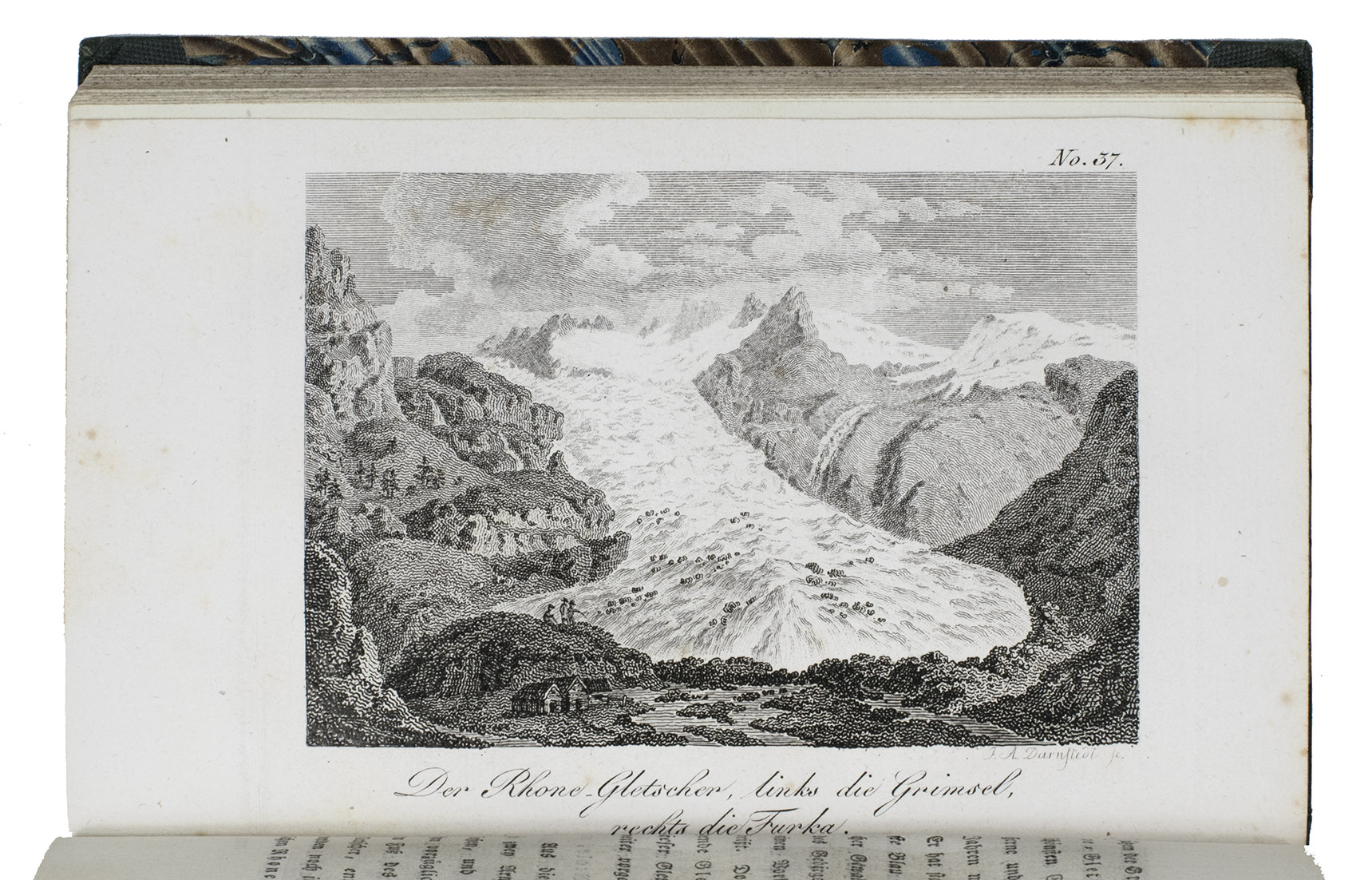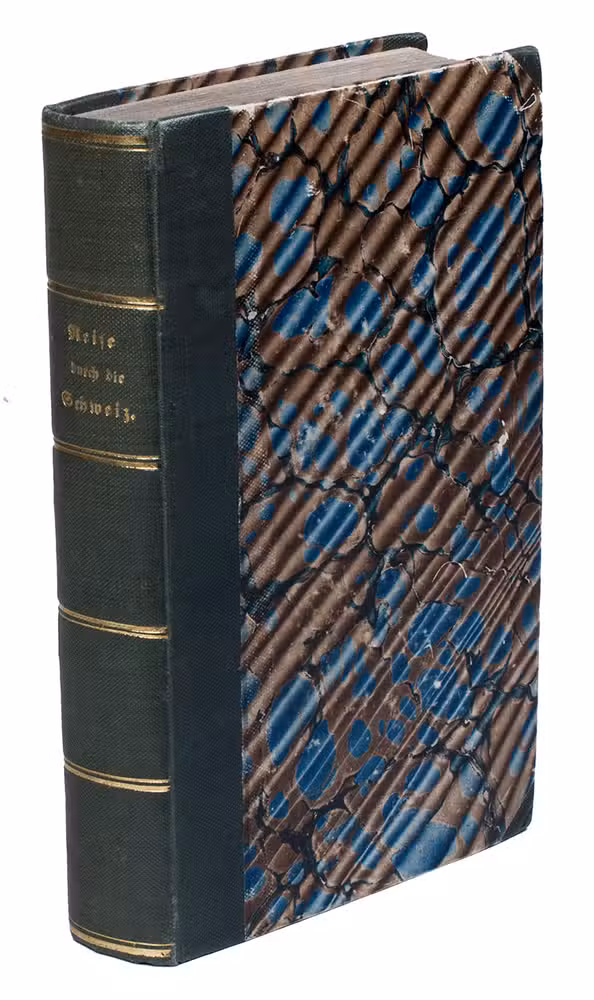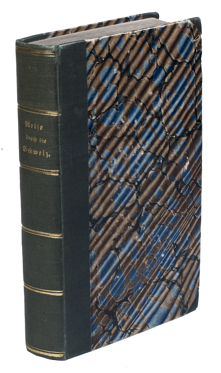 First edition of an attractively illustrated account of a journey through Switzerland. The work includes 4 costume plates (2 showing military uniforms, with flags), a description of Balmat and Paccard's first ascent of Mont Blanc, as well as many fine views by J.A. Darnstedt, including the engraved title-page. One of the alpine views also serves as a 5th costume plate, but in black and white.