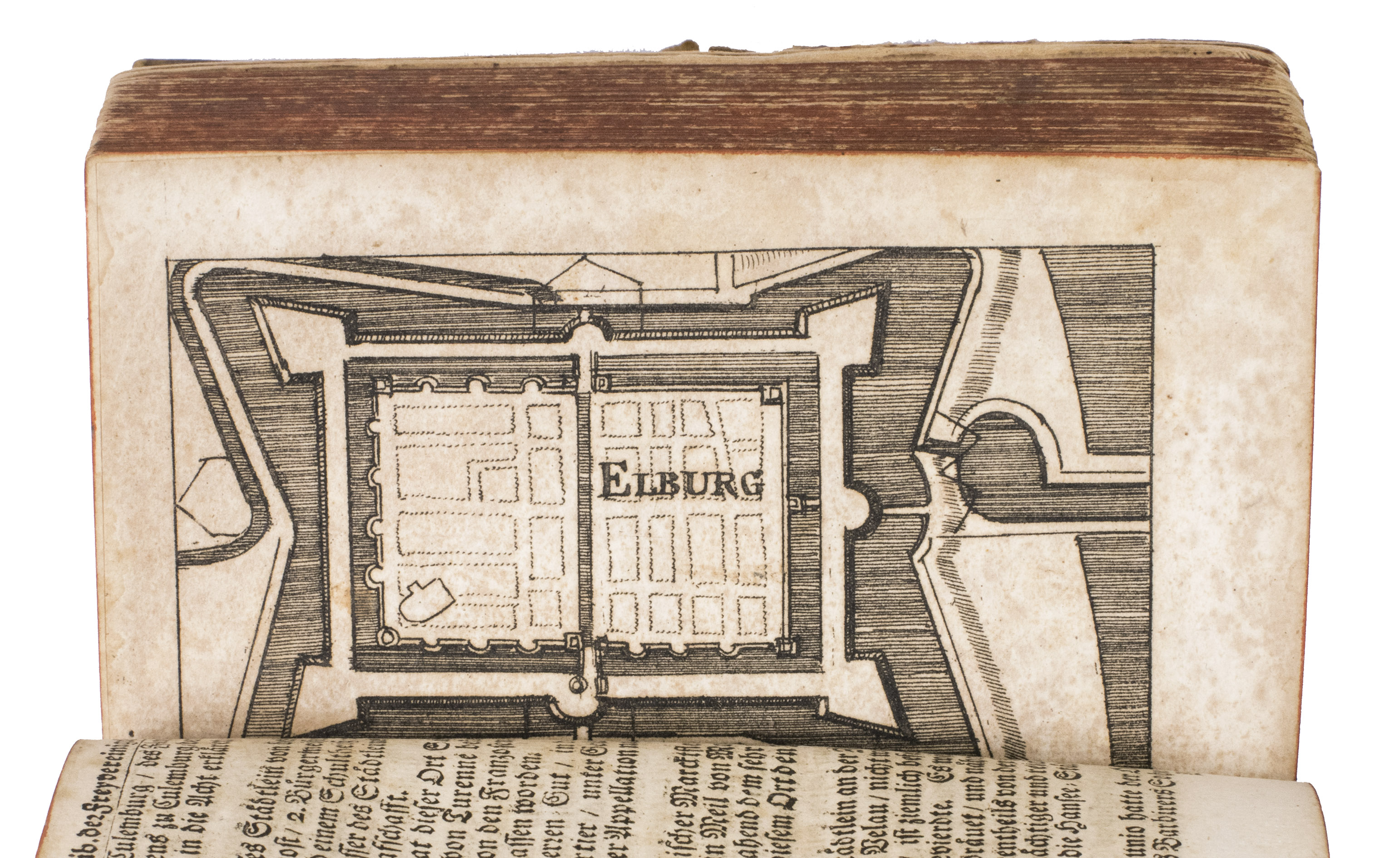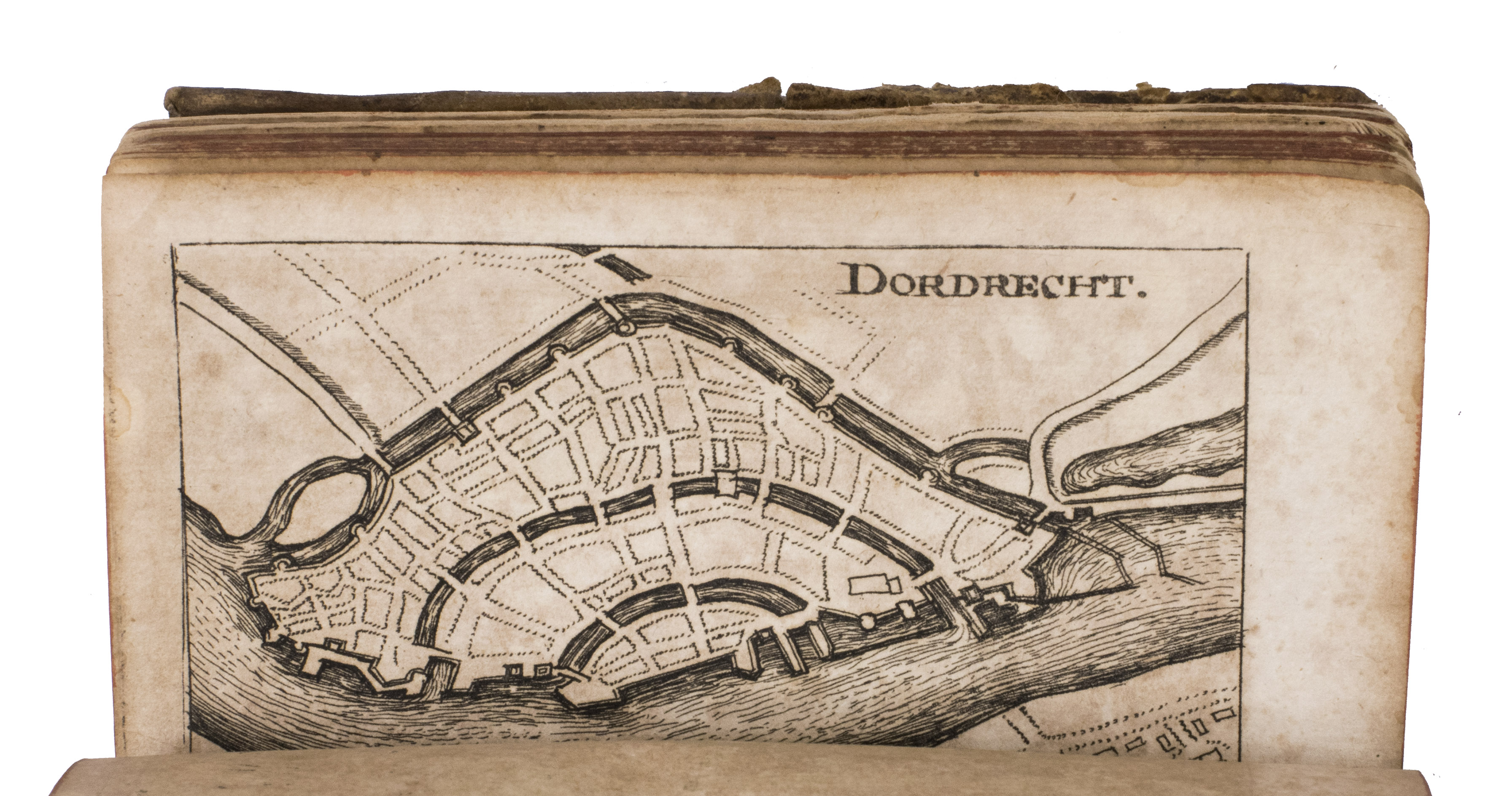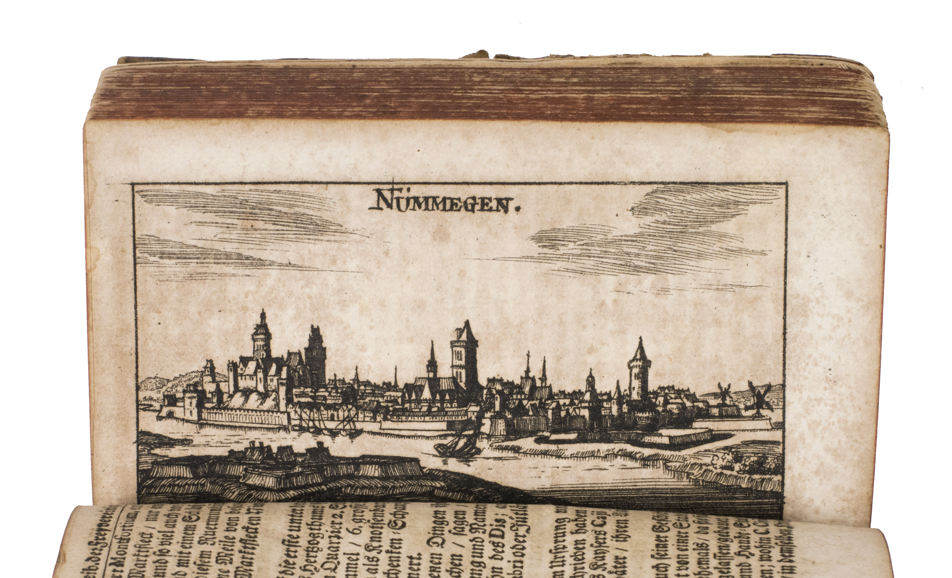 Frankfurt am Main and Leipzig, Christoph Riegel, 1691. 12mo. With a folding engraved frontispiece, 61 full-page engraved plans, and 59 full-page engraved views of the cities and fortifications of the Low Countries. Contemporary vellum with an oval supralibros mounted in the centre of both boards, red edges, leather closing ties. [8], 1078, [8] pp. + 120 engravings.