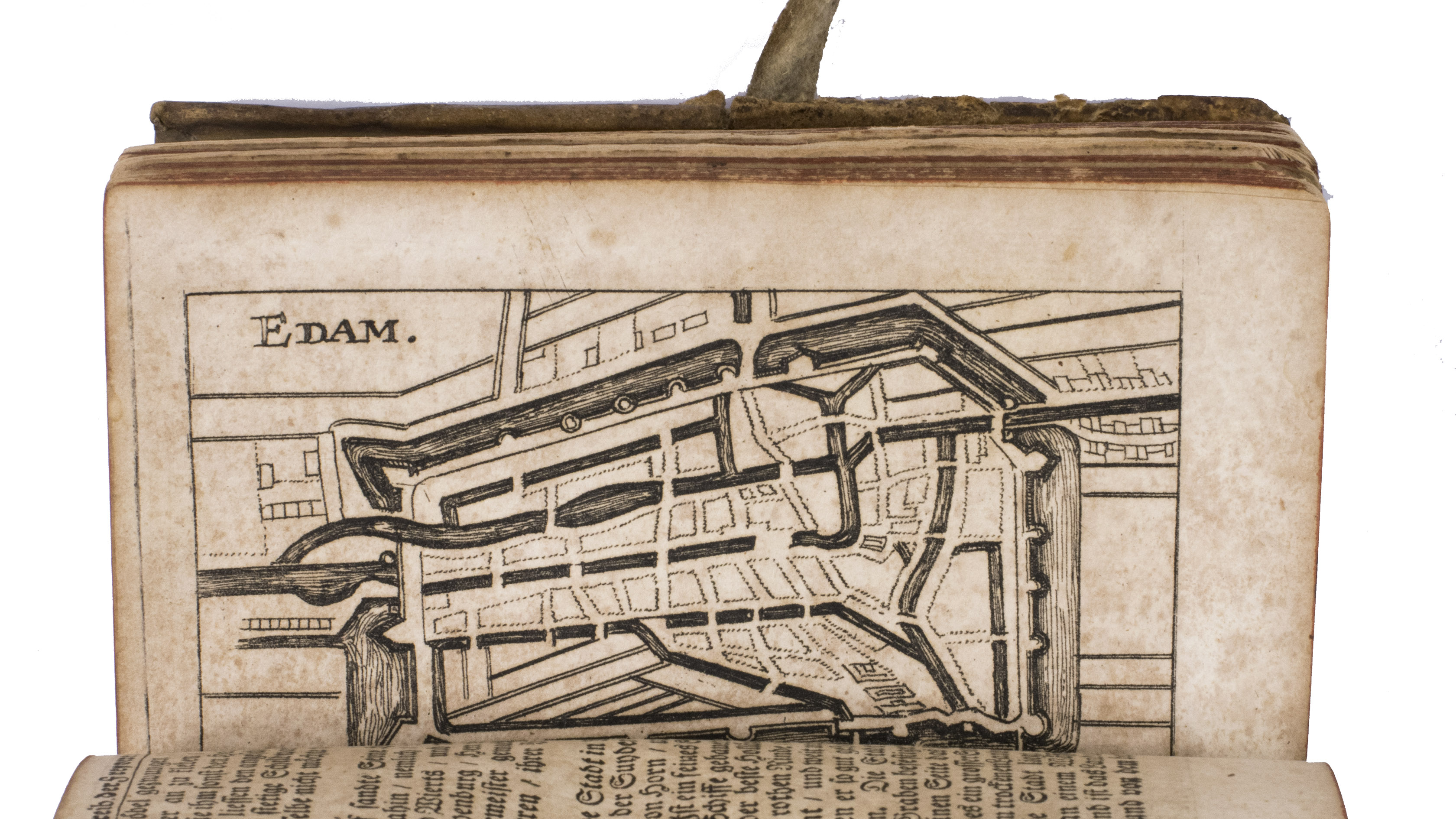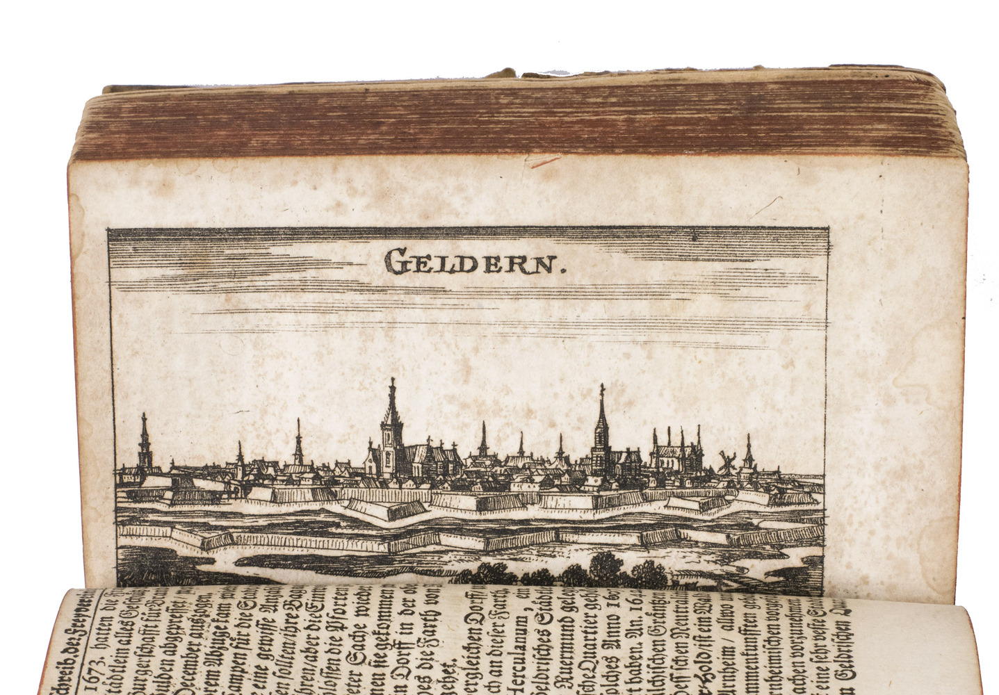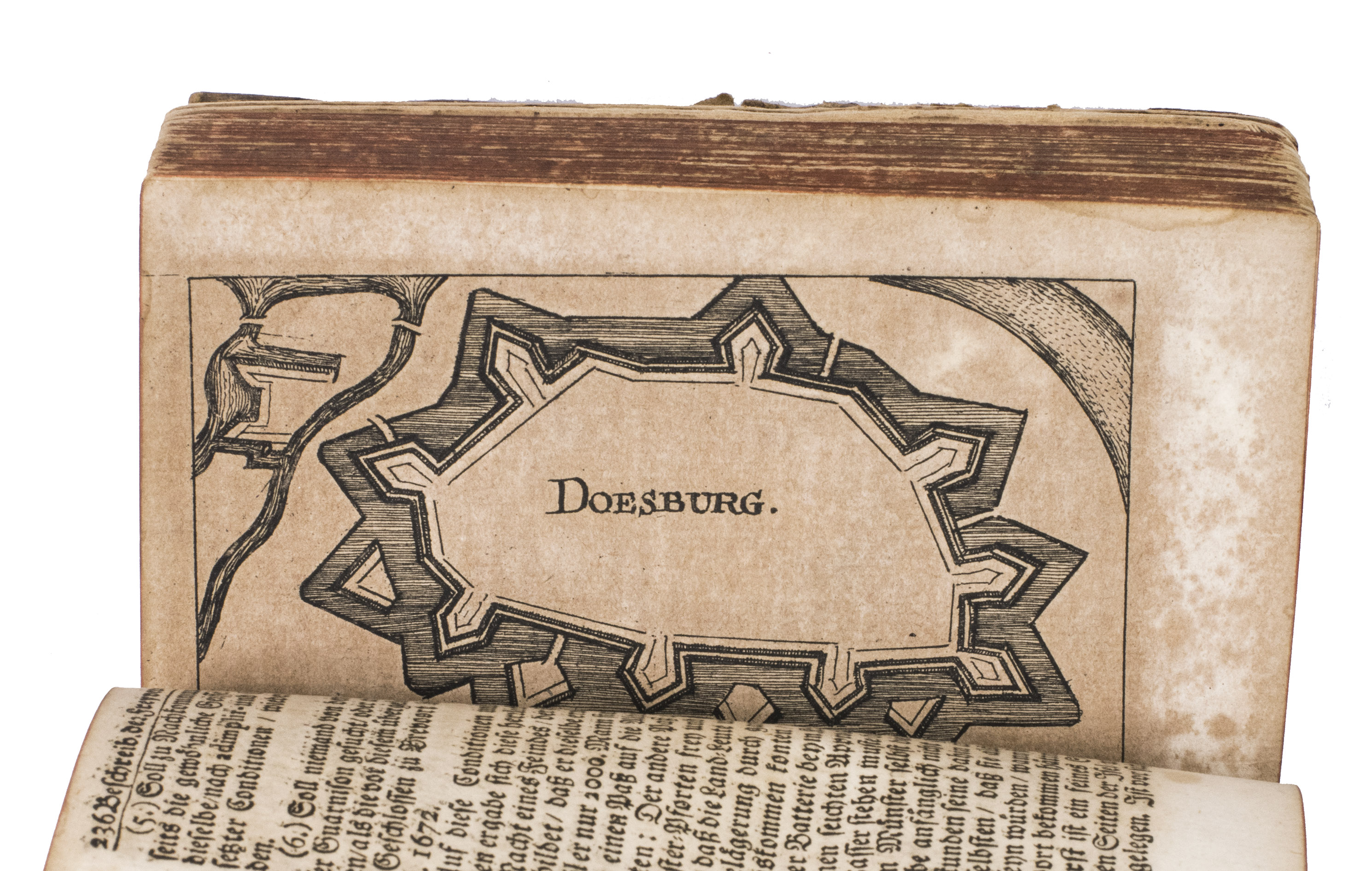Frankfurt am Main and Leipzig, Christoph Riegel, 1691. 12mo. With a folding engraved frontispiece, 61 full-page engraved plans, and 59 full-page engraved views of the cities and fortifications of the Low Countries. Contemporary vellum with an oval supralibros mounted in the centre of both boards, red edges, leather closing ties. [8], 1078, [8] pp. + 120 engravings.