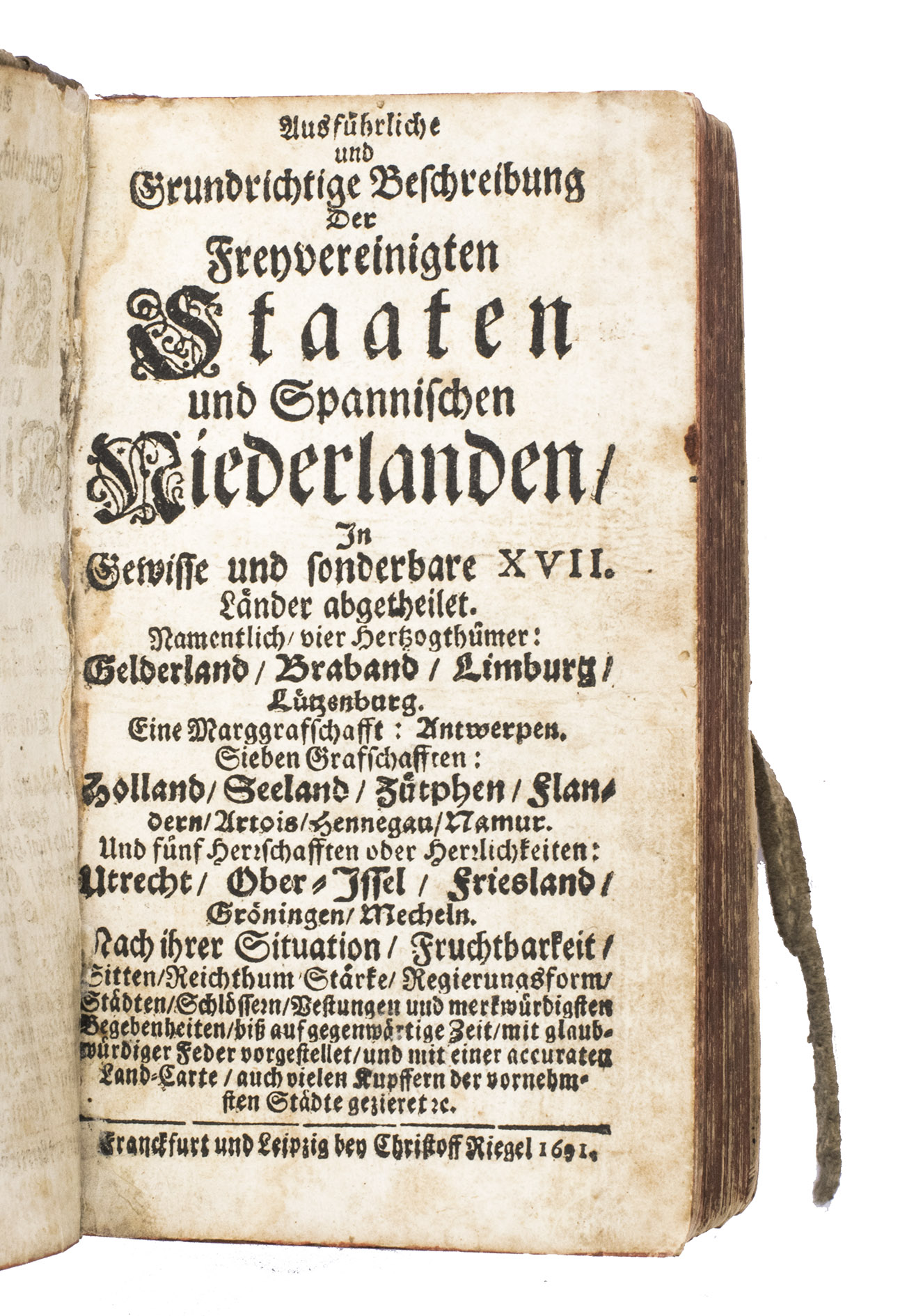 First and only edition of a German description and history of the seventeen provinces of the former Spanish Netherlands, consisting of the four Duchies (Brabant, Guelders, Limburg, and Luxembourg), the five Lordships (Groningen, Friesland, Overijssel, Utrecht, and Mechelen), the seven Counties (Holland, Zeeland, Zutphen, Flanders, Artois, Hainaut, and Namur), and the Margraviate of Antwerp.