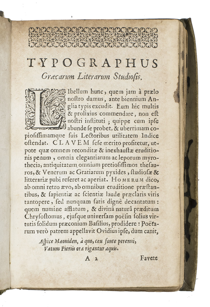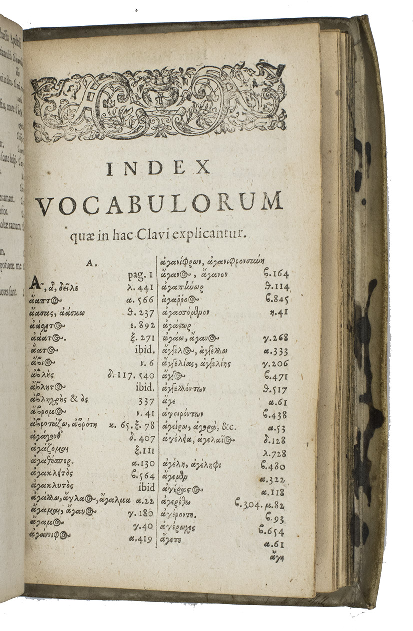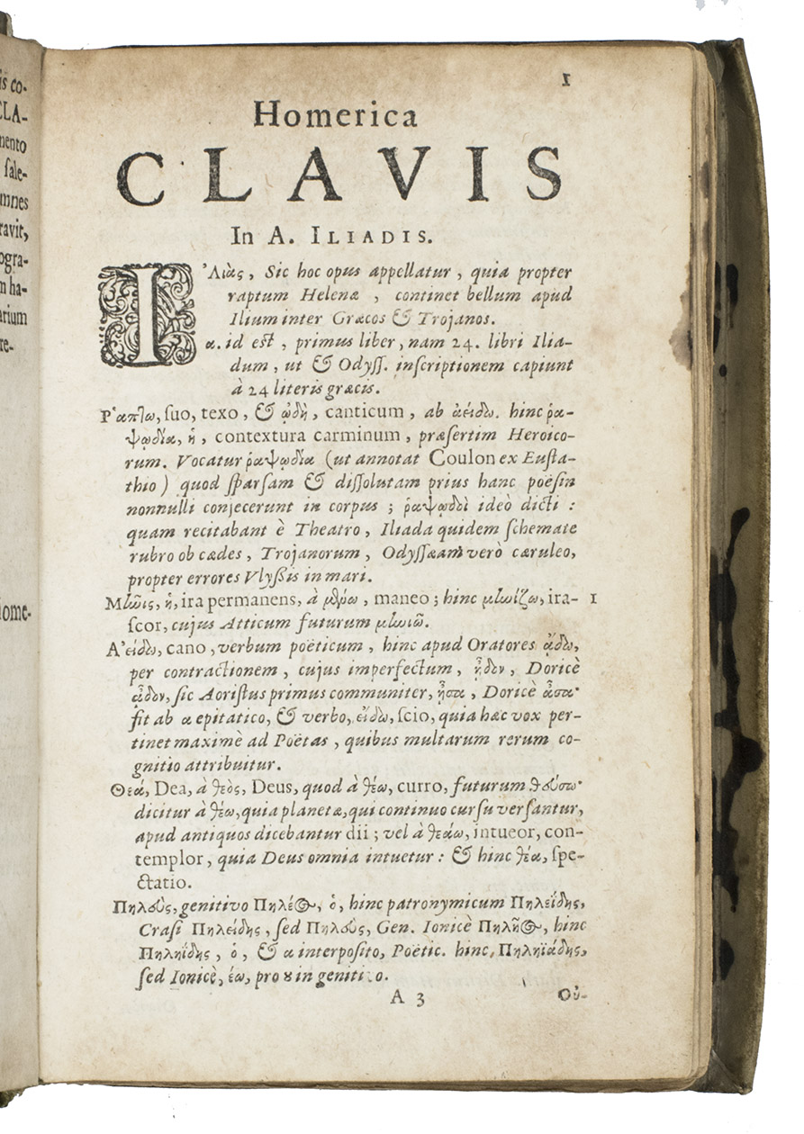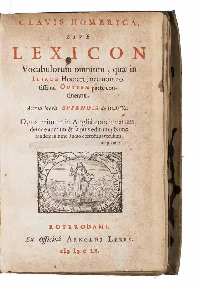 Rare second Dutch edition of this Greek-Latin glossary translating almost word for word the lines of the 24 books (á-ù) of the Ilias. The Clavis (Key) was first published in England in 1636 (with a second edition in 1638 and a third in 1647). The well-known Rotterdam printer Arnold Leers (the father of Reinier) reprinted this 1695 edition page-for-page in 1662 and 1673. Many editions followed until far into the 19th century. The Clavis is followed by some grammatical observations based on Homers poems.