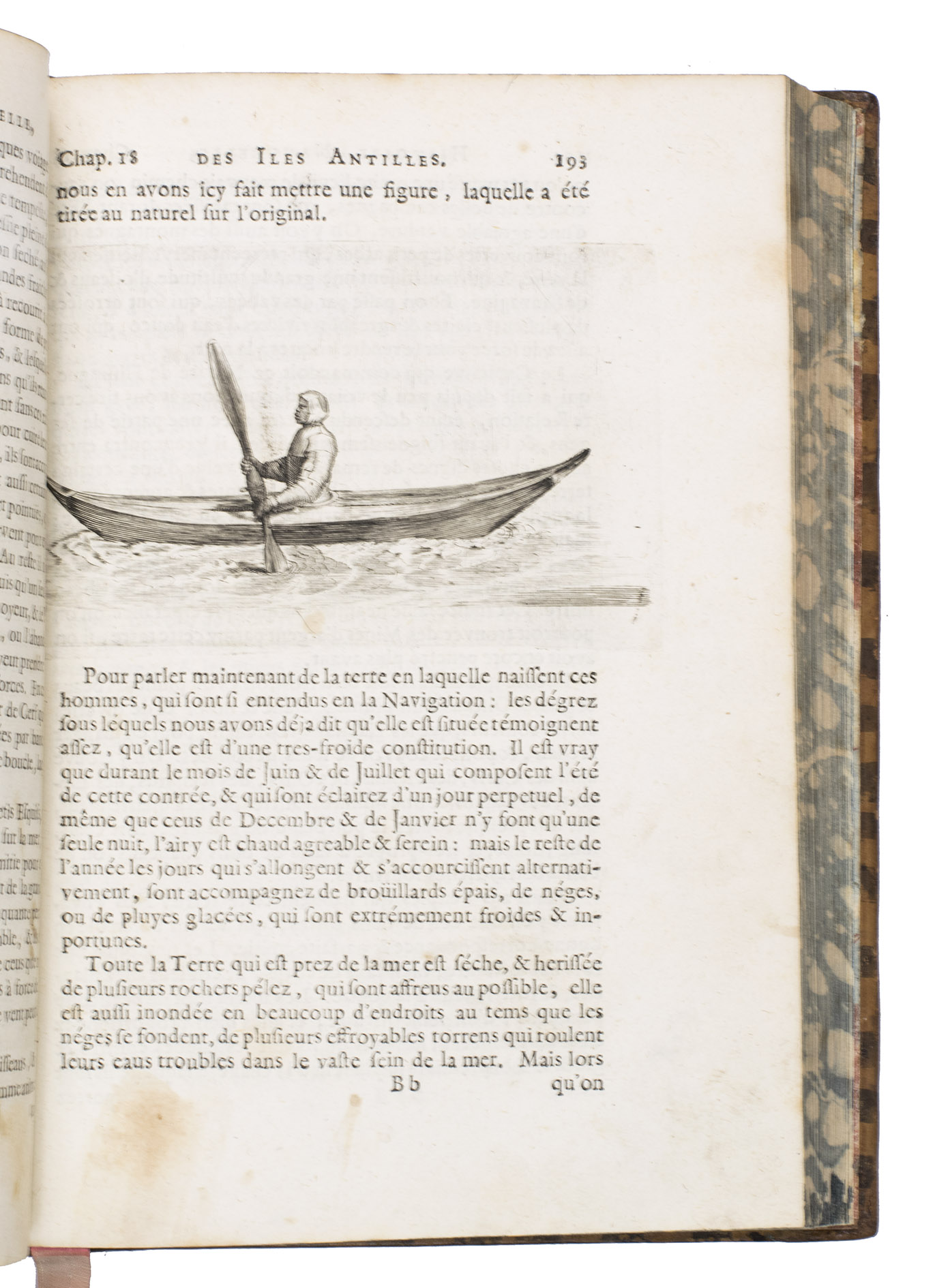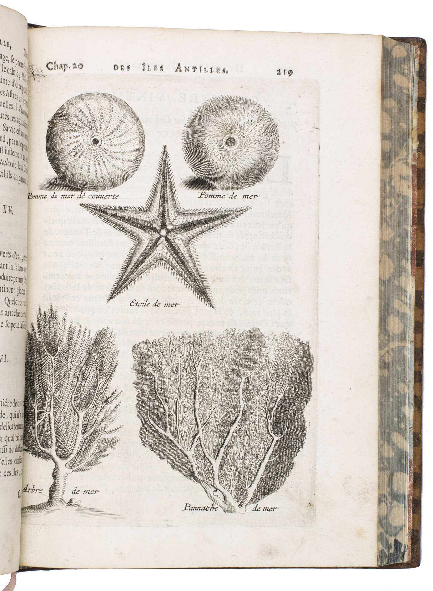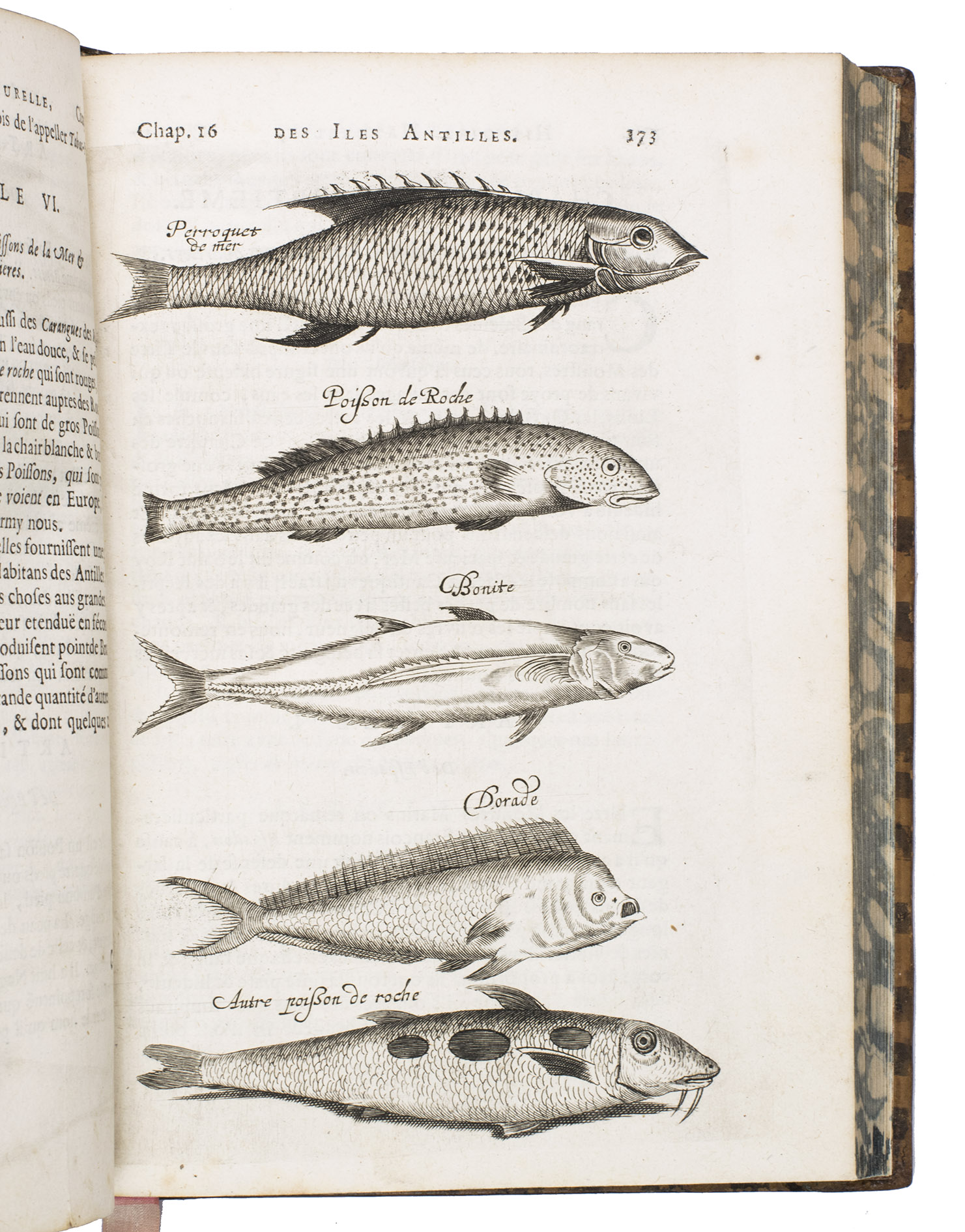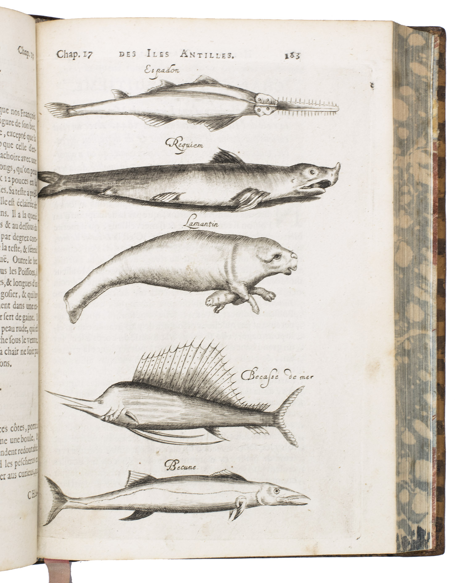 Rotterdam, Arnout Leers, 1658. 2 parts in 1 volume. 4to. With an engraved title-page, a woodcut printer's device on the typographical title-page, a full-page portrait of Amproux, 43 engraved plates in the text of all kinds of plants, trees, animals and costumes from the Antilles. Further with a divisional title-page for the second part, and woodcut decorated initials, head- and tailpieces throughout. Contemporary gold-tooled marbled calf, with a red morocco title-label lettered in gold, gold-tooled board edges, marbled edges, marbled endpapers, and a bright pink reading ribbon. [1], [1 blank], [12], 527, [12], [1 blank] pp.