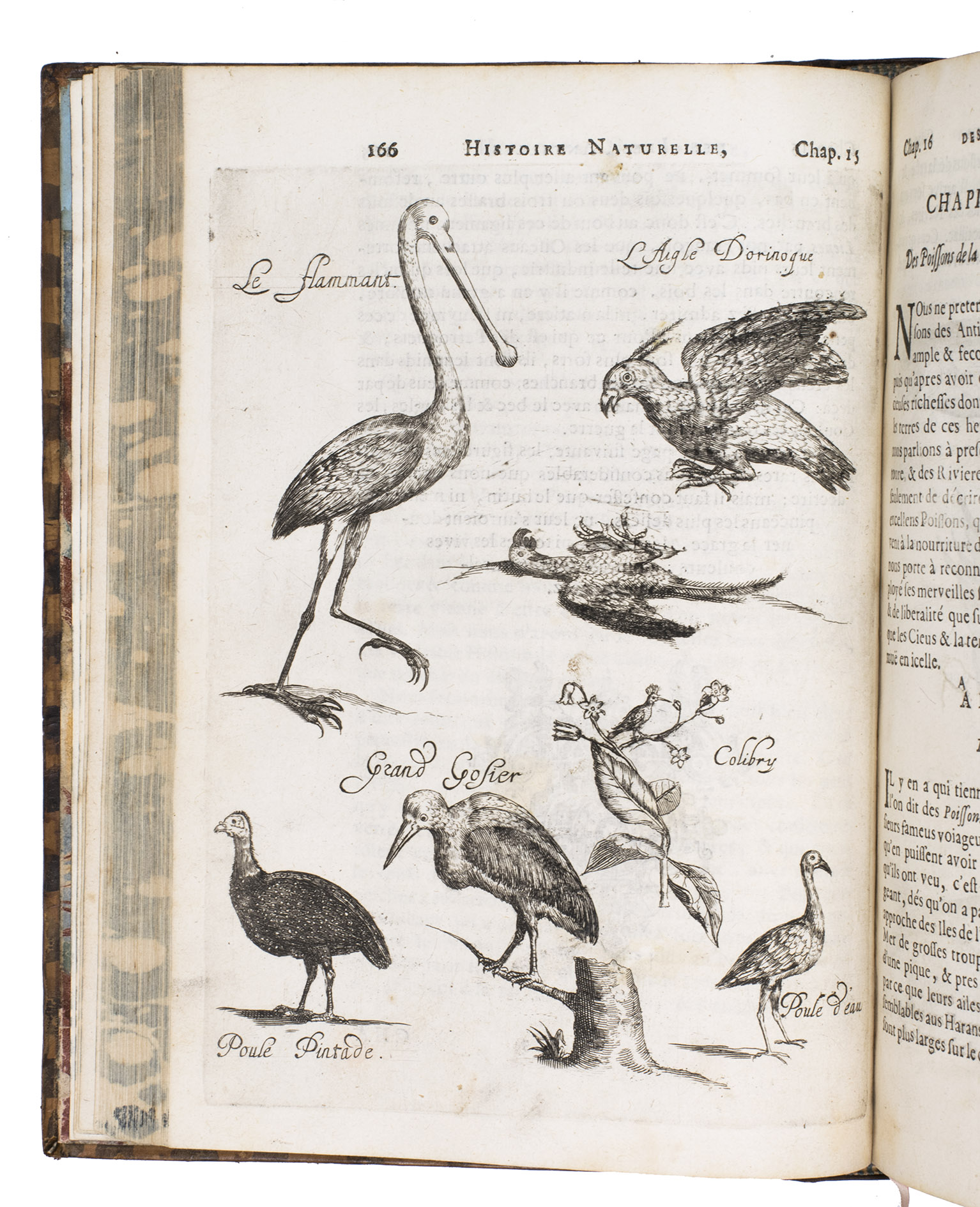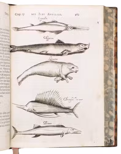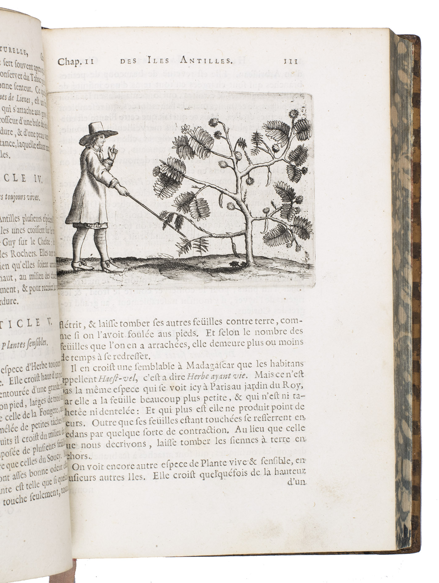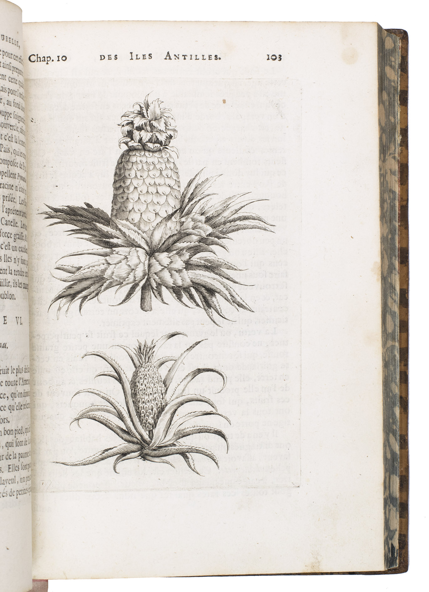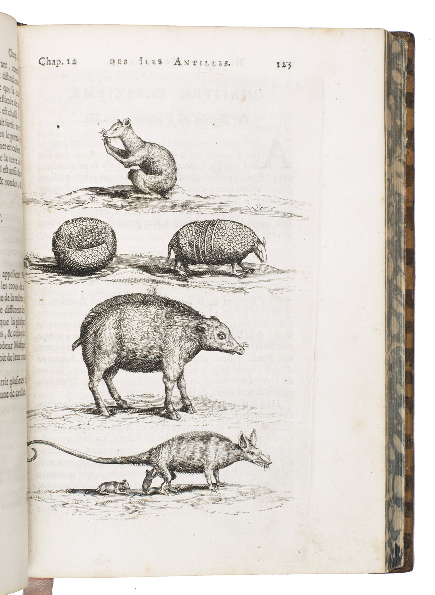 Rotterdam, Arnout Leers, 1658. 2 parts in 1 volume. 4to. With an engraved title-page, a woodcut printer's device on the typographical title-page, a full-page portrait of Amproux, 43 engraved plates in the text of all kinds of plants, trees, animals and costumes from the Antilles. Further with a divisional title-page for the second part, and woodcut decorated initials, head- and tailpieces throughout. Contemporary gold-tooled marbled calf, with a red morocco title-label lettered in gold, gold-tooled board edges, marbled edges, marbled endpapers, and a bright pink reading ribbon. [1], [1 blank], [12], 527, [12], [1 blank] pp.