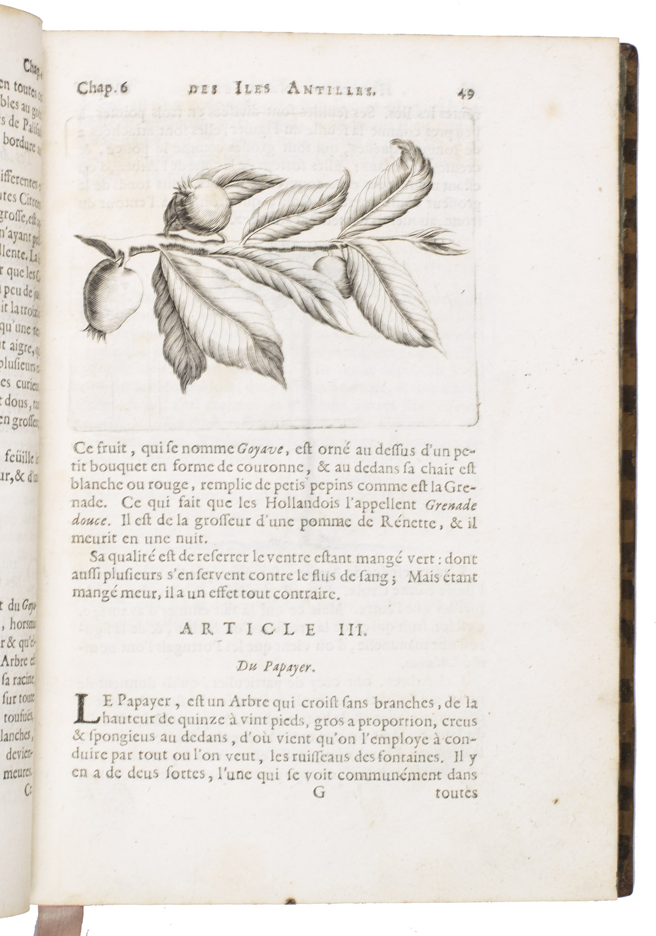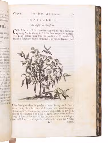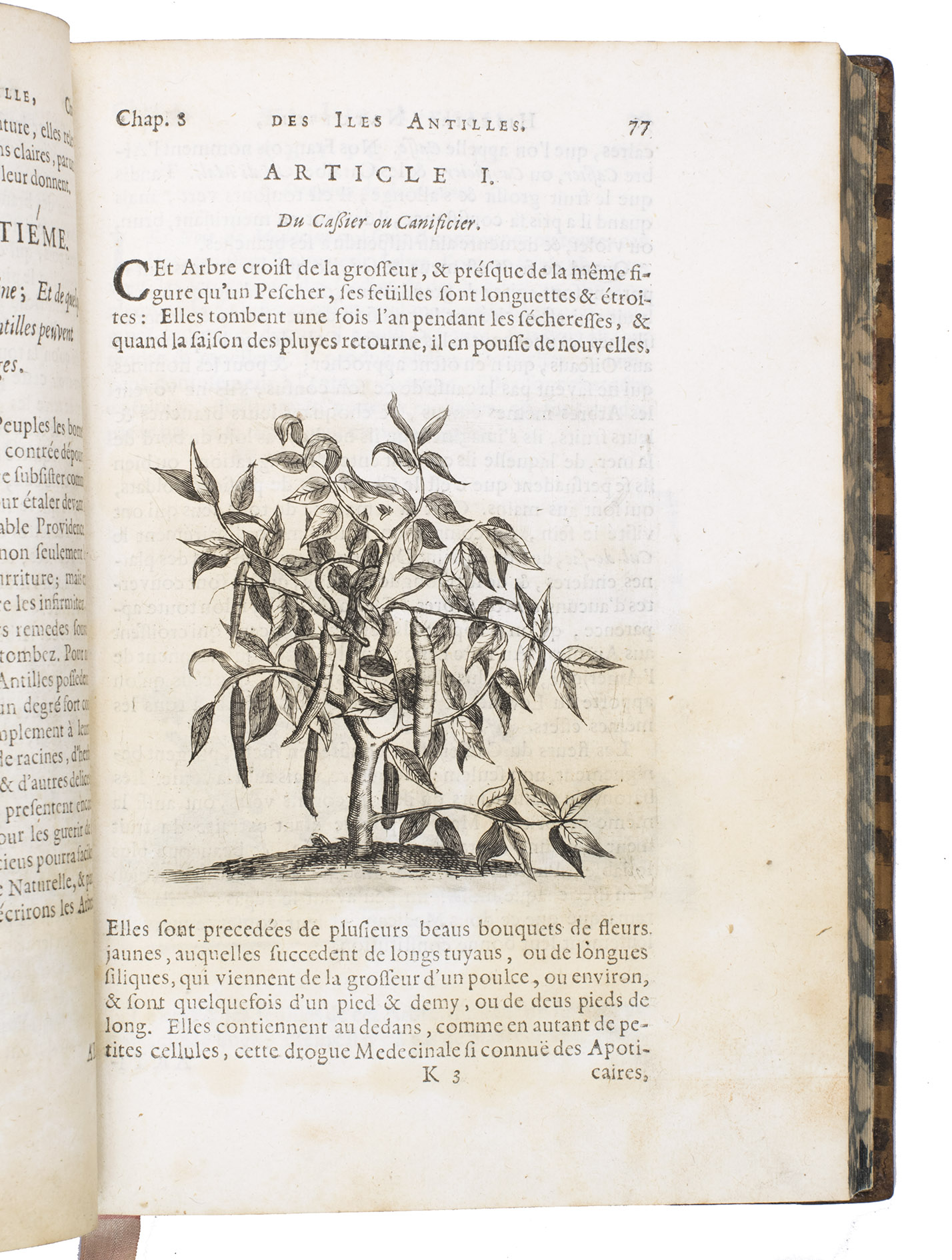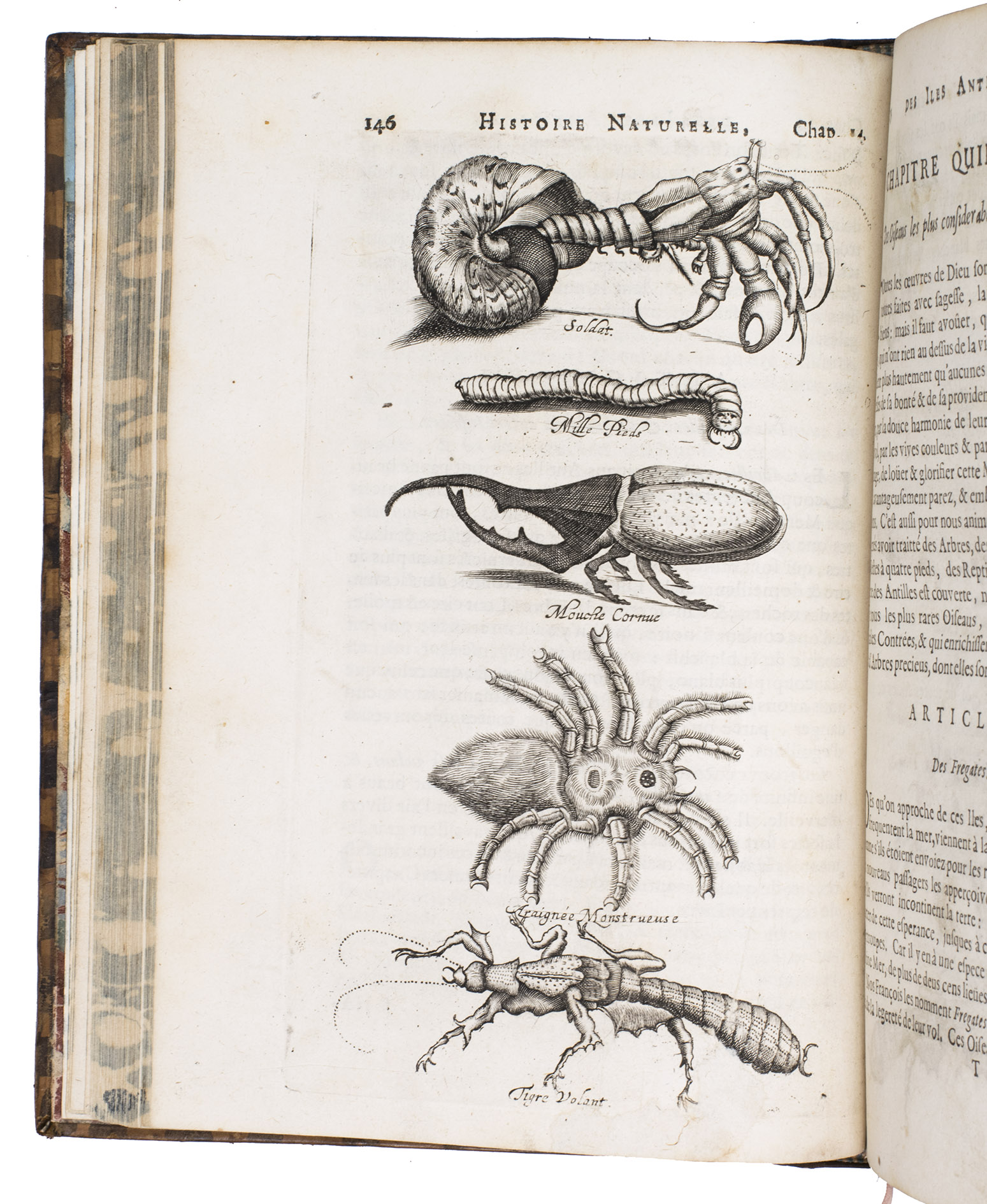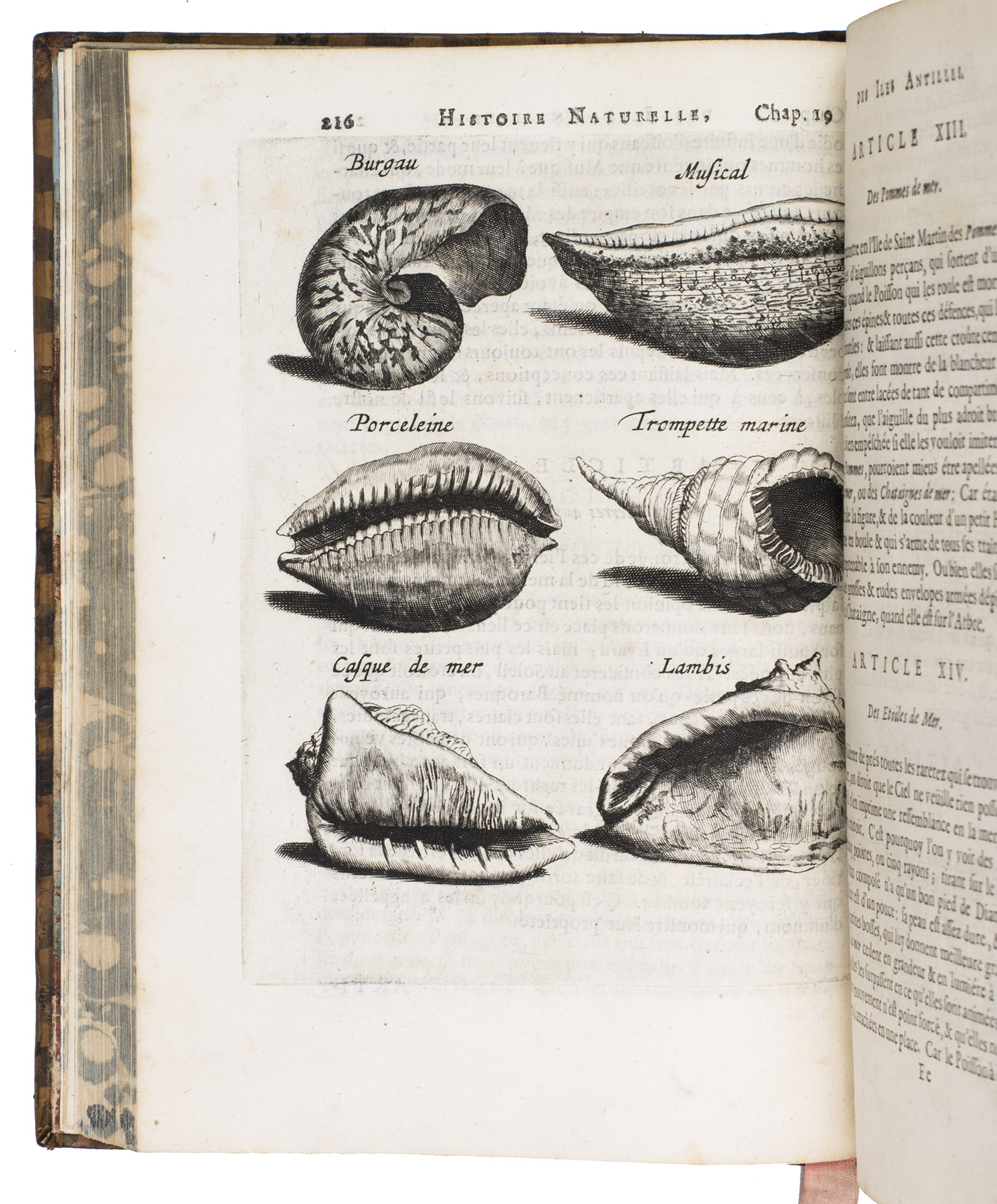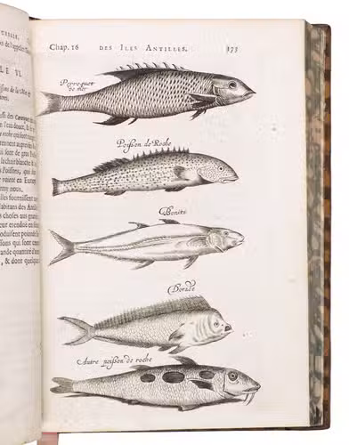 Rotterdam, Arnout Leers, 1658. 2 parts in 1 volume. 4to. With an engraved title-page, a woodcut printer's device on the typographical title-page, a full-page portrait of Amproux, 43 engraved plates in the text of all kinds of plants, trees, animals and costumes from the Antilles. Further with a divisional title-page for the second part, and woodcut decorated initials, head- and tailpieces throughout. Contemporary gold-tooled marbled calf, with a red morocco title-label lettered in gold, gold-tooled board edges, marbled edges, marbled endpapers, and a bright pink reading ribbon. [1], [1 blank], [12], 527, [12], [1 blank] pp.